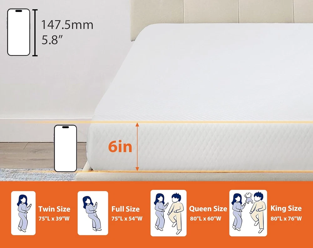 Menu Other Items Feedbacks About Us Contact Us Add To Favorites Full Size Mattress, 5/6/8/10/12 Inch Cooling Gel Bamboo Charcoal Infused Mattress Full Mattress, Certipur-Us Certified Memory Foam Mattress, Fiberglass Free Full Mattress in a Box, (Full, 6 Inch) 🛏︎【BAMBOO CHARCOAL INFUSED MATTRESS】 Using innovative technology, infusing the memory foam with bamboo charcoal to effectively disperse body heat and humidity for the optimal sleeping temperature. In addition, the full size mattress with bamboo charcoal excels in adsorbing odors to provide a fresh sleeping environment. This gel infused full mattress will ensure that you can sleep cool and comfortable all night. 🛏︎【GEL MEMORY FOAM CONSTRUCTION】 The bamboo charcoal mattress has a moderate hardness and can evenly support various parts of the body, relieve stress, and conform to the sleep habits of the vast majority of people. On top is a gel-infused memory foam that keeps you cool. The second layer of the memory foam mattress is high-density support foam, which provides support more in line with the body curve, neither too firm nor too soft. 🛏︎【SAFETY AND HEALTH FIRST】 The bamboo charcoal foam mattress is certified by CertiPUR-US, have undergone independent safety assessments, comply with all applicable safety standards for mattresses, and is free of any harmful substances. The full size mattress in a box is surrounded by a fiberglass-free inner cover. Healthy and eco-friendly, you and your family sleep with no concern. Perfect choice for your sweet sleep. 🛏︎【EASY TO CLEAN】 The mattress in a box comes with a washable cover, the full size memory foam mattress features a zipper design in the middle, making it easy to regularly remove the fabric cover for cleaning. The cover of the full bed mattresses is woven from artificial textile fabric, which is soft and skin friendly, and very breathable. Paired with suitable bed sheets for a more perfect use, creating a better sleeping environment. 🛏︎【STRICT PACKING FOR EASY USE】 No need to struggle with how to drag the full size mattress up the stairs. The full mattress is compressed and rolled up in a box, so you can easily carry it through narrow hallways or staircases. When you need to use it, just open the box and unwrap the foam mattress.The memory foam mattress will return to its original shape within 12 hours. The expansion time may vary depending on the surrounding environment. Product Description Item Specification Item model number memory foam mattress Style 6 IN Special Feature Cooling Gel Bamboo Charcoal Infused Cover Material Bamboo Color White Country of Origin China Number of Layers 2 Top Style gel_top Item Firmness Description Medium Age Range (Description) ALL AGE GROUPS Fill Material BAMBOO CHARCOAL GEL MEMORY FOAM, SUPPORTING FOAM Model Name Full Size Mattress Size Full Is Discontinued By Manufacturer No Product Dimensions 75"L x 54"W x 6"Th Dimensions Shipping Returns Additional Info Product Dimensions: 54.0 "th x 75.0 "th x 6.0 "th. Fast shipping is very important for us. Our standard shipping service is FREE. Your order will be shipped within 1-3 business days upon full payment received. Most items are delivered within 3-5 business days, however, please allow 3-10 business days. We are shipping only to USA. We only ship to the confirmed Paypal address. We reserve the right to cancel any order for any reason at any time. We are not responsible for undeliverable addresses. We offer a 30 day return policy from checkout winning date. Your satisfaction is guaranteed! If for any reason you are unhappy with your item, just return it within 30 days for a full refund, minus shipping cost. Please contact us prior to initiating a return so that we can issue you a refund authorization. Items defective upon receipt must be packaged in their retail packaging as if new and returned with a detailed description of the problem. Return shipping fees are not refundable. We reserve the right to decline any returns if the above guidelines are not followed. All of our items, unless otherwise stated, will only run on 120 volts. Please check to make sure your country complies with these specifications. If you have a problem or question regarding your transaction please contact us before leaving any type of feedback. We will work with you to resolve any problem you may have.