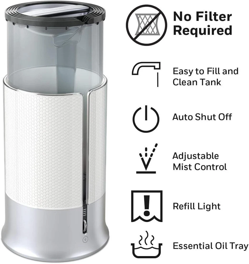 COOL MIST COMFORT: This filter free, ultra quiet humidifier provides cool mist comfort with style. It features adjustable mist output control & an illuminated water window with adjustable tank light AROMATHERAPY & EASY-FILL DESIGN: Add a few drops of your favorite oils to the Essential Oil Tray for added aromatherapy comfort. A 1.25 gallon tank features a wide opening that's easy to fill & clean HONEYWELL HUMIDIFIERS: Dry air can irritate health issues & humidity levels in your home between 40-60% can make the air feel warmer & improve breathing comfort, sleeping, nasal congestion & dry skin HUMIDIFIERS FOR BABIES, CHILDREN, ADULTS: Many find that a humidifier for the home, bedroom or nursery is an essential part of a good nights sleep when the air is dry, in allergy season, or when sick Product information Special Feature Cool Mist Comfort Color White Operation Mode Ultrasonic Product Dimensions 8.8"D x 8.8"W x 13.2"H Item Weight 6.6 Pounds Room Type Bedroom, Nursery Model Name Designer Series Cool Mist Humidifier Included Components 1 Humidifier Control Method Touch Shape Round UPC 328785001723 Global Trade Identification Number 00328785001723 Item Weight 6.6 pounds Country of Origin China Item model number HUL430W