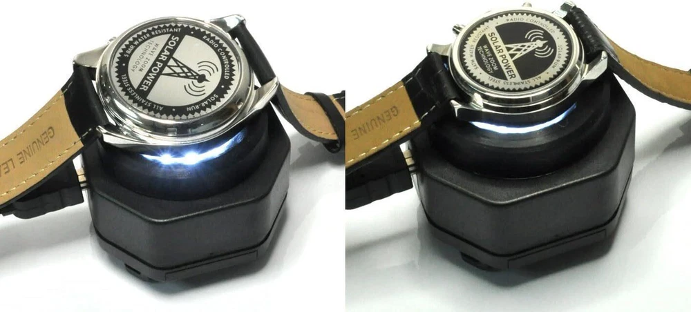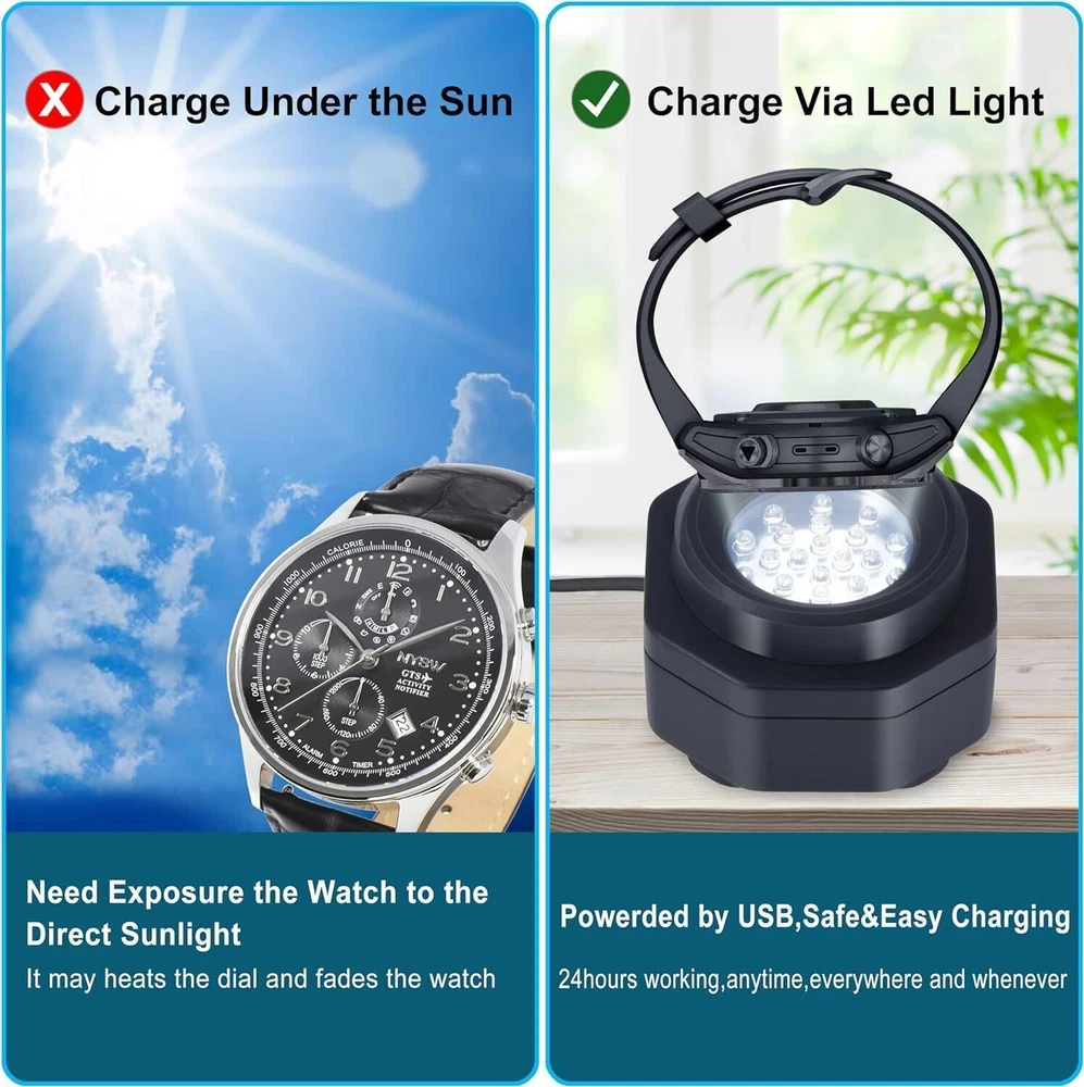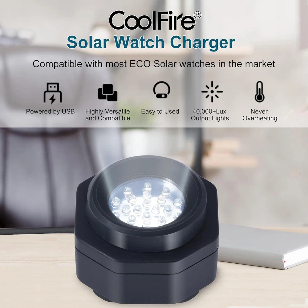 UV Free Solar Watch Fast Charger for All Eco Solar Watches for Men, Reloj Hombre Portable Battery Charger, for All Kinds of Sophisticated Eco Solar Watches (Black) Premium Solar Watch Charger: CoolFire's original solar watch charger, trusted by over 300,000 satisfied customers, with a 4.5-star rating on Amazon and Rakuten. Efficient and Safe Charging: Featuring multiple UV-free LEDs that evenly distribute 40,000 LUX light, ensuring optimal charging performance without fading, overheating, or damaging your sophisticated solar watch. Versatile Compatibility: Compatible with a wide range of solar watch brands and models, this charger can power up your solar watch quickly and safely. Convenient Accessories: Includes a USB cable for connecting to various power sources and two soft rubber caps to fit any men's or women's solar watch size. Connectivity Technology USB Connector Type Mini USB Compatible Devices Solar Watches Compatible Phone Models For All Kinds of eco Solar Watches. Included Components Cable, User Manual, Ring, Two soft rubber caps Cable Length 59 Inches Special Feature Fast Charging Color dark gray Input Voltage 5 Volts