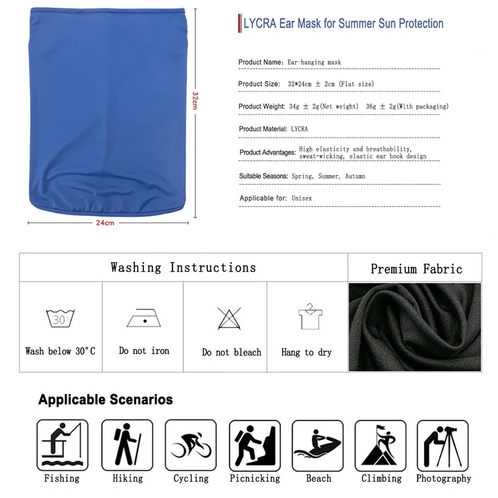 Product Description Features: 1. Size: Front flat dimensions 9.84*13.19 inches (±0.2 inches), highly elastic, suitable for most people. 2. Lightweight and Breathable:Weighs only 33 grams, lightweight and comfortable, no burden. High-quality breathable material provides a refreshing and ventilated wearing experience. 3. Comprehensive Protection: Durable material design effectively withstands wind, dust, and UV rays, providing comprehensive protection for your facial skin. 4. Versatile Wear: Can be used not only as a face mask but also as a neck gaiter, headband, and more, meeting various needs for different occasions. 5. Reusable:Washable by hand or machine, easy to clean and maintain, ensuring long-lasting hygiene. Specification: 100% Brand New and High Quality Product Category: Cycling Mask Material: Polyester Size: 35*26cm Weight: 42g Colour: 7 Color As Pictire Show Applicable Gender: Neutral/Both Men and Women Package Include: 1 * Ear-Hanging Neck Gaiter