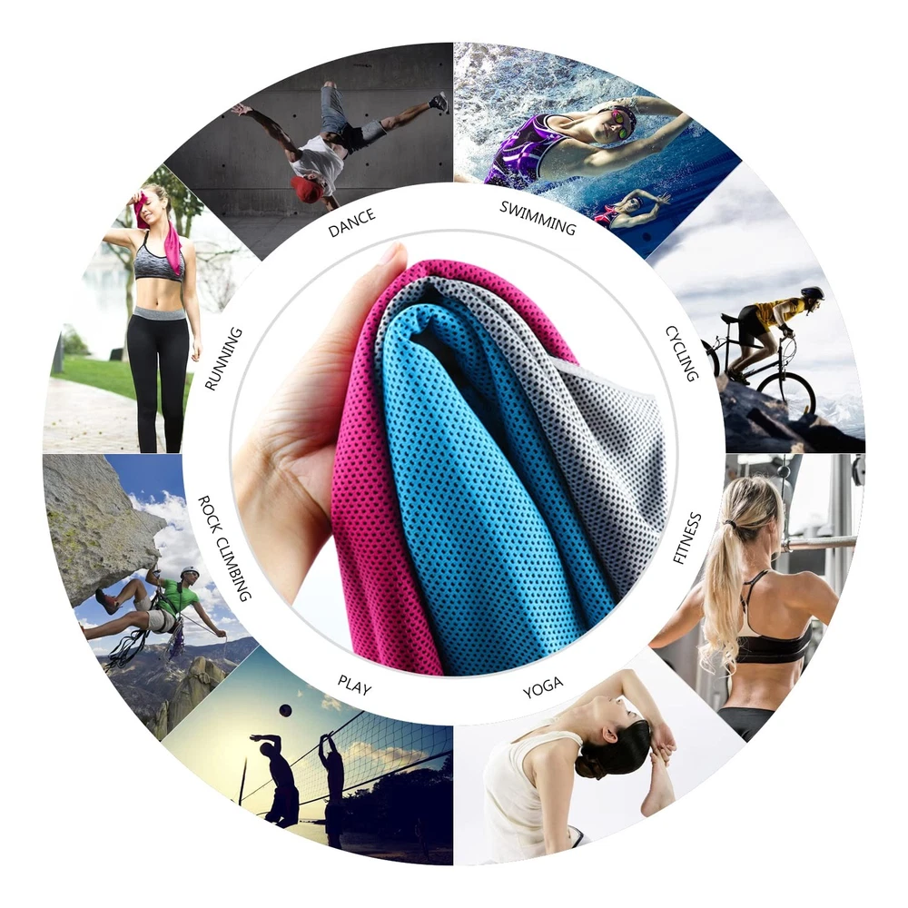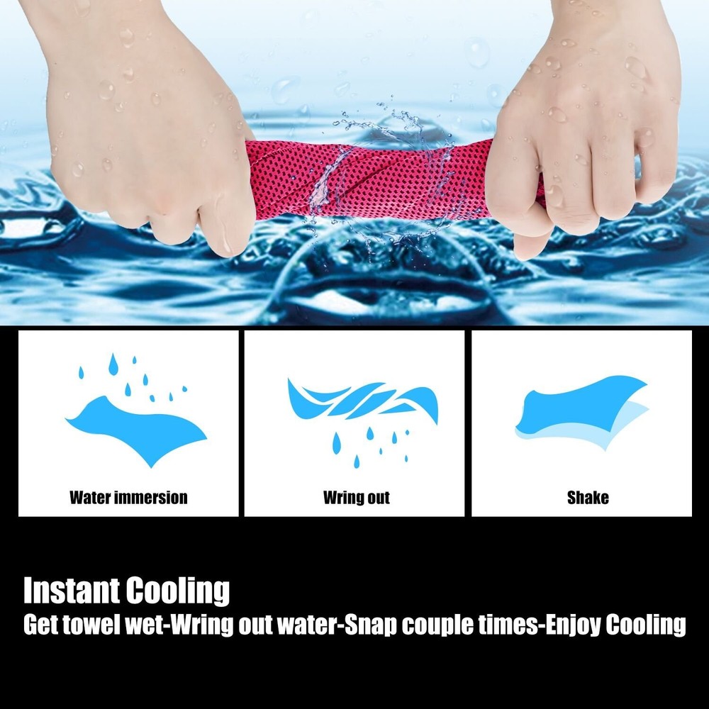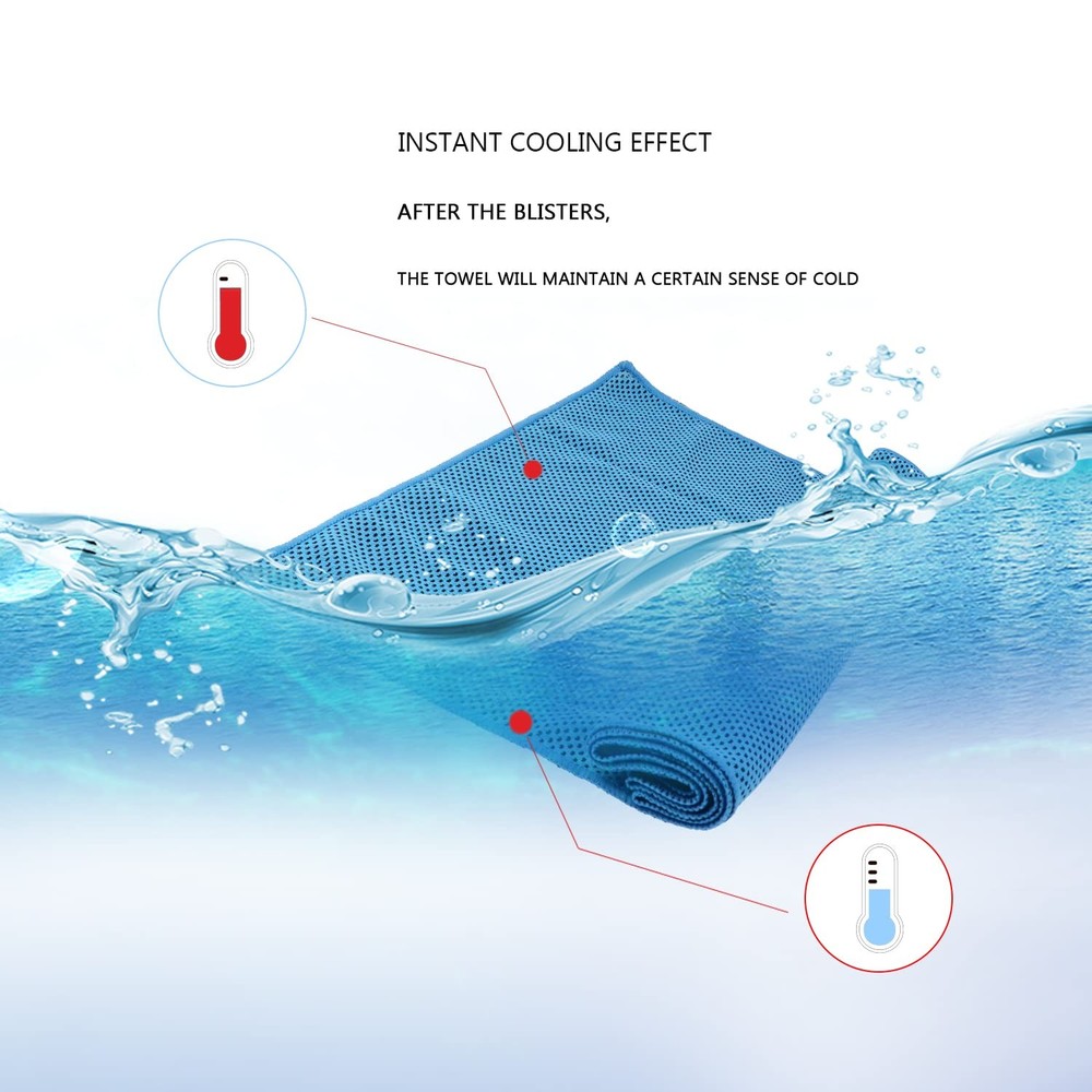 Cooling Towel (Pack of 20, 40"x12") MULTIPURPOSE SPORTS TOWEL: You may use your cooling neck wraps in many different ways! The 40''x12'' size gives you the chance to make it the perfect neck cooler, ice cooling scarf, instant heat relief bandana and cold headband. Whether you are at work, at the beach, at the gym, doing pilates at home or at camping, this cooling towel is the summer essential accessory for you. SAFE AND ECO-FRIENDLY MATERIAL: Unlike scratchy PVA material, our gym towels are made of super-absorbent soft cooling fabric with a breathable mesh structure. Our cooling towels for neck and face feature better evaporative performance, soft feeling and are chemical-free. The unique material and structure will promote evaporation which draws the sweat and heat away from your skin to keep you cool. HOW DOES IT WORK: The unique fiber and structure of sweat towels absorb water and sweat into the towel while speeding up the water evaporating from the towel. It's kind of like an air-conditioner which radiates heat by evaporation, and within seconds you get cold. Perfect summer accessories when contacting the sunshine directly. VERSATILE GIFT: Perfect for outdoor activities, indoor exercise, physical treatment such as fever or headache therapy, heatstroke prevention, sunscreen protection; ideal as a gift for kitchen staff, outdoor workers, athletes, runners, sports fans and moms with babies. CARRYING POUCH & CARABINER CLIP: With the waterproof plastic pouch, it is easy to carry the chilly towel on outdoor sports, golf trip, gym, etc. The clip makes it convenient to attach the cooling towel to the traveling backpack.