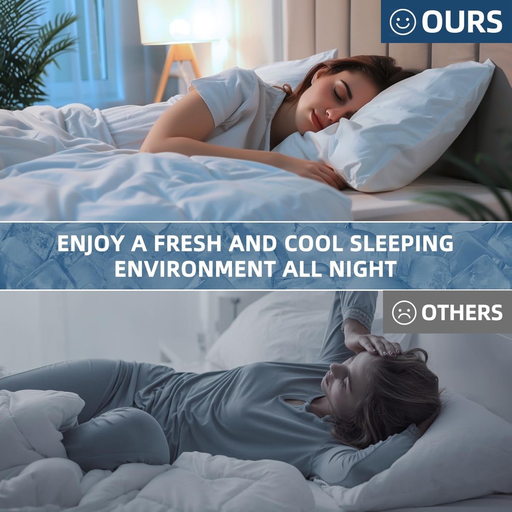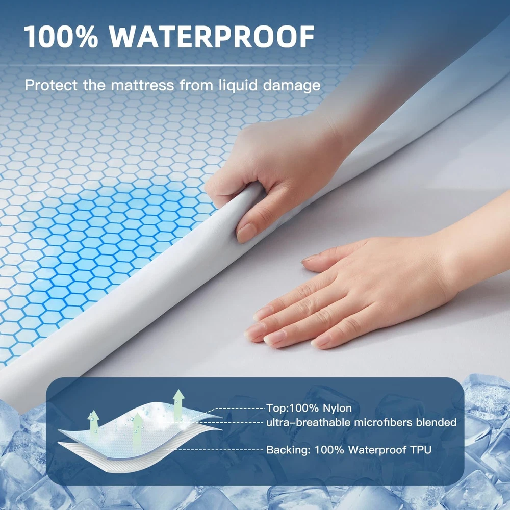 ❄️【Stronger Cooling Fabric】This mattress protector is crafted from 100% premium nylon, featuring advanced cooling technology that delivers a superior cool sensation exceeding viscose made from bamboo, combined with ultra-breathable microfibers for ultimate comfort. When used in air-conditioned rooms, it delivers an intensified cooling sensation, keeping you comfortably fresh and cool throughout the night ☔【100% Waterproof TPU Backing】: We use professional TPU waterproof backing, which is thicker than others and does not contain vinyl or polyvinyl chloride. Protects your pricey mattress against sweat, urine and other fluid spills with its exclusive membrane layer. The mattress cover will protect your mattress from damage. No need to worry about tears in the eyes or blocked nose 🛌【8"-21'' Deep Stretchable Pockets】: The cooling mattress protector features a sturdy elastic skirt and 360° full surround design, ensure fitted bed sheet perfect fit each corner of mattress, provides full protection for the top and sides of the mattress. No matter how you move on the bed,this mattress cover will stay in place all the night. And the mattress protector is easy to install and remove, fit up to 8"-21" mattresses 🤝【Best 】Strive to provide the best , If you are not satisfied with the product after receiving it and have any problems within 100 days of use, please feel free to . Our personnel will reply to you within 24 hours to provide you with the most satisfactory solution 💦【Easy Care】: The mattress protector is machine washable and can be dried at low temperatures. Please wash at water temperature below 30 ℃. Follow specific wash care instructions on the label. After washing 100 times, it can still maintain its cool touch and waterproof performance. Use mild detergent and do not iron, dry clean or bleach