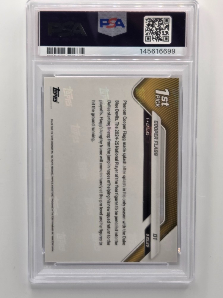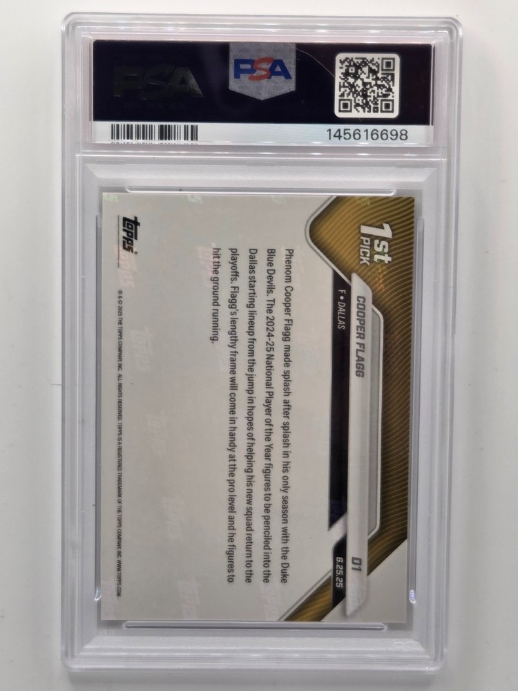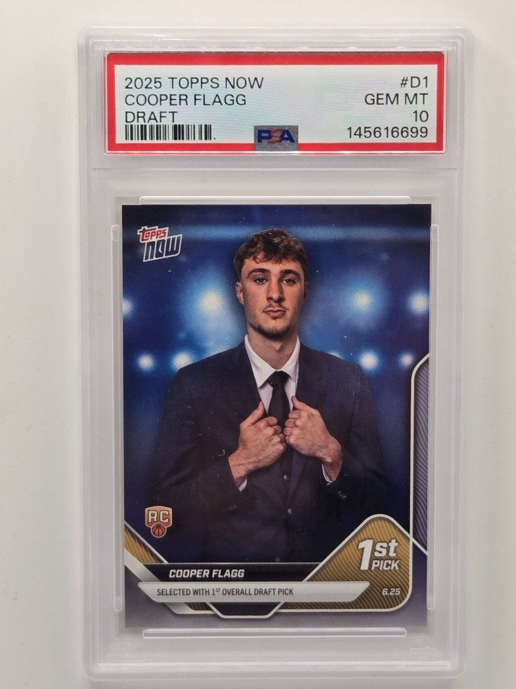 The Cooper Flagg 2025 Topps NOW Basketball Card D1 is a highly sought-after rookie card featuring the talented basketball player from the Duke Blue Devils and later the Dallas Mavericks. This original card, manufactured by Topps, is part of the 2025-26 Topps set and is a valuable collectible for basketball fans. With a standard size and made of durable card stock, this PSA 10 graded card is a prized addition to any sports trading card collection, showcasing the excitement of draft night in the NBA.