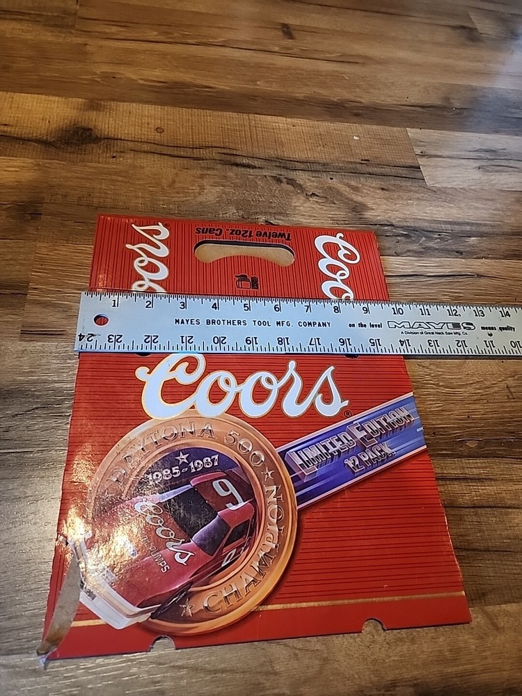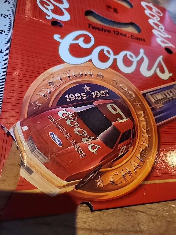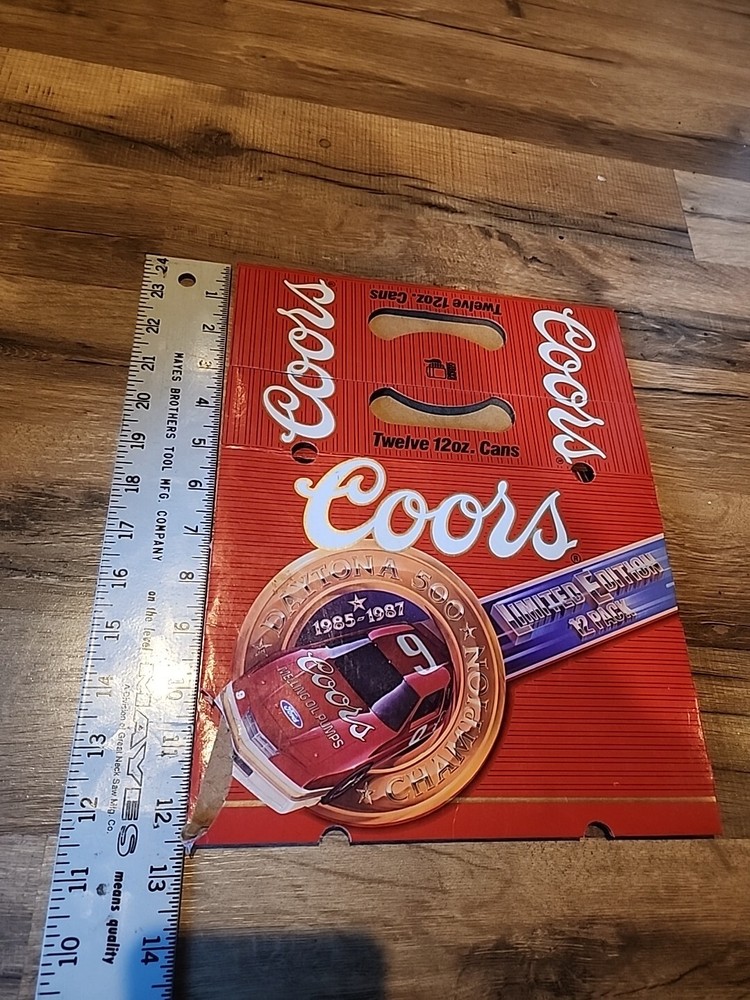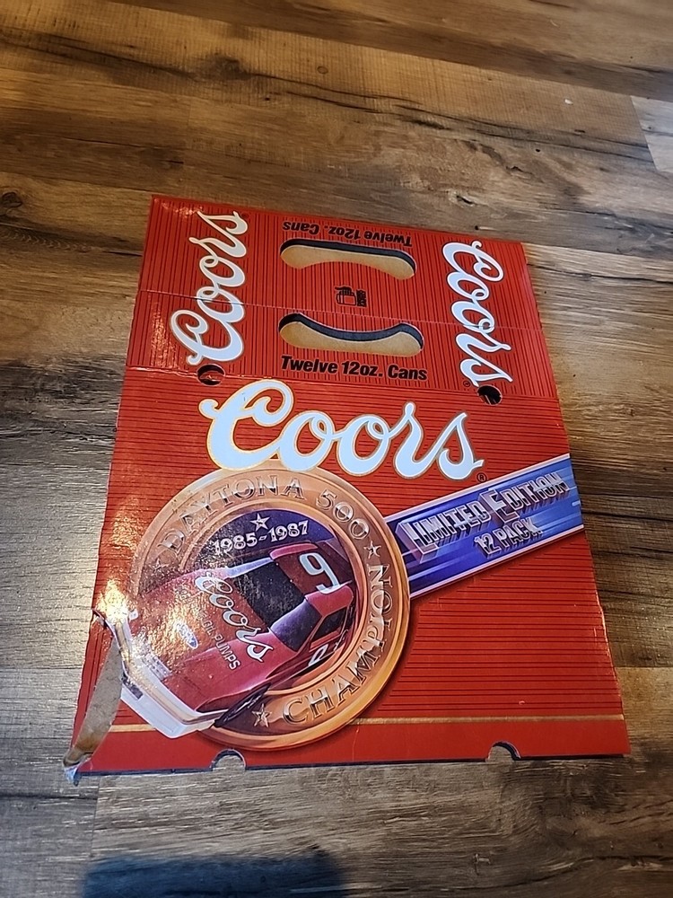 awesome vintage Coors beer 12pack empty. limited edition Daytona 500 Chamion 1985-1987 Bill Elliot #9 Nascar. in amazing condition! see photos for complete condition. measures 10 in wide x 12 1/2 in long when folded flat. thanks for looking!