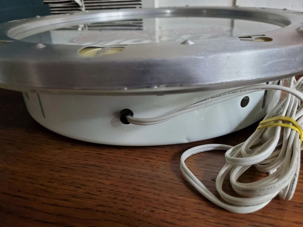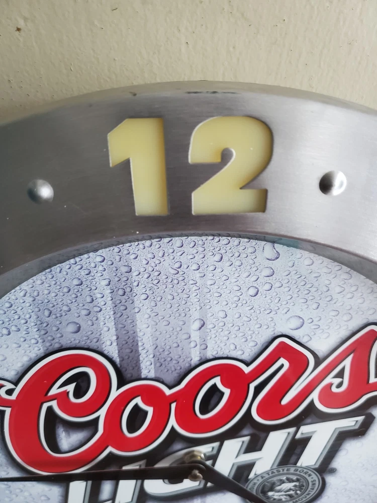 Coor, Light Wall Hanging Battery Operated Lighted Clock, approximately 15.75" wide, 3.25" tall, has a few dents, scratches & missing paint, requires 1 AA battery not included, as pictured no returns. Shipped USPS