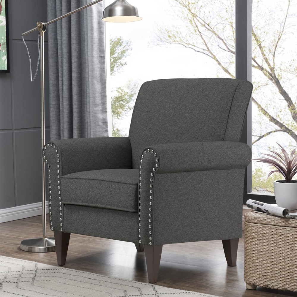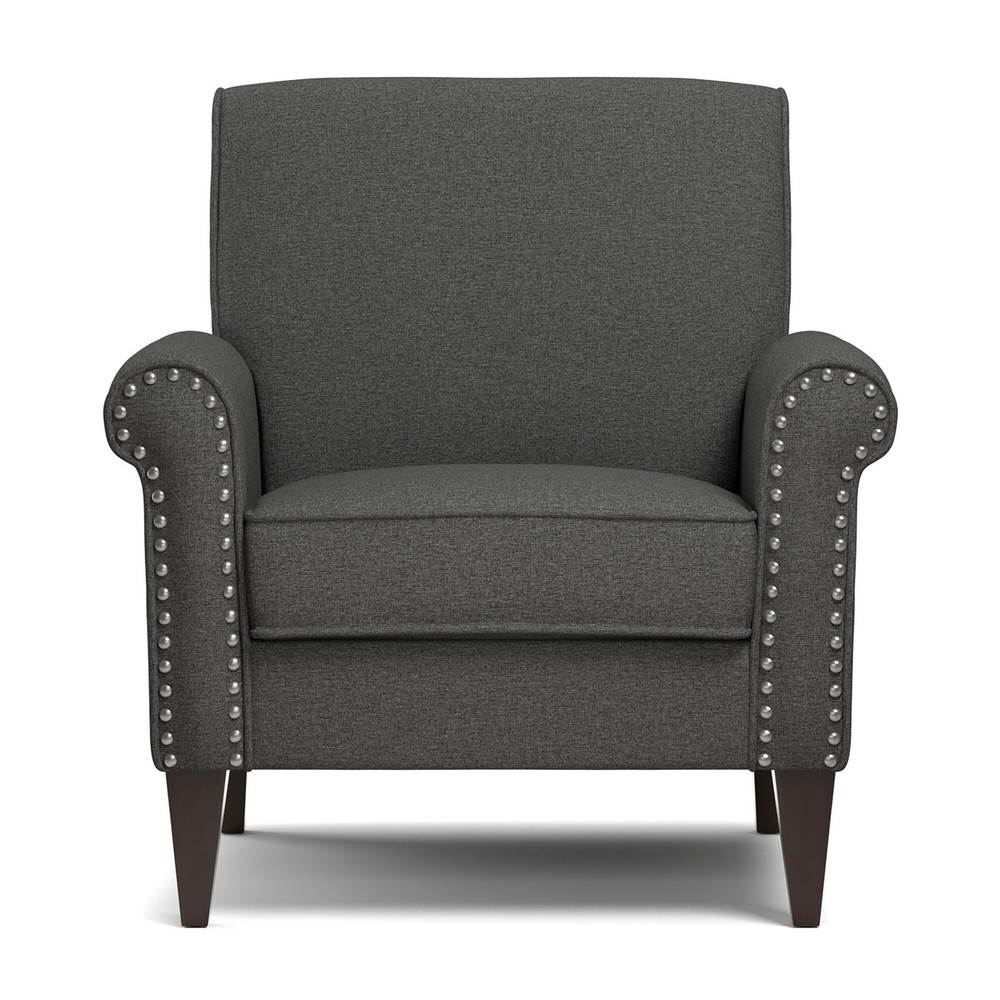 Add a touch of elegance to your living space with the Herve arm chair from Copper Grove. This transitional style chair features a plush foam seat upholstered with textured polyester and adorned with pewter nail head trim for a subtle shine. Choose from three stylish colors to complement your home decor.Features: Engineered mixed hardwood frame for durability Foam fill with pocket coils for added comfort 100% polyester upholstery for easy maintenance Espresso-finished tapered legs for a modern touch Pewter nail head trim for a hint of sophistication Round arms and attached seat and back cushions for a cohesive look Semi-firm seat for optimal support Requires assemblyDimensions: Overall: 36.5 inches H x 34 inches W x 31 inches D Seat: 19.25 inches H x 21 inches W x 20 inches D Free Shipping Over $49.99* Details Copper Grove Herve Arm Chair Product Description: Add a touch of elegance to your living space with the Herve arm chair from Copper Grove. This transitional style chair features a plush foam seat upholstered with textured polyester and adorned with pewter nail head trim for a subtle shine. Choose from three stylish colors to complement your home decor. Features: Engineered mixed hardwood frame for durability Foam fill with pocket coils for added comfort 100% polyester upholstery for easy maintenance Espresso-finished tapered legs for a modern touch Pewter nail head trim for a hint of sophistication Round arms and attached seat and back cushions for a cohesive look Semi-firm seat for optimal support Requires assembly Dimensions: Overall36.5 inches H x 34 inches W x 31 inches D Seat19.25 inches H x 21 inches W x 20 inches D Arm24.75 inches H x 6.5 inches W Weight capacityup to 300 lbs.