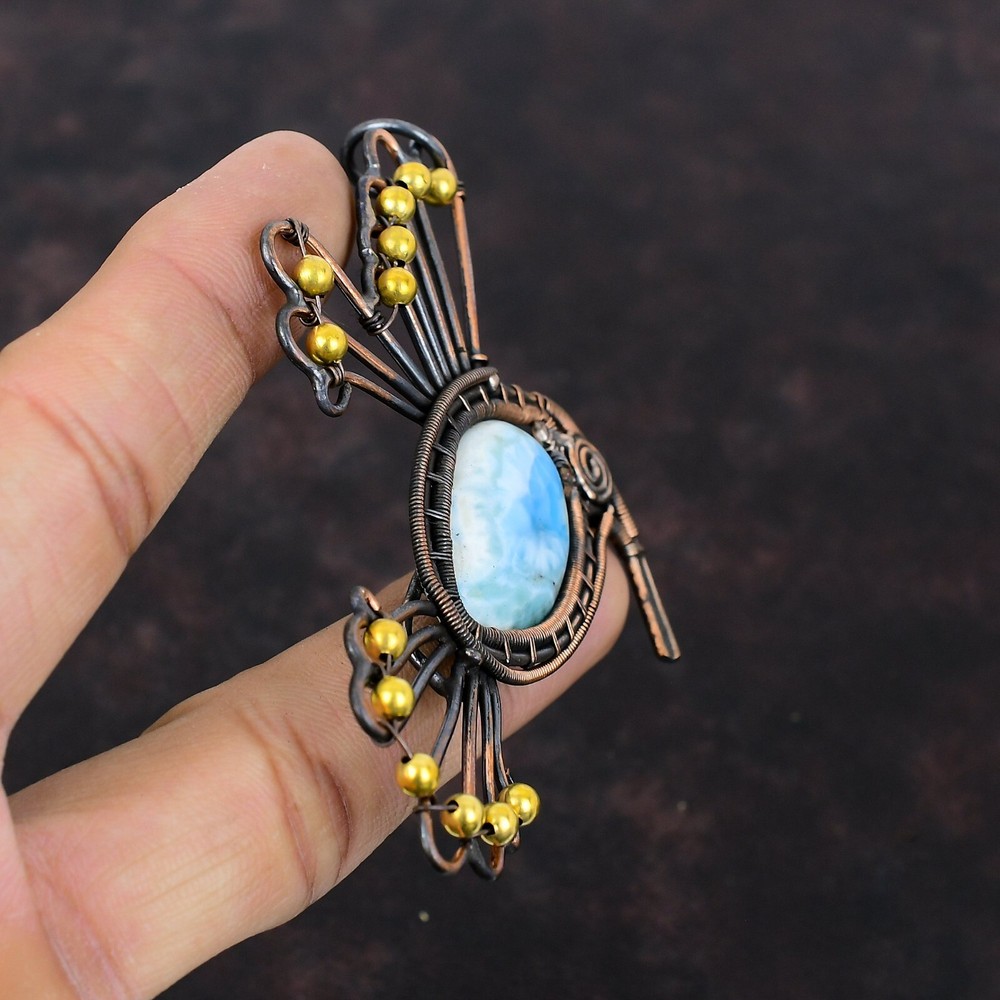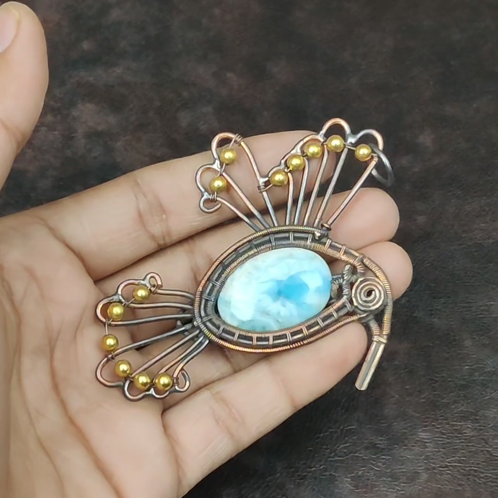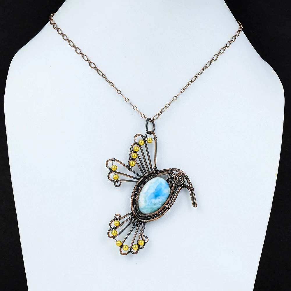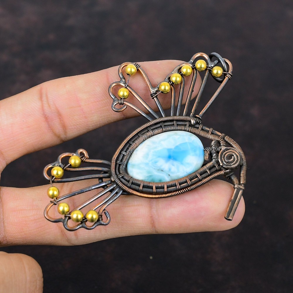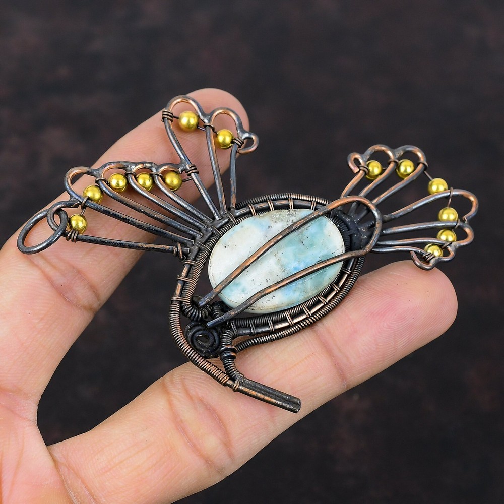 Note : Due to the natural formation of this gemstone. Slight variation in design and color are to be expected. Welcome to Silver Creation Easter Sale Copper Larimar Stone Wire Wrapped Bird Wedding New Pendant Jewelry Handmade Pendant, Wire Wrapped Pendant, Wire Wrapped Jewelry, Copper Pendant, Copper Wire Pendant, Wrapped Jewelry, Wire Wrap Pendant, Wire Wrap Jewelry SKU : VFWP-3567 Stone Shape : Oval Metal Purity : Unknown Copper Length : 64 Millimeters Width : 65 Millimeters Copper has been used for jewelry making for thousands of years, dating back to ancient civilizations such as the Egyptians, Romans, and Aztecs. Copper was valued for its beauty, versatility, and durability, and was often used to make everything from jewelry and coins to cookware and tools. In addition to its historical significance, copper jewelry also offers several benefits. Copper is a natural conductor of heat and electricity, which makes it ideal for energy healing and therapeutic purposes. Wearing copper jewelry is believed to have various health benefits, such as improving circulation, reducing inflammation, and boosting the immune system. Some people also believe that copper jewelry has the ability to balance energy and improve mood. For Mother's Day Gift For Father's Day Gift For Promise For Valentine' Day For Halloween Party For Christmas Day Gift For New Year Party For Mom For Her If you can't find the information you need or need some advice for your design? Feel free to contact us. We are fast to reply :) All our work is made by hand with Love and Care in our workshop Thank you so much for visiting and hope you enjoy shopping with us Silvercreations is committed to delivering the best quality sterling silver jewelry to customers. As a handmade jewelry manufacturer, we offer an extensive selection of copper gemstone jewelry that showcases the brilliance of our craftsmanship. We are an experienced handmade jewelry supplier with expertise in embellishing gemstones to suit every style. We offer you the liberty to create your jewelry ensemble with sparkling, earthy, and pure gemstones. Our Talented artisans masterfully handcraft each piece of jewelry you see here. Our pieces are made with genuine gemstones.