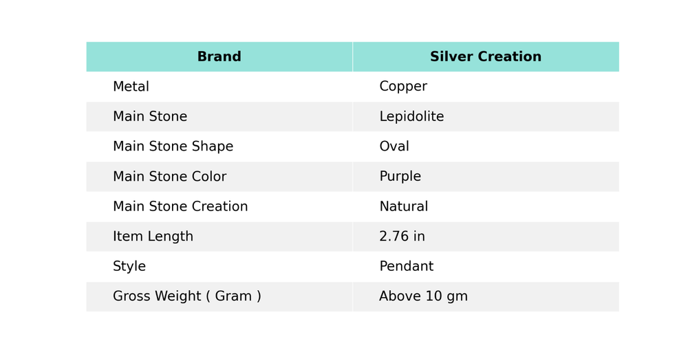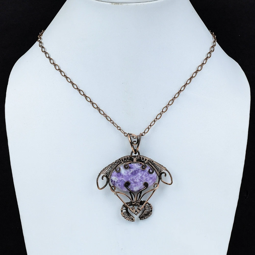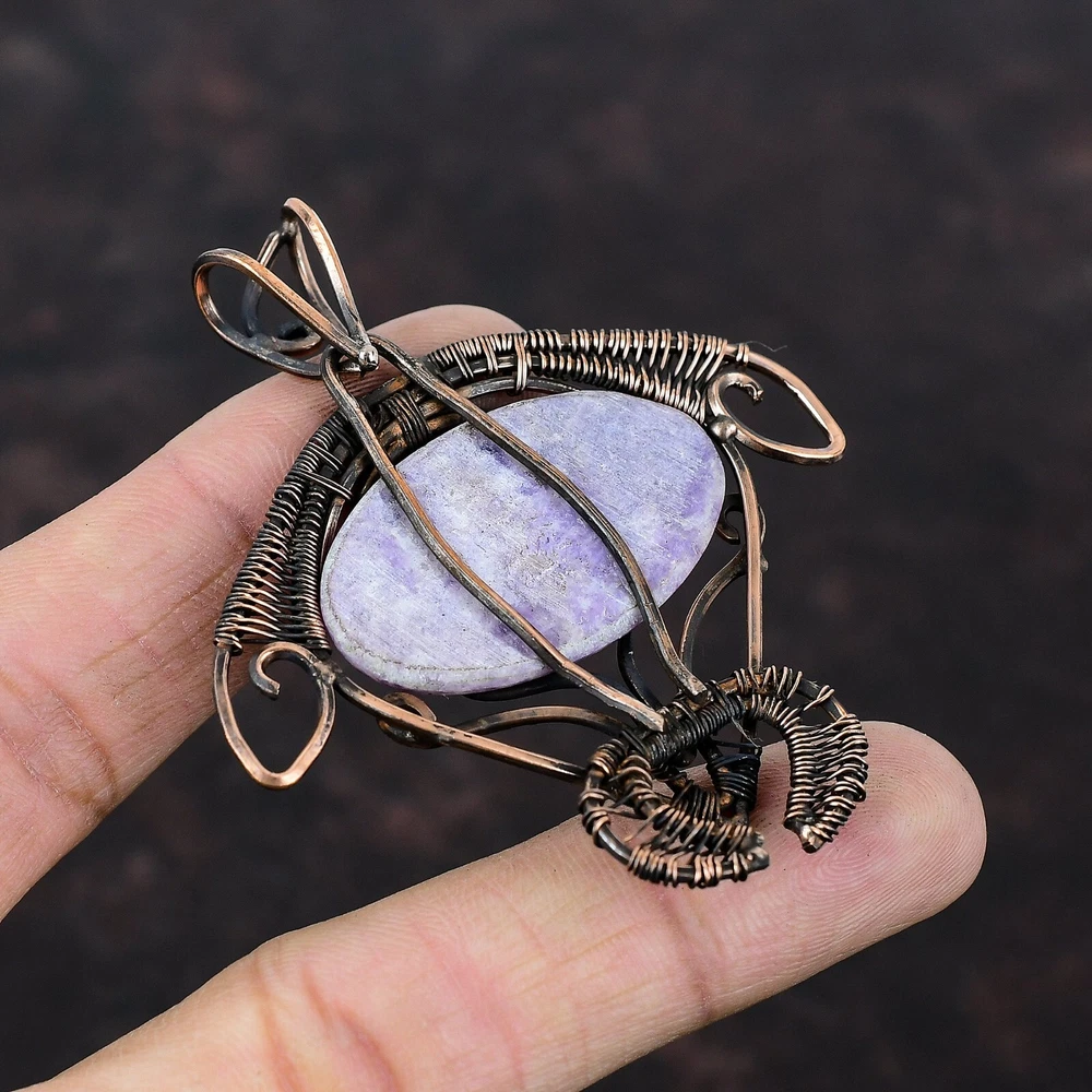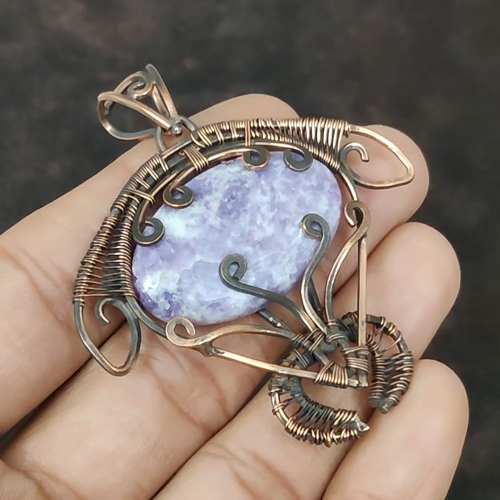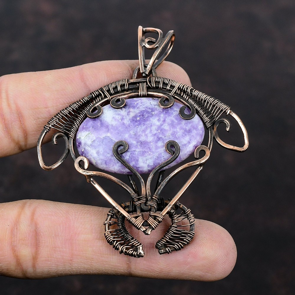 Note : Due to the natural formation of this gemstone. Slight variation in design and color are to be expected. Welcome to Silver Creation Handmade Pendant, Wire Wrapped Pendant, Wire Wrapped Jewelry, Copper Pendant, Copper Wire Pendant, Wrapped Jewelry, Wire Wrap Pendant, Wire Wrap Jewelry SKU : VFWP-2251 Gemstone : Lepidolite Stone Shape : Oval Metal Purity : Unknown Copper Length : 70 Millimetres Width : 60 Millimetres Copper has been used for jewelry making for thousands of years, dating back to ancient civilizations such as the Egyptians, Romans, and Aztecs. Copper was valued for its beauty, versatility, and durability, and was often used to make everything from jewelry and coins to cookware and tools. In addition to its historical significance, copper jewelry also offers several benefits. Copper is a natural conductor of heat and electricity, which makes it ideal for energy healing and therapeutic purposes. Wearing copper jewelry is believed to have various health benefits, such as improving circulation, reducing inflammation, and boosting the immune system. Some people also believe that copper jewelry has the ability to balance energy and improve mood. For Mother's Day Gift For Father's Day Gift For Promise For Valentine' Day For Halloween Party For Christmas Day Gift For New Year Party For Mom For Her If you can't find the information you need or need some advice for your design? Feel free to contact us. We are fast to reply :) All our work is made by hand with Love and Care in our workshop Thank you so much for visiting and hope you enjoy shopping with us Silvercreations is committed to delivering the best quality sterling silver jewelry to customers. As a handmade jewelry manufacturer, we offer an extensive selection of copper gemstone jewelry that showcases the brilliance of our craftsmanship. We are an experienced handmade jewelry supplier with expertise in embellishing gemstones to suit every style. We offer you the liberty to create your jewelry ensemble with sparkling, earthy, and pure gemstones. Our Talented artisans masterfully handcraft each piece of jewelry you see here. Our pieces are made with genuine gemstones.
