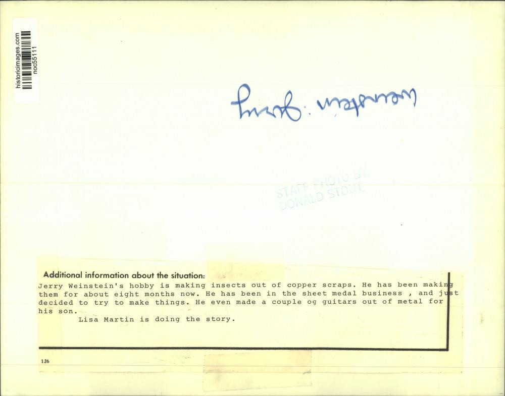 ebay template Note: Please study the images carefully to determine the condition of this vintage photograph, as it may not be in perfect condition. It may contain wrinkles, cracks, and possibly even tears due to its age and how it was handled before it got to us. A scanner may interpret colors and contrast differently than human eyes will, so it is possible that the actual photograph may be slightly darker or lighter in person. This vintage photograph is offered for sale as a collectible item and conveys no transfer of copyright. Press Photo Jerry Weinstein Makes Insects of Copper Metal Scraps - noc55111 This is an original press photo. Jerry Weinstein's hobby is making insects out of copper scraps. He has been making them for about eight months now. He has been in the sheet metal business, and just decided to try to make things. He even made a couple of guitars out of metal for his son. Photo measures 8 x 10.25 inches. Photo is dated --none. PHOTO FRONT PHOTO BACK Historic Images Part Number: noc55111 FAQs Q: Can I just download a digital version instead? A: No, we sell only vintage originals and do not make or distribute any copies, including digital ones. Q: Do you combine shipping and invoices? A: Multiple photos won on the same seller ID combine automatically through the eBay checkout process. If you encounter problems with this, send us a message via eBay messaging and we will send you an invoice. Due to eBay limitations, we cannot combine items won on our different seller IDs for a single shipping charge. Q: How quickly do you ship the items once paid? A: We ship within one business day after your payment clears. If you do not receive an "order shipped" email from us by the close of the second business day from submitting payment, please e-mail us via eBay messaging. Q: How do you make sure my photograph arrives safely? A: We package each order between two cross-corrugated pieces of cardboard to ensure that the package is as difficult to bend as possible. We then wrap each order in a plastic sheet to help protect against moisture. We want you to rest assured that we take every precaution to ensure that the photograph you receive will be in the same condition in your care as it was in ours. Q: Will the "Historic Images" watermark be on my photo when I receive it? A: No. This is a digital watermark we use to protect our images. It is not printed on the photo. Q: What are your office hours? A: eBay for us is a business, and a very fun one to be in! We are open M-F 9 to 5 (CST). Therefore, we do not return e-mails and phone calls over the weekend. We observe the following holidays: New Years Day, Memorial Day, Fourth of July, Labor Day, Thanksgiving and the day after Thanksgiving, Christmas Eve and Christmas Day. Q: Where did all these vintage photos come from? A: These original vintage photographs are from various news service and newspaper photo archives from locations around the country including: Boston, Detroit, Tampa, Chicago, Denver, Seattle, New Orleans, Milwaukee, Portland, Spokane, and more. We do not copy or reproduce any photographs -- every item is a unique vintage piece that was housed in a news archive. Q: Can I use this photograph in my book/blog/website? A: The short answer is no. There is no transfer of copyright for republication or reproduction with these photographs when you purchase them, and only photographs taken before 1923 are currently automatically in the public domain. Permission from the copyright holder, which usually can be identified from the back of each photo, must be sought to republish or reproduce the image for any purpose. Q: Do you relist items (in case I miss an auction ending)? A: Auction items that receive no bids are relisted in our store (historicimages-store on eBay) as a fixed-price item and at a higher price than the starting auction price. Q: Do you leave feedback? A: Yes, we always leave feedback for buyers. Our software monitors when our buyers leave us feedback, then notifies us that we can leave feedback for the buyer. Rest assured, if you leave feedback, we will do the same! Check out our family of eBay IDs: historicimages01 Sports Photos historicimages02 Entertainment Photos historicimages03 Americana Photos historicimages04 International & War Photos historicimages05 Transportation Photos historicimages06 Photos of All Subjects historicimages07 Entertainment Photos historicimages08 Newsworthy Photos historicimages09 Entertainment Photos historicimages10 Sports Photos historicimages-store Our largest fixed-price selection historicimages-gallery Hand-picked photos Saturday night auctions About Us Historic Images was formed in September 2009, with a handful of scanners working out of a basement to digitize newspaper photo archives. We have since moved out of the basement, and we can now archive thousands of photos per day. Our company has worked with magazines and newspapers from Detroit, Boston, Denver, Seattle, Tampa, Chicago, and New Orleans, just to name a few. We are constantly adding to our inventory, and have assembled an archive of millions of photos to date. As our company evolved, we began our eBay business, which brings thousands of fresh auctions per week to the world's largest online auction marketplace. Our custom software systems and team of great employees allow us to efficiently scan and sell large photo archives online. At the very core of our company's DNA is a strong commitment to customer satisfaction and strict integrity for our product. Our promise to you is that we will do everything in our power to provide you a great buying experience. Copyright 2009 - Present, Historic Images, Inc. Sell Smarter with Kyozou. Inventory and Ecommerce Management