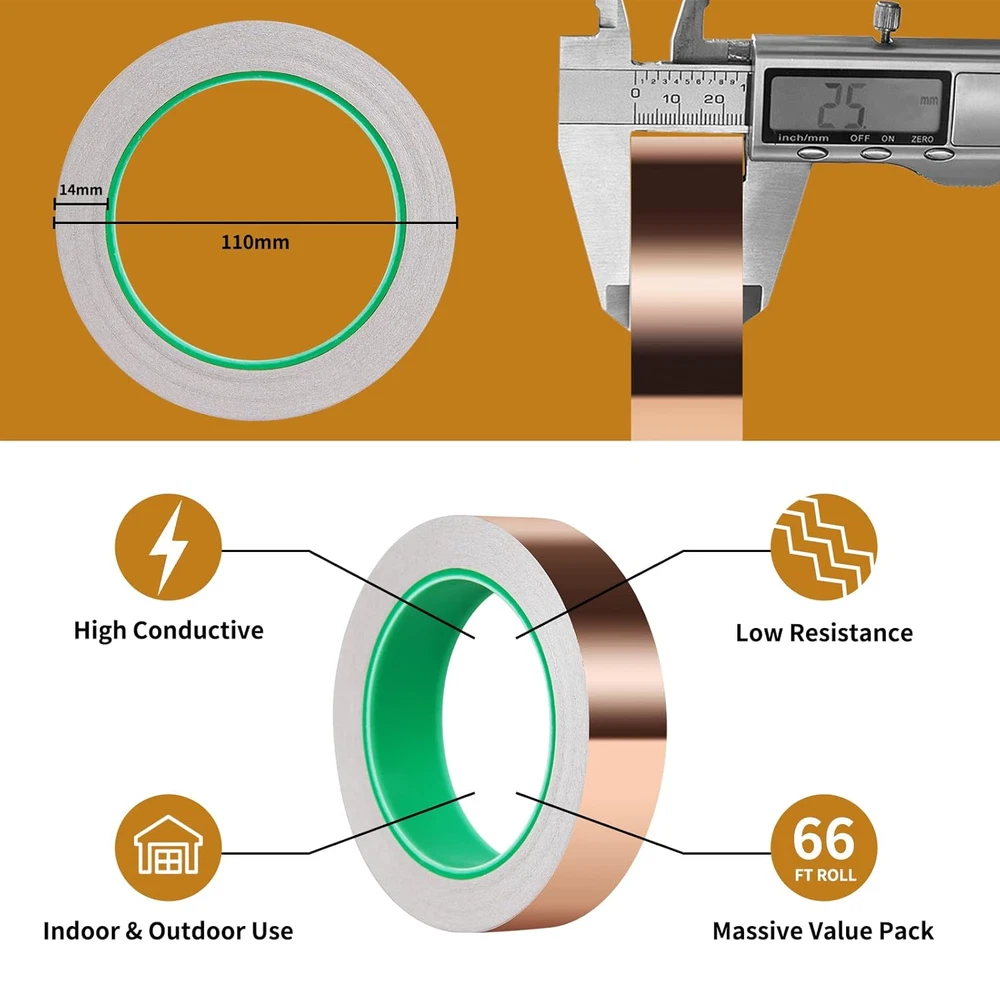 Dual Copper Tape - Dual-conductive copper foil tape is more functional than single-sided copper tape. You don’t need to worry that the copper foil will reduce the effectiveness between components because the current will flow through both side and the adhesive of foil tape. Great copper tape for slugs, paper circuits, electrical repairs, soldering and grounding. High-quality Foil Tape - Vaincre copper tape is made of premium conductive adhesive and copper foil material. With a strong adhesive, this copper foil can firmly sticks to almost any clean surface. Copper tape conductive adhesive is easy to peel off and tore so you can can use them by hand. The copper foil tape also can be twisted and bent, making it easy to shape. 1 inch X 66 FT copper flashing is enough for a few different projects. EMI Shielding Copper Foil Tape - Vaincre copper tape provide an economic EMI shielding solution for a variety of applications. The copper foil can protect your electronic devices from electromagnetic interference. This cooper tape conductive adhesive does the good job on mobile phone, computer, printer, PDA, PDP, etc. This foil tape also is a great copper shielding tape for guitars. The conductive tape can eliminate the buzz and noise, making your guitar tone perfect. Stained Glass Supplies - If you like stained glass art, you can’t miss this copper foil tape for stained glass. Strong adhesive copper tape make the copper foil stick easier. Adheres well and doesn't lift while soldering. The copper foil tape also is perfect for various DIY and creative projects. You can make personalized wall, decorating bottles, wrap up your packages for gifting, making birthday light card and paper circuit, or find more creative uses for this copper tape. Copper Tape for Slugs - Slugs and snails are a common nuisance in gardens. Use this copper garden tools to discourage slugs and snails activity. You can apply copper foil around potted plants, around your garden edges, or wherever the slugs and snails are going. Great copper garden tool to keep garden plants, flowers and vegetables safe. Product Description Vaincre copper tape is made of high grade conductive adhesive and copper material. Copper foil tape diameter is 1 inch and 66 feet in length. Strong adhesive make the foil tape stick well, easy to peel off and shape. Recommend to apply the copper foil to a clean and smooth surface The conductive flashing is high conductive, low resistance, anti-corrosion, waterproof and high temperature resistance. Perfect for indoor and outdoor use. Copper tape conductive adhesive has a wide variety of uses: EMI Shielding, Electrical Repairs, Stained Glass Supplies, Soldering, Paper Circuits, Education Aid, Crafts, Grounding, Garden and so on.