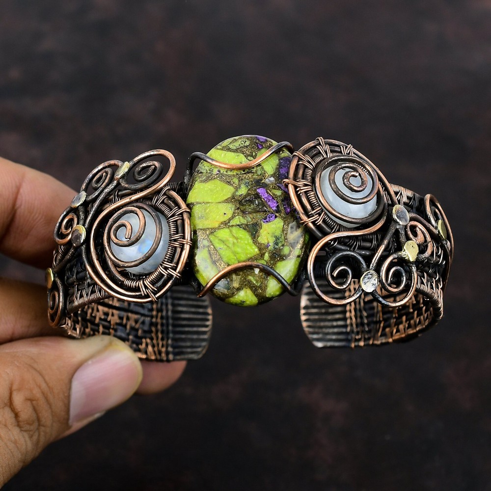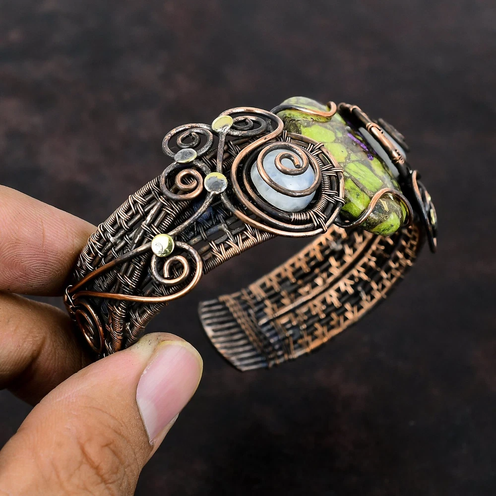 Note : Due to the natural formation of this gemstone. Slight variation in design and color are to be expected. Welcome to Silver Creation Christmas Sale Copper Copper Stichtite Stone Rainbow Moonstone Wire Wrapped Cuff Handmade Cuff, Wire Wrapped Cuff, Wire Wrapped Jewelry, Copper Pendant, Copper Wire Cuff, Wrapped Jewelry, Wire Wrap Cuff, Wire Wrap Jewelry SKU : VFWC-491 Gemstone : Copper Stichtite Stone Shape : Oval Metal Purity : Unknown Copper Length : $Cuff Unit$ Width : $Cuff Unit$ Copper has been used for jewelry making for thousands of years, dating back to ancient civilizations such as the Egyptians, Romans, and Aztecs. Copper was valued for its beauty, versatility, and durability, and was often used to make everything from jewelry and coins to cookware and tools. In addition to its historical significance, copper jewelry also offers several benefits. Copper is a natural conductor of heat and electricity, which makes it ideal for energy healing and therapeutic purposes. Wearing copper jewelry is believed to have various health benefits, such as improving circulation, reducing inflammation, and boosting the immune system. Some people also believe that copper jewelry has the ability to balance energy and improve mood. For Mother's Day Gift For Father's Day Gift For Promise For Valentine' Day For Halloween Party For Christmas Day Gift For New Year Party For Mom For Her If you can't find the information you need or need some advice for your design? Feel free to contact us. We are fast to reply :) All our work is made by hand with Love and Care in our workshop Thank you so much for visiting and hope you enjoy shopping with us Silvercreations is committed to delivering the best quality sterling silver jewelry to customers. As a handmade jewelry manufacturer, we offer an extensive selection of copper gemstone jewelry that showcases the brilliance of our craftsmanship. We are an experienced handmade jewelry supplier with expertise in embellishing gemstones to suit every style. We offer you the liberty to create your jewelry ensemble with sparkling, earthy, and pure gemstones. Our Talented artisans masterfully handcraft each piece of jewelry you see here. Our pieces are made with genuine gemstones.