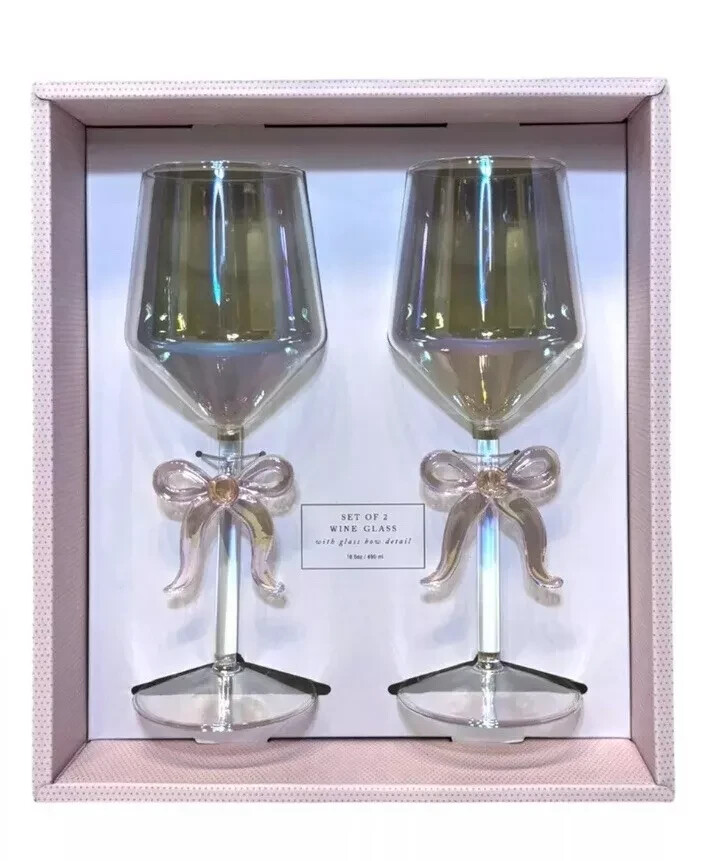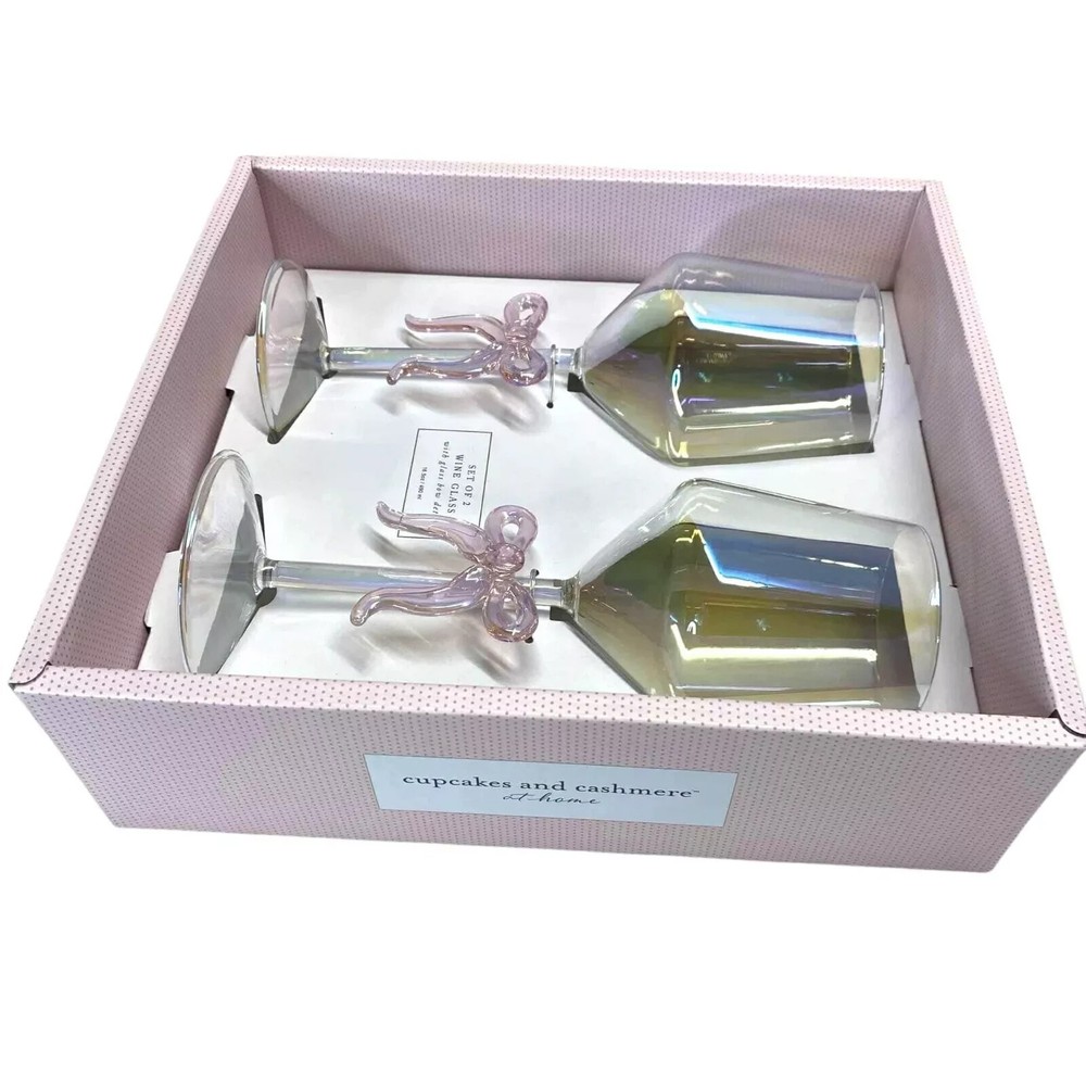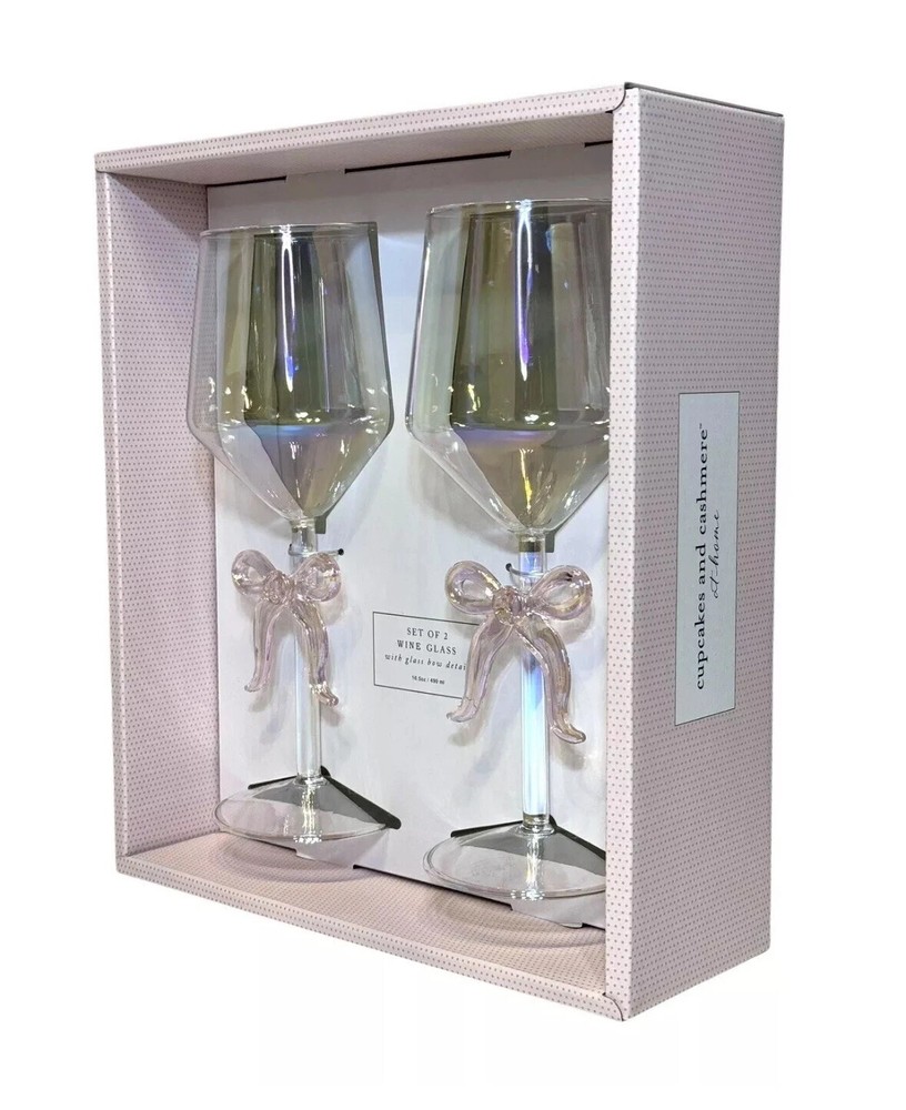 Cupcakes & Cashmere Christmas Pink Bow Coquette Wine Glasses 16.5oz Holiday Gift Elevate your holiday gift with these beautiful wine glasses from Cupcakes & Cashmere. The pink bow coquette design adds a touch of festive charm to any occasion, making them perfect for Christmas or all occasions. Crafted from high-quality glass, these 16.5oz glasses are ideal for wine enthusiasts and come in a set of two. The glasses feature a unique bow design and are perfect for adding a touch of elegance to your home bar or kitchen.