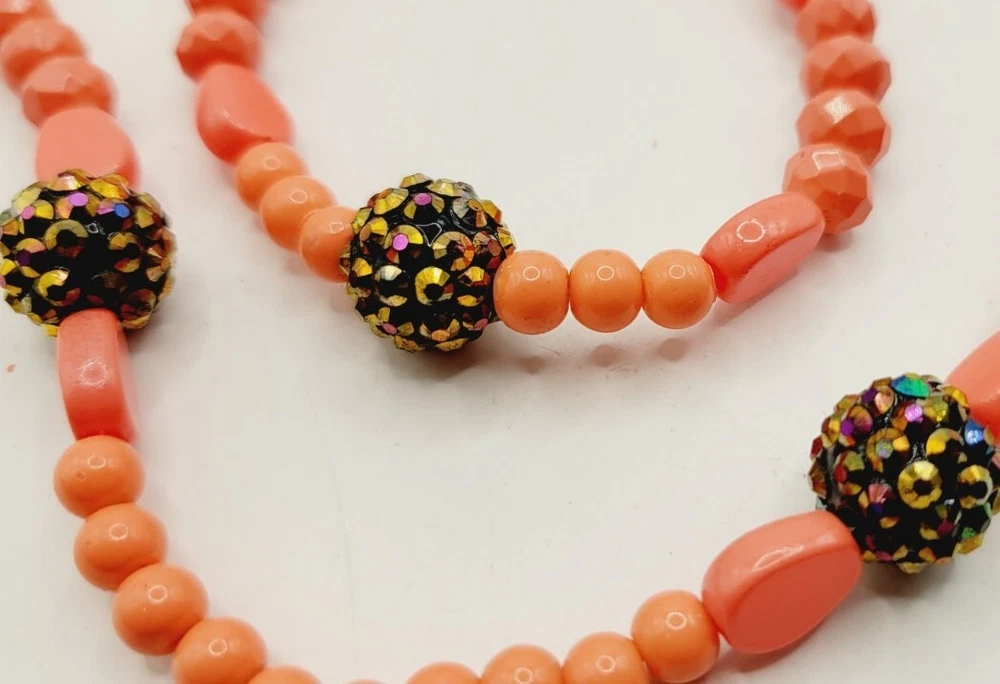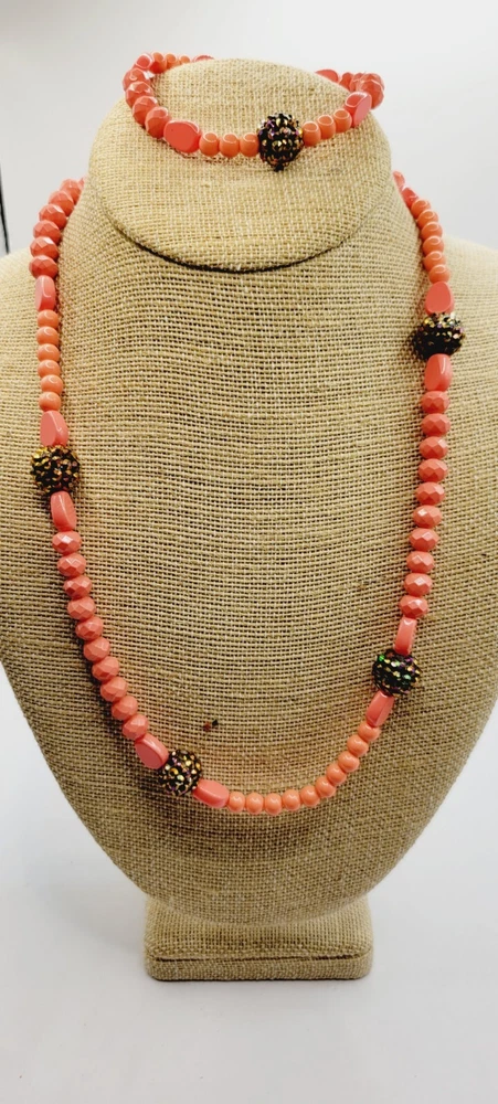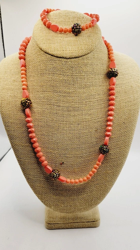 Coral Beaded Necklace & Stretch Bracelet Set Art Deco