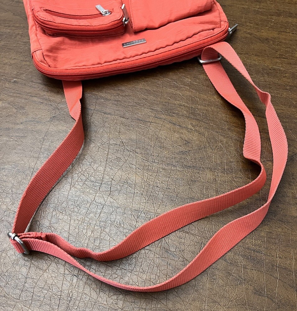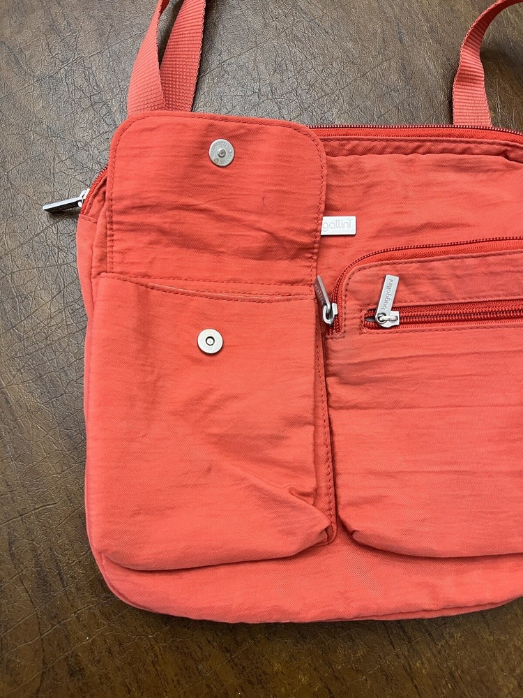 Baggalini Coral Orange Medium Sized Crossbody Bag Light Weight Travel Bag. Note: The bag needs some TLC; it has pen marks and stains; on the lining shown in photos. Not certain if they can be removed. The bag is clean with no tears. All of the zippers zip with no issues. There is no wear on the strap. Thank you for stopping by!