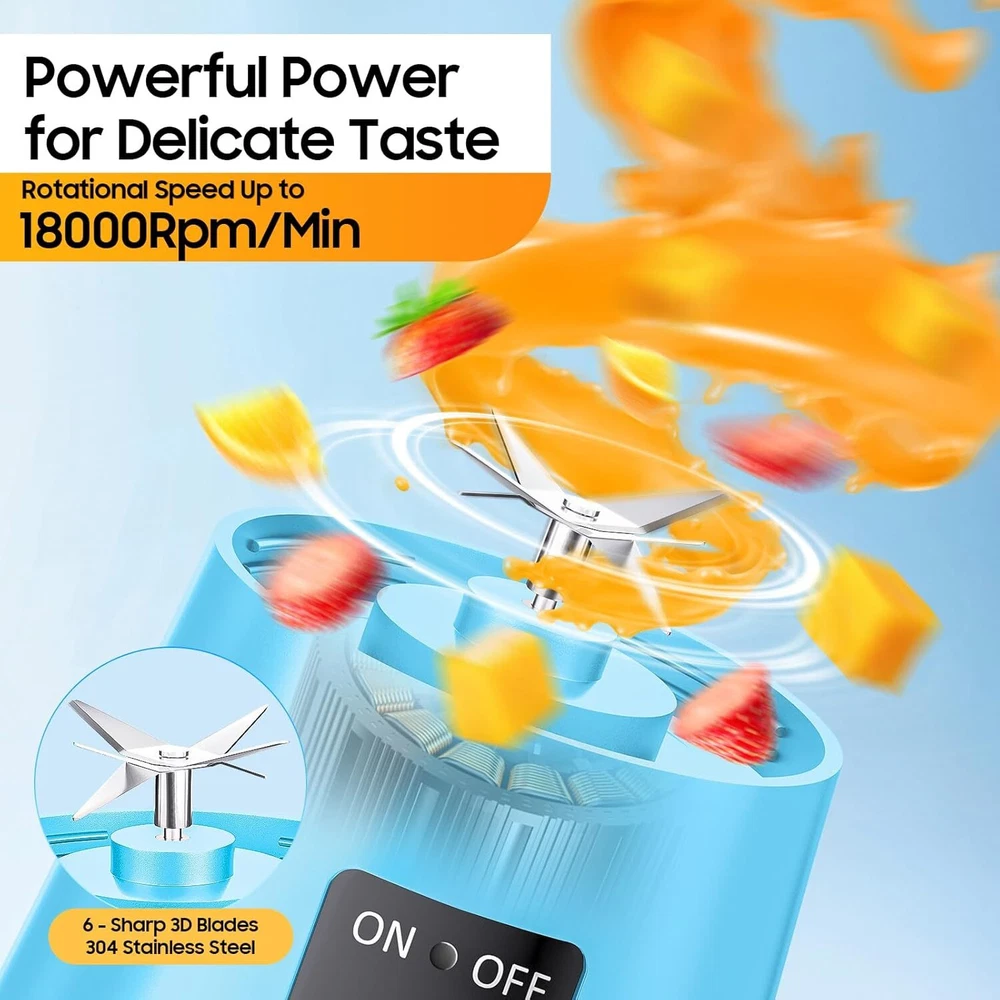 【High Speed & Efficient Mixing】 Our smoothie blender is equipped with 6 stainless steel with a powerful cutting and blending capacity and spins at a high speed of 18,000 rpm. Water or milk needs to be added for juicing (otherwise the machine will not work properly). 65 watt high-power mixer, all-round stirring, juicing, extracting nutrients in fruits and vegetables, delicate taste. 【Health & Safety Materials】This personal blender is made of carefully selected healthy materials, using food-grade materials, BPA-free, safety and health are guaranteed, drink with confidence. The body is temperature-resistant and not easy to break, and the bottom of the machine is stable and does not shake. 【Rinse With Ease】 Don't worry about the small blender being difficult to clean, this mini blender is easy to disassemble and wash, add water to the cup, start the button, use the whirlpool to rinse it, free your hands. Tips: For your safety, do not soak portable blender in water. 【Portable Design】 The travel blender is lightweight and compact, the cordless wireless design helps us get rid of cumbersome wires, and it is equipped with a USB charging cable, travel blender can be carried and used anytime and anywhere in various places such as picnics, sports, travel, office, kitchen, etc. Perfect gifts for Women/Men/Mom/Dad 【Easy to Use】Step 1: Cut the ingredients into cubes and put them in a cup, Step 2: Pour in water or milk, Step 3 Assemble the bottom and body of the machine, and start it with one click. Product Description 1 Directions for use 2 Directions for use Whether the portable blender is plastic or glass? This model cup is plastic, but very good quality.Made of food-grade material, BPA Free. Can a personal size blender make cold drinks? Of course, you can put the ice cubes in the blender with the ingredients to work, or leave the squeezed drink in the refrigerator with the cup for a while. How about the blender mixing hard or chunky ingredients? It is recommended to cut the ingredients into small pieces and then mix them for a more delicate texture, and the 6 blades can be stirred to cope with hard ingredients. What is the capacity of the cup? The cup is 380ml, which is very portable and suitable for traveling. Can it be used during charging? It is recommended to use it after charging because it is easy to wear out the battery while charging.