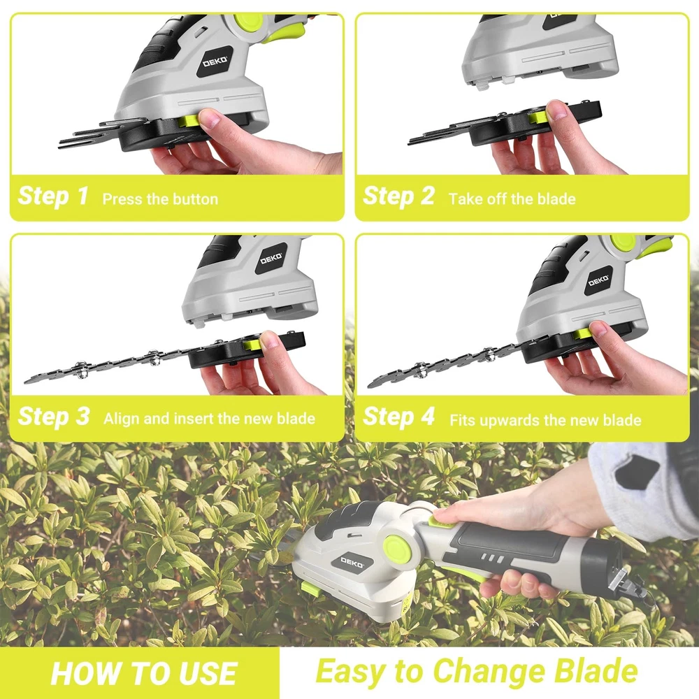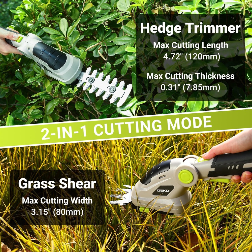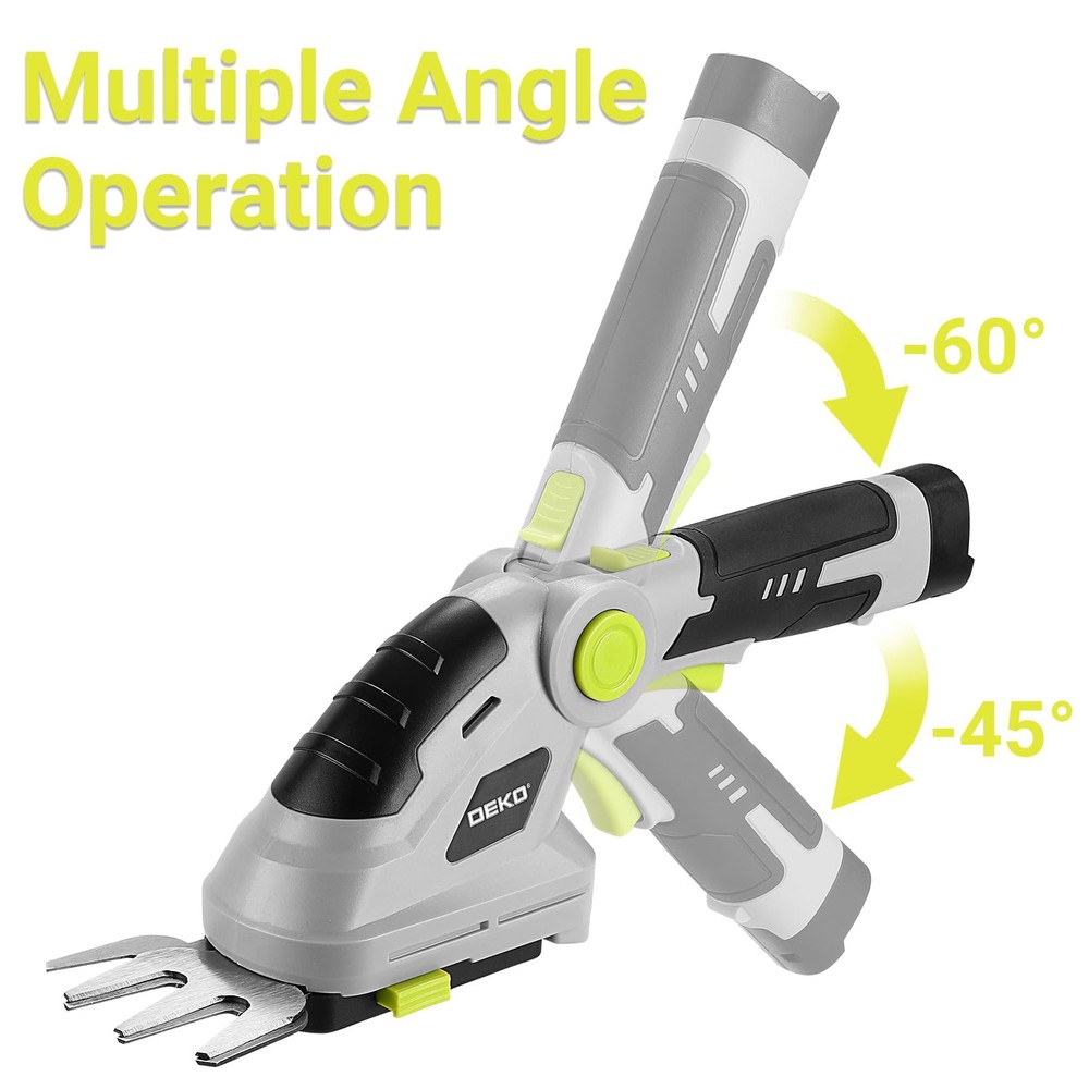 cordless hedge trimmer has an angle adjustment range from +45° to -60°, ideal for trimming grass or shrubs of all heights. It's easy to adjust the angle by pressing and holding the rotary button then swing the handle upwards and downwards to adjust the angle. The variable angle of our electric grass trimmer makes the garden and lawn care much comfortable 【Variable Angle Operation】The cordless hedge trimmer features an angle adjustment range from +45° to -60°, making it suitable for trimming lawns and shrubs of varying heights. Simply press the rotation button and swing the handle to adjust the angle. The 2-in-1 design allows for quick switching between lawn and hedge trimming modes, which is easy for beginners to use 【Multiple Safety Protections】The electric hedge trimmer includes a start key at the bottom of the handle to prevent accidental startup. To start, insert the key, press the lock button, and simultaneously press the switch button to ensure safe operation 【Lightweight and Portable】Weighing only 1.5 pounds, the handheld hedge trimmer is equipped with an ergonomic handle for flexible use without causing fatigue during extended periods of operation. It also features a high-capacity 2000mAh battery for longer runtime 【Sharp Blades】 The trimmer is fitted with sharp and durable blades, ideal for trimming lawns, hedges, and small shrubs. The blades measure 5.79 inches in length and 3.26 in inches width, delivering excellent trimming results 【Warm Tips】The trimmer comes with a Type-C charging cable. For optimal battery performance, it is recommended to charge the device every 3-6 months, even if not frequently used. Clean the blades promptly after each use and store them in a dry place to extend their lifespan