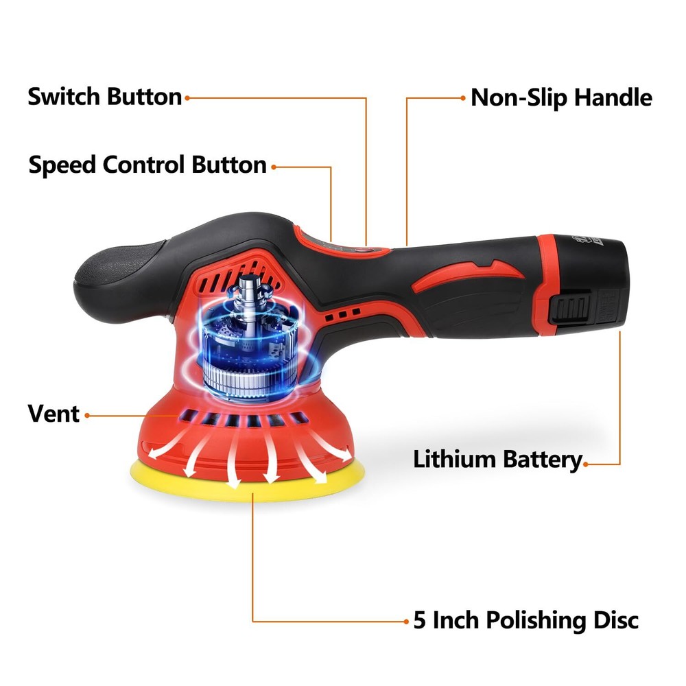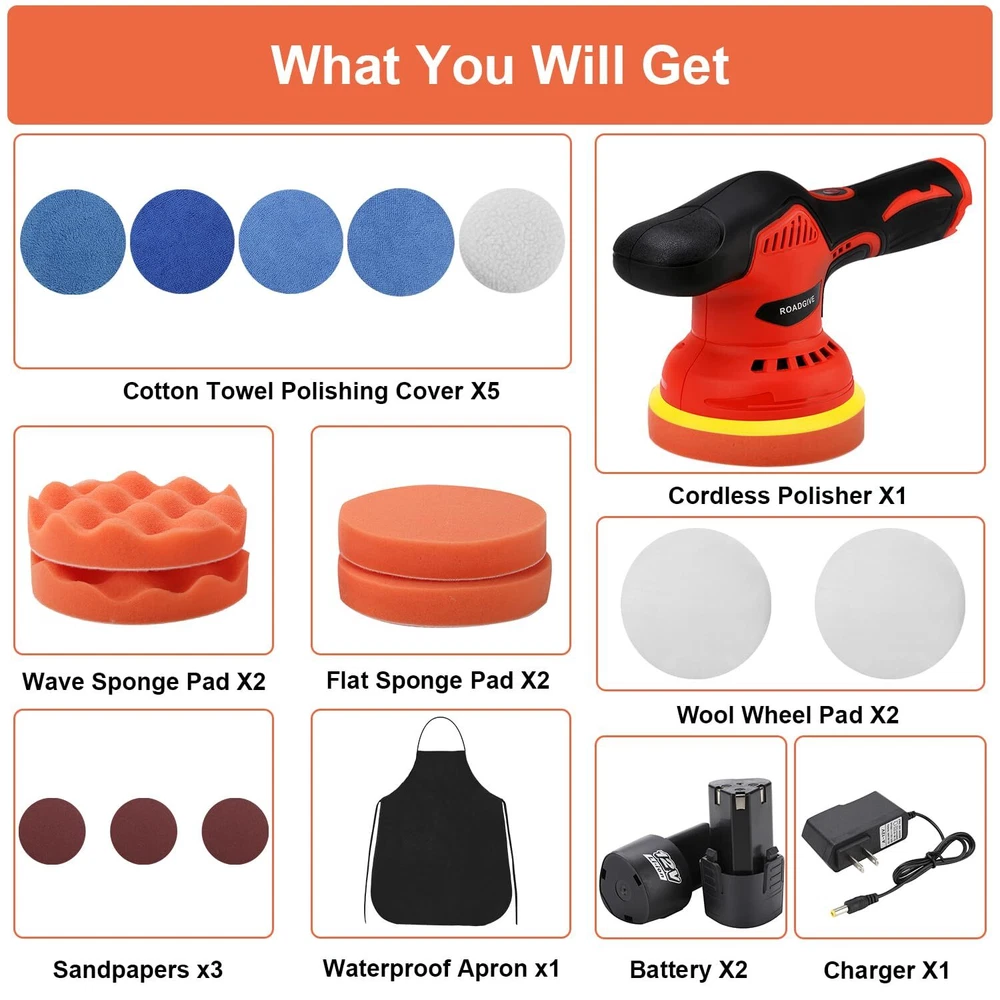 Product Parameter: 5-inch diameter (it can be replaced with a 6-inch polishing disc by using a flat 24mm opening hand wrench), 8 variable speeds, 2000mAh battery capacity, 2800-5500r/min no-load speed, 12V voltage, 280W working power, 12mm rccentric distance, 2.6 pounds weight Powerful Performance: Equipped with a mighty 2000mAh lithium battery, charging is simple and economical. This polisher ensures you have ample power to tackle the most exquisite car detailing jobs 8-Speed Control: The maximum speed can be manually adjusted to 8 levels, up to 2500-5500rpm. You can choose the appropriate speed according to different usage scenarios. It is an ideal polishing tool for polishing/waxing/buffering well, refresh your car Portable and Lightweight: Only 2.6 pounds light weight. This cordless car buffer polisher is not limited by cables, just plug in the battery and you can use it anywhere. Apart from that, the ergonomic design of the cordless car buffer provides comfortable operation, enabling you to work for long hours without discomfort What You Will Get: Buffer Polisher x1 ; Battery x2 ; Charger x1 ; Flat Sponge Pad x2 ; Wave Sponge Pad x2 ; Wool Wheel Pad x2 ; Cotton Towel Polishing Cover x5 ; Sandpaper x3 ; Waterproof Apron x1