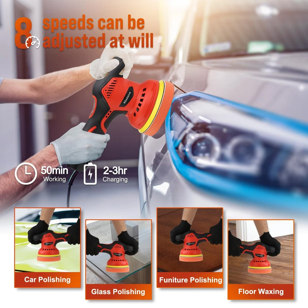 This cordless car buffer polisher is a game-changer! The 8-speed control gives me perfect precision for any detailing job, and the powerful 2000mAh battery lasts surprisingly long. Lightweight yet sturdy, it handles like a dream—no cords, no hassle. Swapping between 5-inch and 6-inch pads is a breeze, and the variable speeds (2800-5500 RPM) make it versatile for waxing or heavy correction. A must-have for effortless, pro-level results at home!