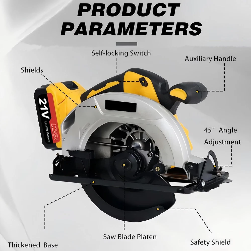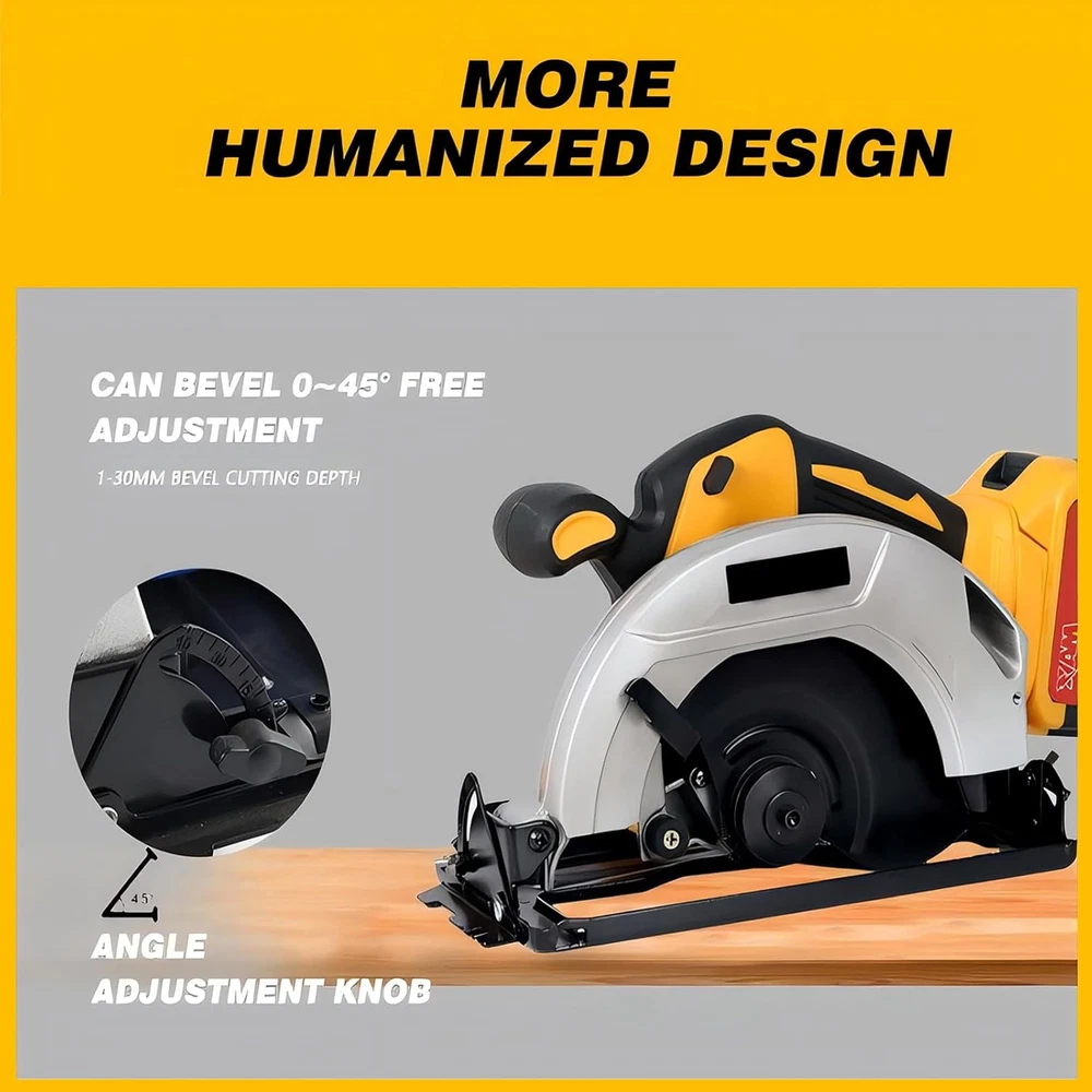 【Compatible with DEWALT 20V Batterry】Cordless Circular Saw compatible with DEWALT 20V Lithium-Ion Batteries DCB200, DCB201, DCB203, DCB204, DCB205, DCB206, etc. ensures seamless integration and reliable power for your nailing tasks. CAUTION: Batteries not included. 【Powerful Brushless Motor】DEROLT 7 1/4 Circular Saw's brushless motor maintains 4500RPM under load, provides powerful cutting performance and increases service life and motor life, making it easy to tackle a variety of jobs. 【Capability and Ease of Use】 The Compact Circular Saw's 7-1/4-inch blade delivers a 2-9/16-inch cut at a 90-degree angle, miter capability up to 45 degrees, and 1-3/5-inch cutting capacity for increased versatility. 【Wide Application】It can be equipped with two sizes of saw blades, 7-1/4-inch saw blade and 6-1/2-inch saw blade, so you can choose the right one to cope with a variety of work requirements, such as woodworking, rock, plastics, and sheet metal. The package includes two attached 7-1/4 inch saw blades for you to use. 【100% Customer Service】If you have any questions about sierra circular, please contact our Customer Service team. We will do our best to solve your problems with 24/7 services. In case of quality problems, we also offer new replacements instead of repairing within 12 months. circular saws