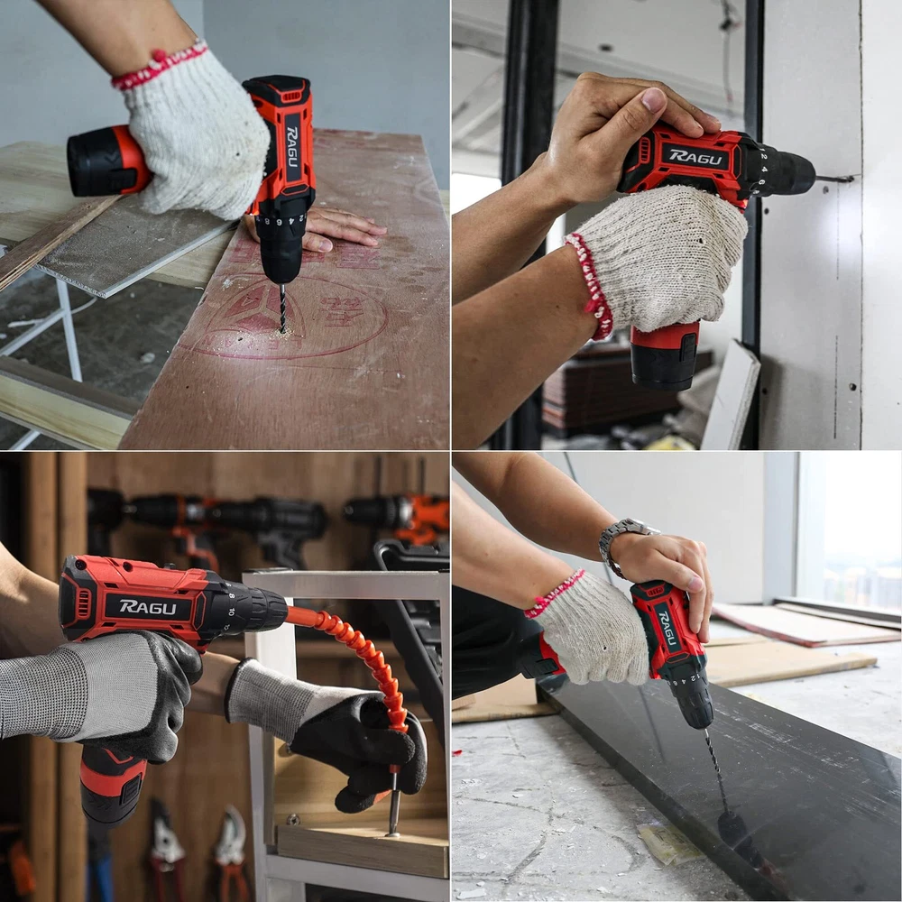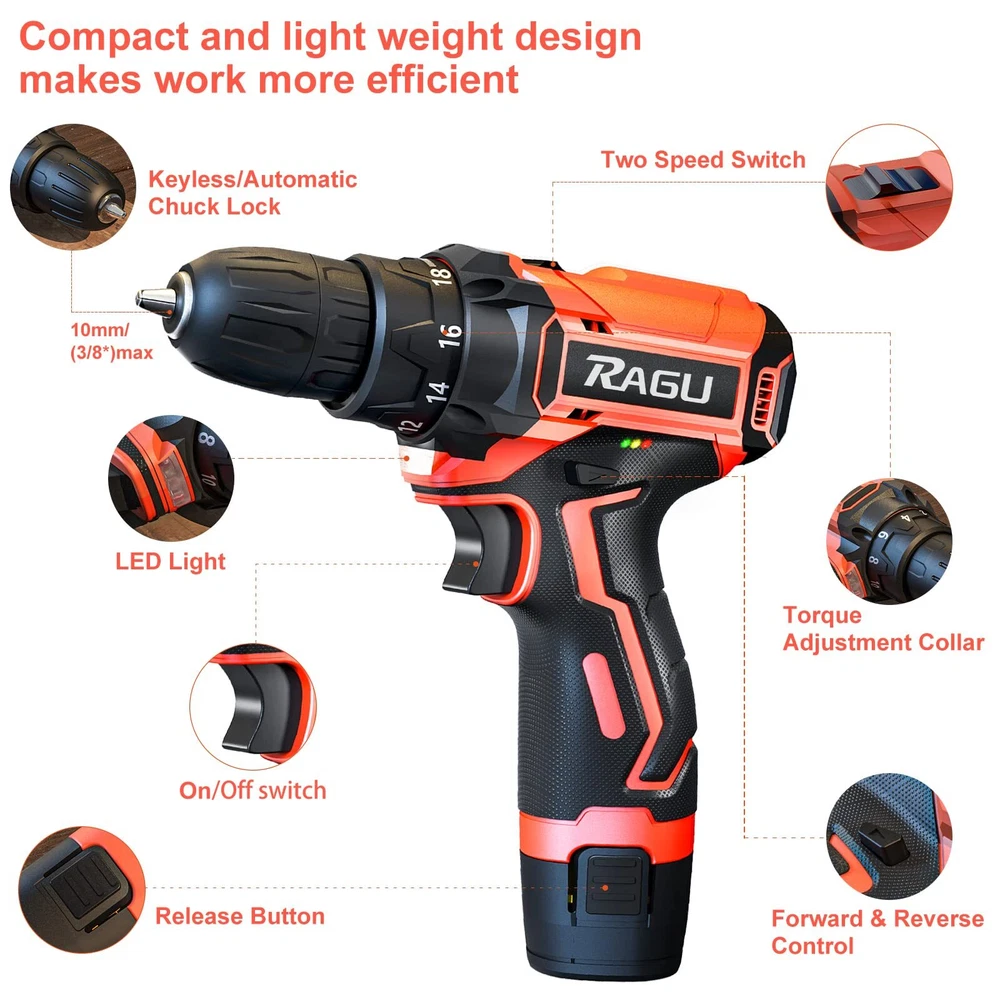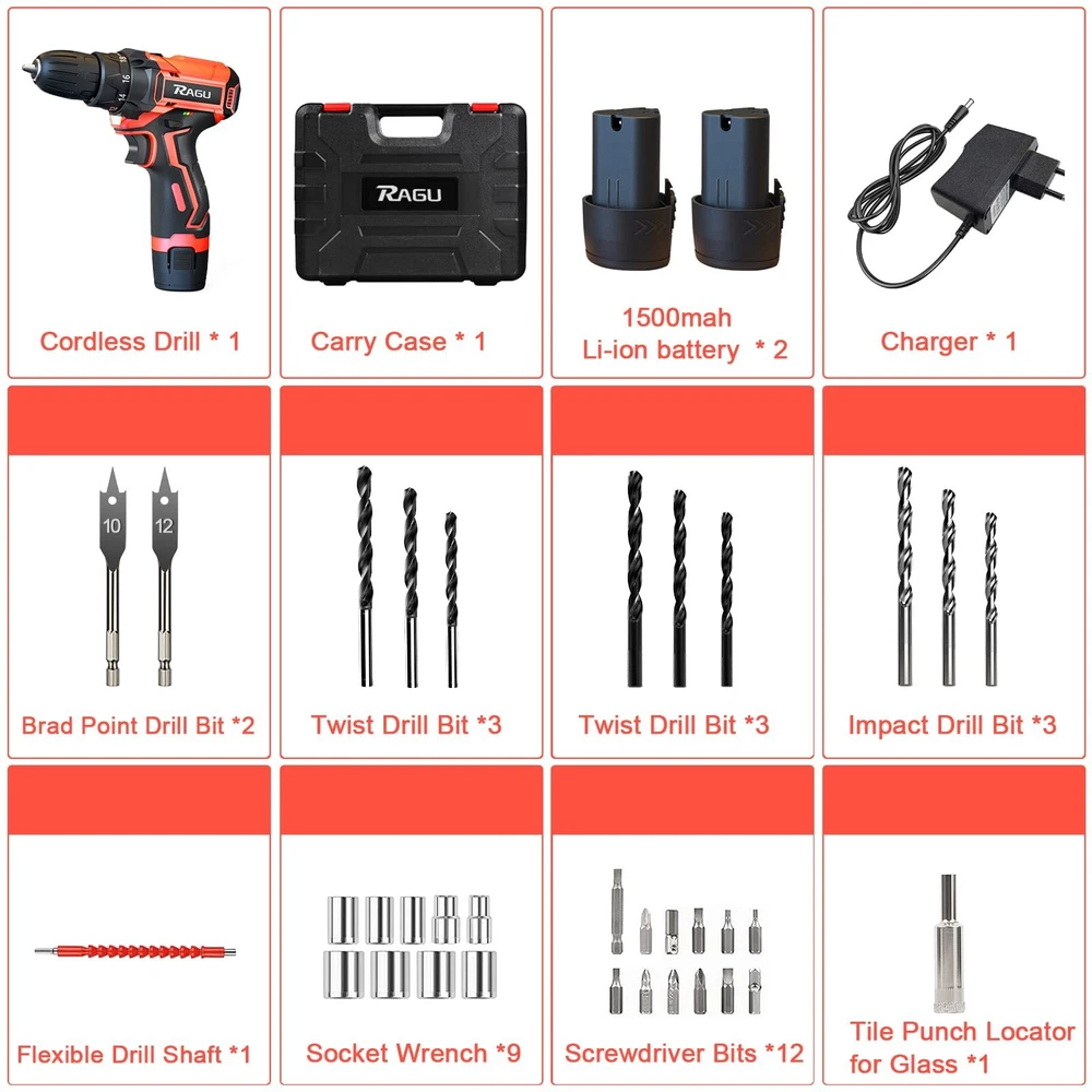Cordless Drill 12v, 34pcs Drill Driver Set with 2 Batteries, Drill Set with 2 Variable Speed 3/8'' Keyless Chuck for Drilling Wood, Ceramics ✅【Efficient & Lightweight】The most compact and lightweight drill set in 12.6V-class with amazing performance-to-weight ratio, minimizes fatigue in most daily jobs; Rubber-covered handle with ergonomic design provides maximum comfort grip for being breezily operated in one hand and less vibration; it maneuverable and simply easy to use for women, not to mention for men. Trigger-activated LED light illuminates any enclosed workspace. ✅【2 Batteries & Powerful Power】The 12.6V cordless drill set came with 2pcs 1500mAh Batteries and 1-2H fast charger that can be used for strong and steady power and an endurable run time. Industrial copper motor provides powerful power. The top two clutch setting reaches a maximum speed of 1350rpm for various fastening mount and drilling uses.【Please Note that unplug the battery after fully charged to extend battery life.】 ✅【18+1 Clutch & 2-Variable Speed】The power drill set with 18 different torque settings allows you to control the drill precisely when drilling wood, plastic and other materials. 2- Variable Speed (0-400RPM and 0-1350RPM) fits the wide range of drilling and screw driving applications. Our power drill set will be an indispensable tool in your daily life. ✅【3/8" Keyless Chuck & Forward/Reserve Control 】Our electric drill/driver is bulit with a 3/8" (10mm) keyless chuck providing an automatic spindle lock that enables one-hand changing with advance accessory compatibility. The Forward/Reverse switch allows you to either screw or replace/remove bits on your purposes. The maximum torque reaching 30Nm, ideal for different applications, no matter it is home improvements, household construction, or DIY projects. ✅【34pcs Accessories & Carrying Case】34pcs accessories meet the needs of most kinds of work. You will get 1 x RAGU Cordless power drill, 2 x 1.5 Ah Li-on Batteries, 9 x Socket Wrench (5-13 mm) and other necessary accessories, totally reaching 34 pieces. A sturdy case to keep the drill and all of its accessories organized. The power drill kit is perfect for your home use or gifts. Shipping We offer FREE shipping on all orders! We use a selection of shipping services such as UPS, FedEx, USPS etc. We only ship to the lower 48 states, no APO/FPO addresses or PO Boxes allowed. Local pickups and combined shipping options are not provided at this time. Return You can return a product for up to 30 days from the date you purchased it. Any product you return must be in the same condition you received it and in the original packaging. Please keep the receipt. Payment We accept payment by any of the following methods: PayPal Please pay as soon as possible after winning an auction, as that will allow us to post your item to you sooner! Feedback Customer satisfaction is very important to us. If you have any problem with your order, please contact us and we will do our best to make you satisfied. Contact Us If you have any queries, please contact us via ebay. We usually respond within 24 hours on weekdays. Please visit our eBay store to check out other items for sale! Thank you for shopping at our store.