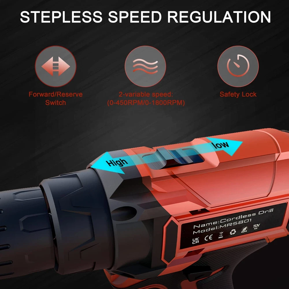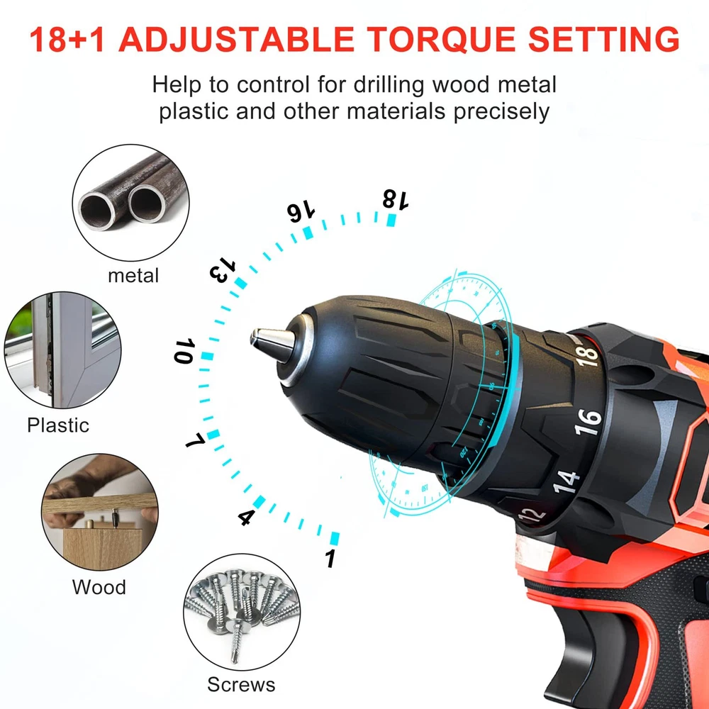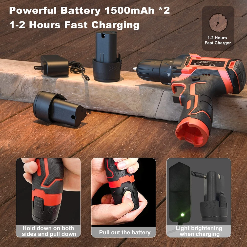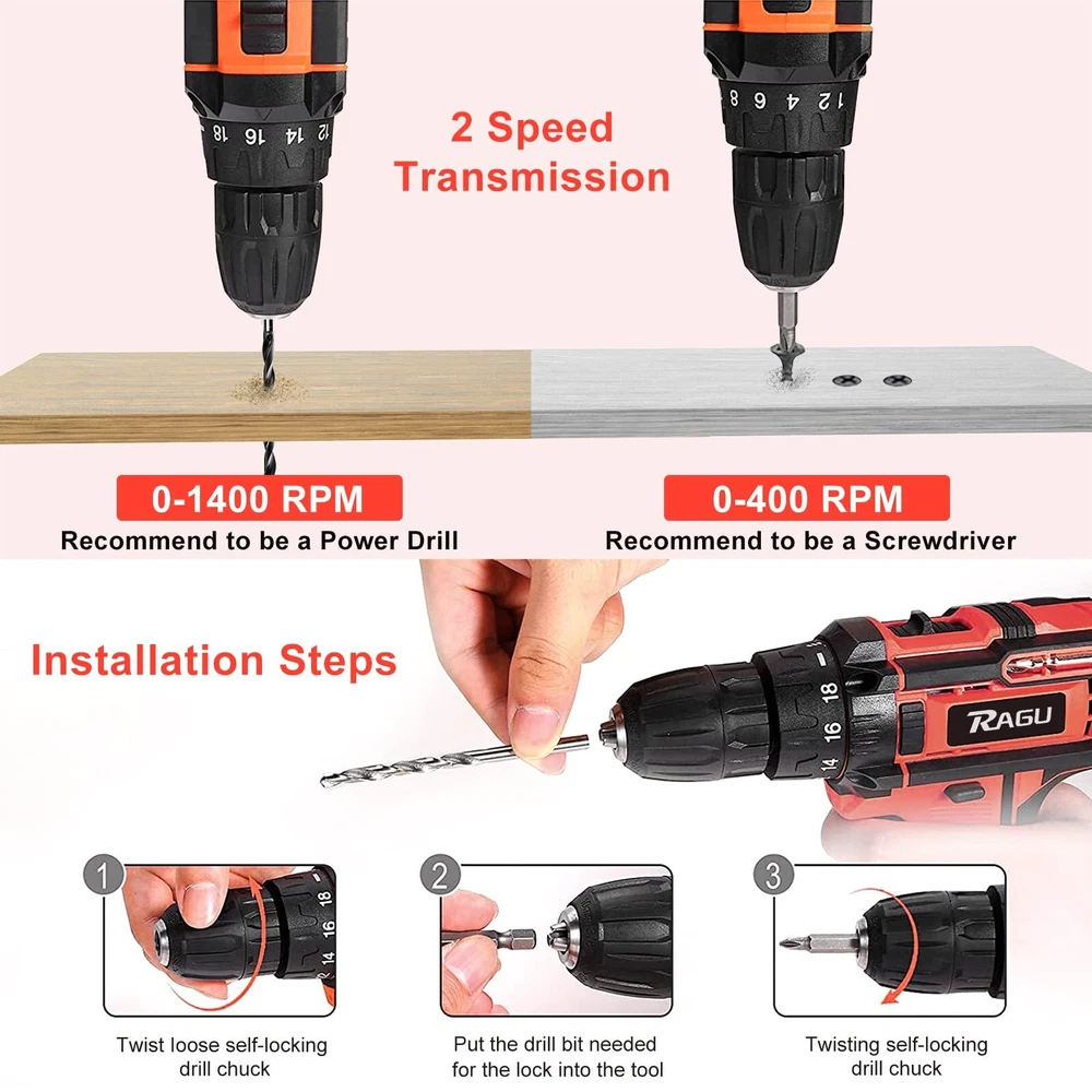 Cordless Drill 12v, 34pcs Drill Driver Set with 2 Batteries, Drill Set with 2 Variable Speed 3/8'' Keyless Chuck for Drilling Wood, Ceramics ✅【Efficient & Lightweight】The most compact and lightweight drill set in 12.6V-class with amazing performance-to-weight ratio, minimizes fatigue in most daily jobs; Rubber-covered handle with ergonomic design provides maximum comfort grip for being breezily operated in one hand and less vibration; it maneuverable and simply easy to use for women, not to mention for men. Trigger-activated LED light illuminates any enclosed workspace. ✅【2 Batteries & Powerful Power】The 12.6V cordless drill set came with 2pcs 1500mAh Batteries and 1-2H fast charger that can be used for strong and steady power and an endurable run time. Industrial copper motor provides powerful power. The top two clutch setting reaches a maximum speed of 1350rpm for various fastening mount and drilling uses.【Please Note that unplug the battery after fully charged to extend battery life.】 ✅【18+1 Clutch & 2-Variable Speed】The power drill set with 18 different torque settings allows you to control the drill precisely when drilling wood, plastic and other materials. 2- Variable Speed (0-400RPM and 0-1350RPM) fits the wide range of drilling and screw driving applications. Our power drill set will be an indispensable tool in your daily life. ✅【3/8" Keyless Chuck & Forward/Reserve Control 】Our electric drill/driver is bulit with a 3/8" (10mm) keyless chuck providing an automatic spindle lock that enables one-hand changing with advance accessory compatibility. The Forward/Reverse switch allows you to either screw or replace/remove bits on your purposes. The maximum torque reaching 30Nm, ideal for different applications, no matter it is home improvements, household construction, or DIY projects. ✅【34pcs Accessories & Carrying Case】34pcs accessories meet the needs of most kinds of work. You will get 1 x RAGU Cordless power drill, 2 x 1.5 Ah Li-on Batteries, 9 x Socket Wrench (5-13 mm) and other necessary accessories, totally reaching 34 pieces. A sturdy case to keep the drill and all of its accessories organized. The power drill kit is perfect for your home use or gifts. Shipping We offer FREE shipping on all orders! We use a selection of shipping services such as UPS, FedEx, USPS etc. We only ship to the lower 48 states, no APO/FPO addresses or PO Boxes allowed. Local pickups and combined shipping options are not provided at this time. Return You can return a product for up to 30 days from the date you purchased it. Any product you return must be in the same condition you received it and in the original packaging. Please keep the receipt. Payment We accept payment by any of the following methods: PayPal Please pay as soon as possible after winning an auction, as that will allow us to post your item to you sooner! Feedback Customer satisfaction is very important to us. If you have any problem with your order, please contact us and we will do our best to make you satisfied. Contact Us If you have any queries, please contact us via ebay. We usually respond within 24 hours on weekdays. Please visit our eBay store to check out other items for sale! Thank you for shopping at our store.