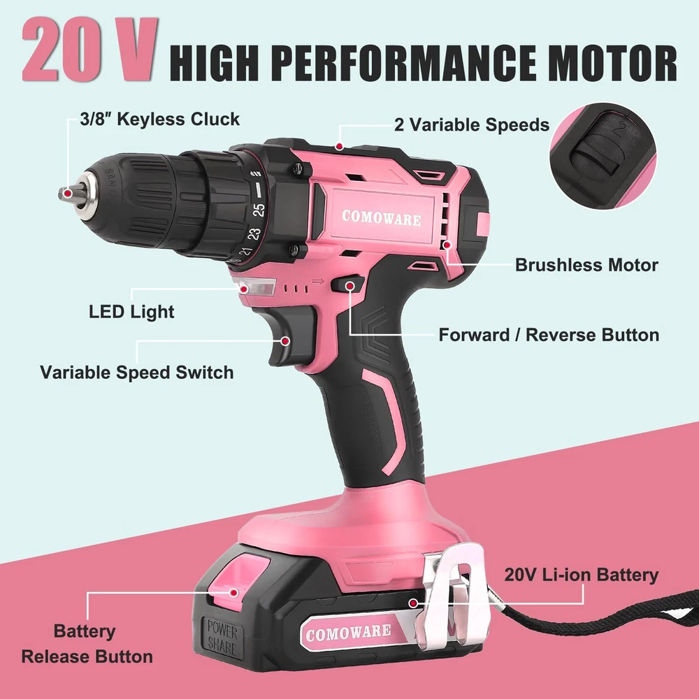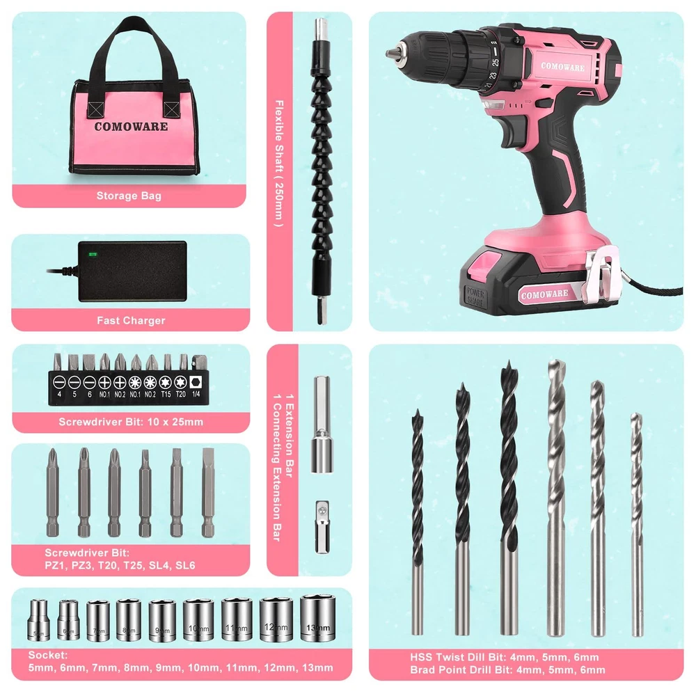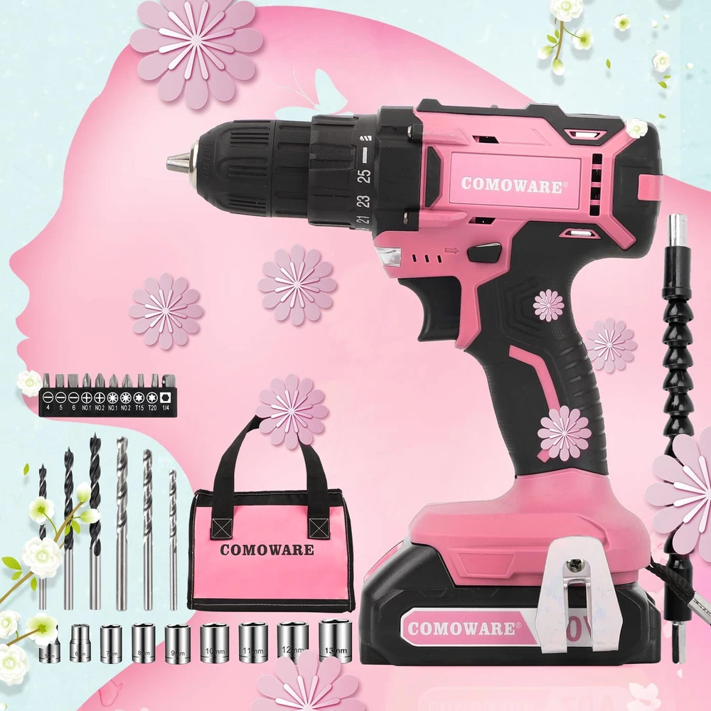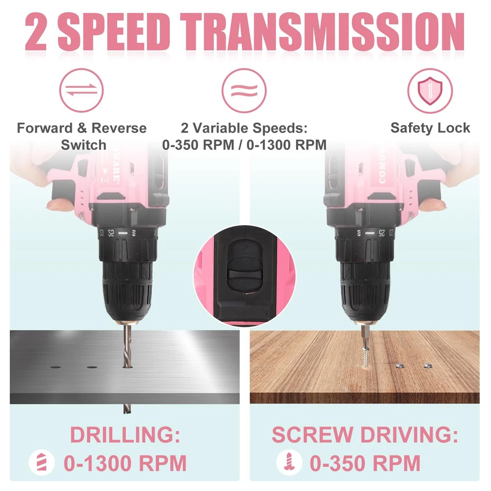 【Perfect Gift Idea】 Wrapped in a pink gift box, this pink drill set is a decent gift for loved , parents, children or friends. A great Holiday/Birthday/Christmas/Mother or Father’s day gift for women, men, girl, daughter, home owners or tool lovers. 【20 Voltage & 2 Variable Speeds】 Higher voltage means more torque-spinning strength to overcome resistance. This 2 variable-speed ( 0-350 & 0-1300 RPM ) cordless drill with an adjustable clutch gives you the versatility for drilling different materials and using a variety of bits. The low speed is for driving screws, the high speed is for drilling holes. 【25+1 Position Clutch & 266 In-lbs Max Torque】 This cordless drill's clutch provides precise control for drilling, which helps to prevent sinking a screw too deep, stripping out the head of a screw or even breaking a screw shaft. 25-Torque allows for various applications and additional 1-torque for drilling. 【1500mAh Batteries & 60min Fast Charger】20V 1500mAh Lithium-Ion battery packed with higher capacity indicator lets you finish your job smoothly with long lasting performance. 1.5A 1-hour fast charger keeps your drill constantly running. 【34 Pcs Drill Bits Accessories & Storage Bag】Our cordless drill/ driver kit includes 34 Pcs accessories: 3 x HSS Twist drill bits, 3 x Brad Point drill bits, 17 Screwdriver bits, 9 x sockets, 1 x extension bar for sockets, 1 x Flexible Hex Shaft. A storage bag is also included, suitable for home Improvement & DIY Project.