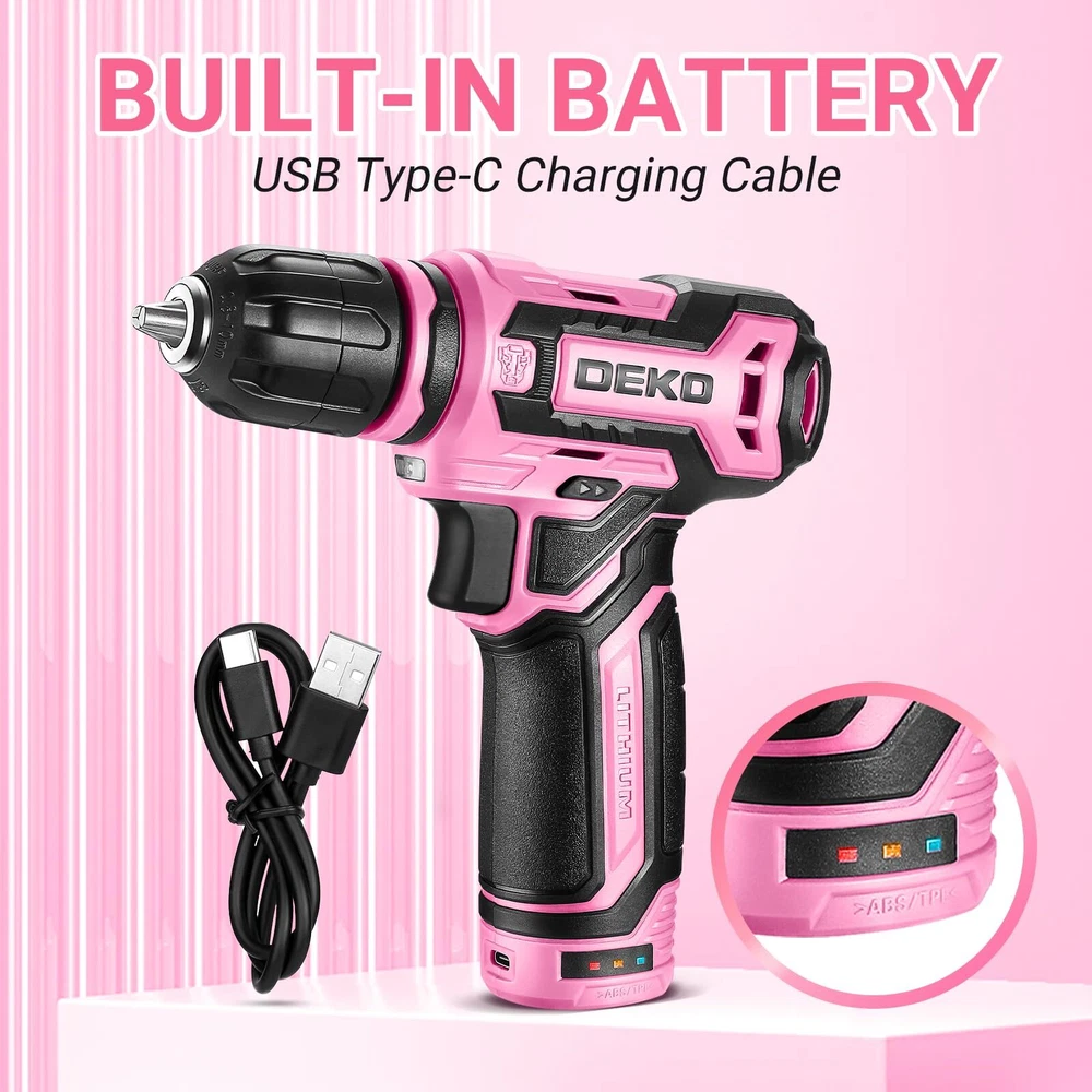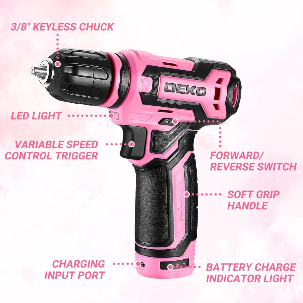 【Multi-function Cordless Drill】 The 12 V Cordless Drill with LED Light -Get the job done with ease and precision. Suitable for drilling in wood and plastic, and also for tightening/loosening screws. Built-in LED light for improved visibility in dark areas.This cordless drill is perfect for DIY projects and home maintenance 【Be a Handy Women】 The net weight of the pink drill is only 1.65 pounds,you can easily operate it with one hand. Its ergonomic design allows for easy handling and maneuverability, making your drilling tasks comfortable and effortless.It is a very suitable drill set for women to do general DIY 【High-Performance Power Drill Set】This cordless drill offers a maximum no-load speed of 800 r/min, providing fast and efficient drilling performance. Push the switch, step less speed change, work as you wish. The Forward/Reverse switch allows you to tight/remove bits for your purposes 【Rechargeable Battery drill】This electric drill is supplied with a type-C 1.5 A charging cable. You can connect it to a universal charger or USB output to charge the small drill.Battery-powered drill with rechargeable battery for cordless convenience 【Package Included】This drill set include 1*12 V Cordless Drill; 1*Type-C Charge Cable ;13 Pcs Accessories: 1*Magnetic Bit Holder(60 mm), 6*Twisted Drill Bits(2,2.5,3,4,5,6 mm) , 6*Screwdriver Bits(SL4, SL6, PH1, PH2, PZ1, PZ2 ); 1 * User Manual