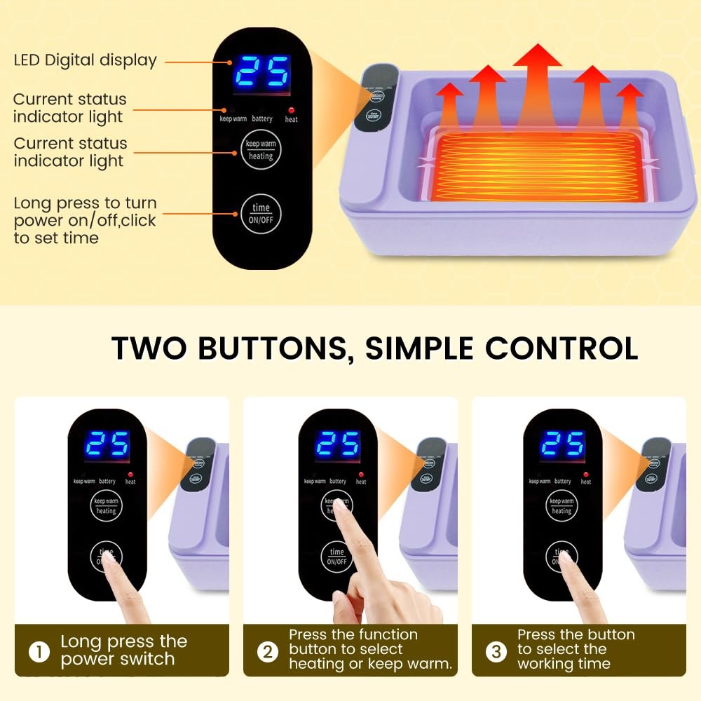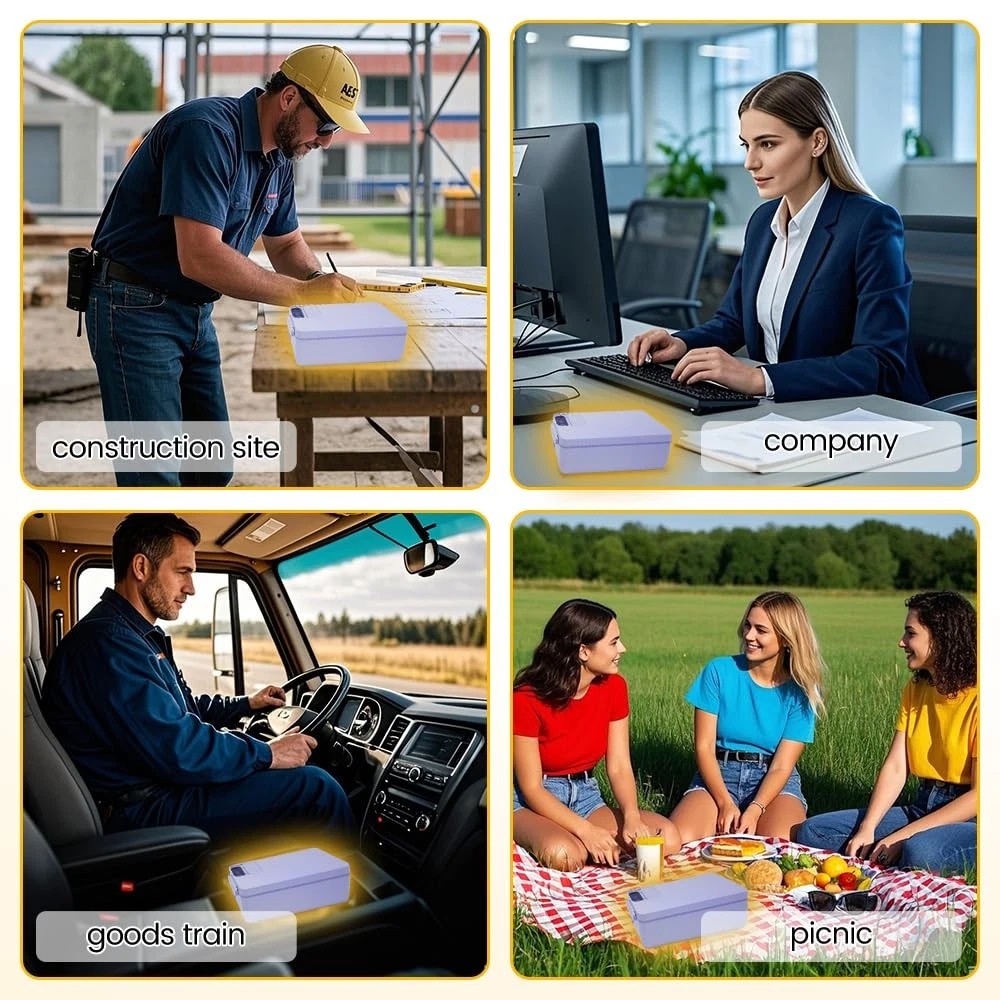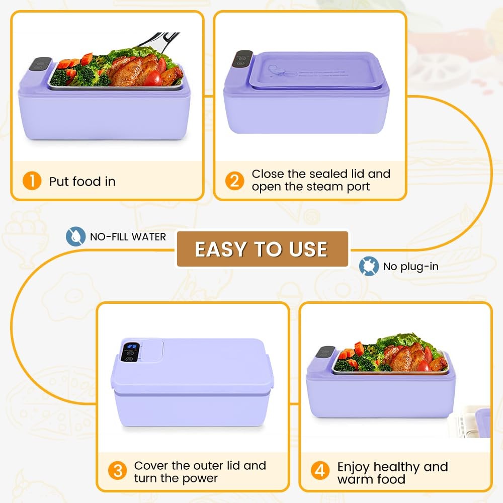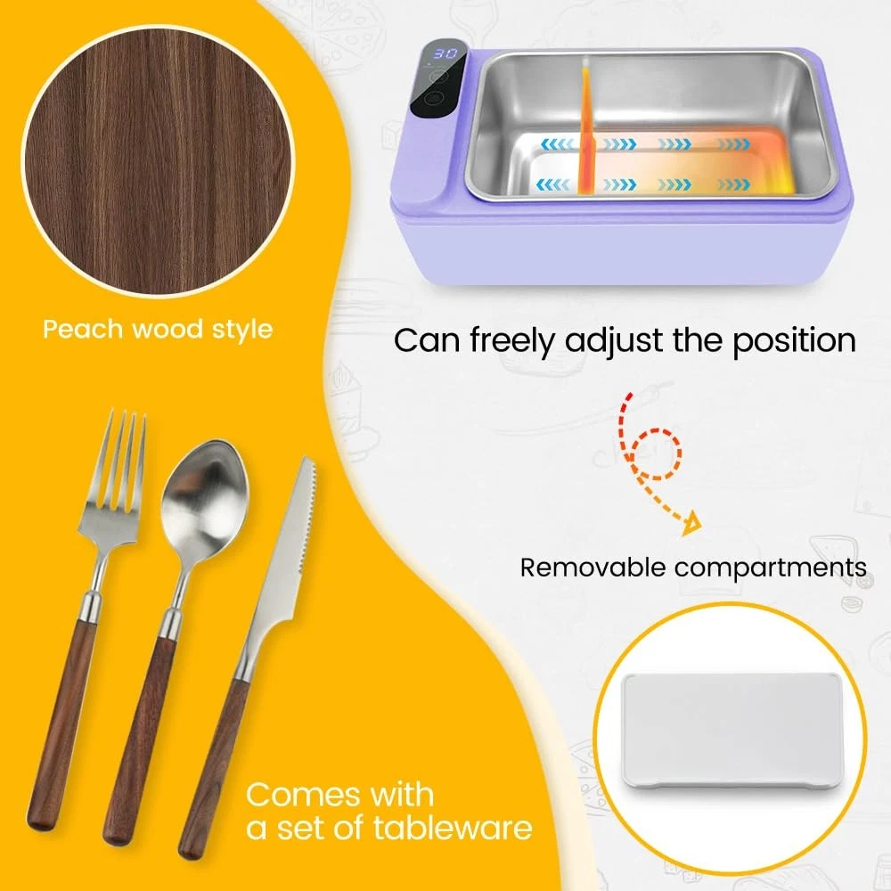 Cordless Electric lunch box, Battery Powered Heated Lunch Box,Food Heate 1L Adjustable heating time Comes with tableware and insulated bag Used for trucks, camping, offices 【Battery - powered, USB - rechargeable】The Electric Lunch Box is equipped with a built - in rechargeable battery. This allows you to heat food without having to search for a power source, enabling you to heat food at any time. 【Intelligent Heat Preservation and Timed Heating】The cordless electric lunch box offers multiple heating time options (from 10 to 60 minutes), and the heat preservation function provides various heat preservation time options (from 30 minutes to 4 hours) to meet your different requirements. 【High - quality Materials and Excellent Leak - proof Sealing Design】The cordless electric lunch box is crafted from food - grade 304 stainless steel. The top lid adopts a double - seal design with buckles and silicone, ensuring that food will not spill. 【Multiple Accessories】We provide a set of peach - wood - style tableware, a USB charging cable, an insulation bag, and a removable partition to solve all your usage problems. 【Please Note】The built - in 12000mAh battery takes 6 - 8 hours to fully charge, and it needs to be charged approximately every 1 - 2 uses. If you encounter any initial defects, please in a timely manner through "Order History" - "Seller" to seek a solution.