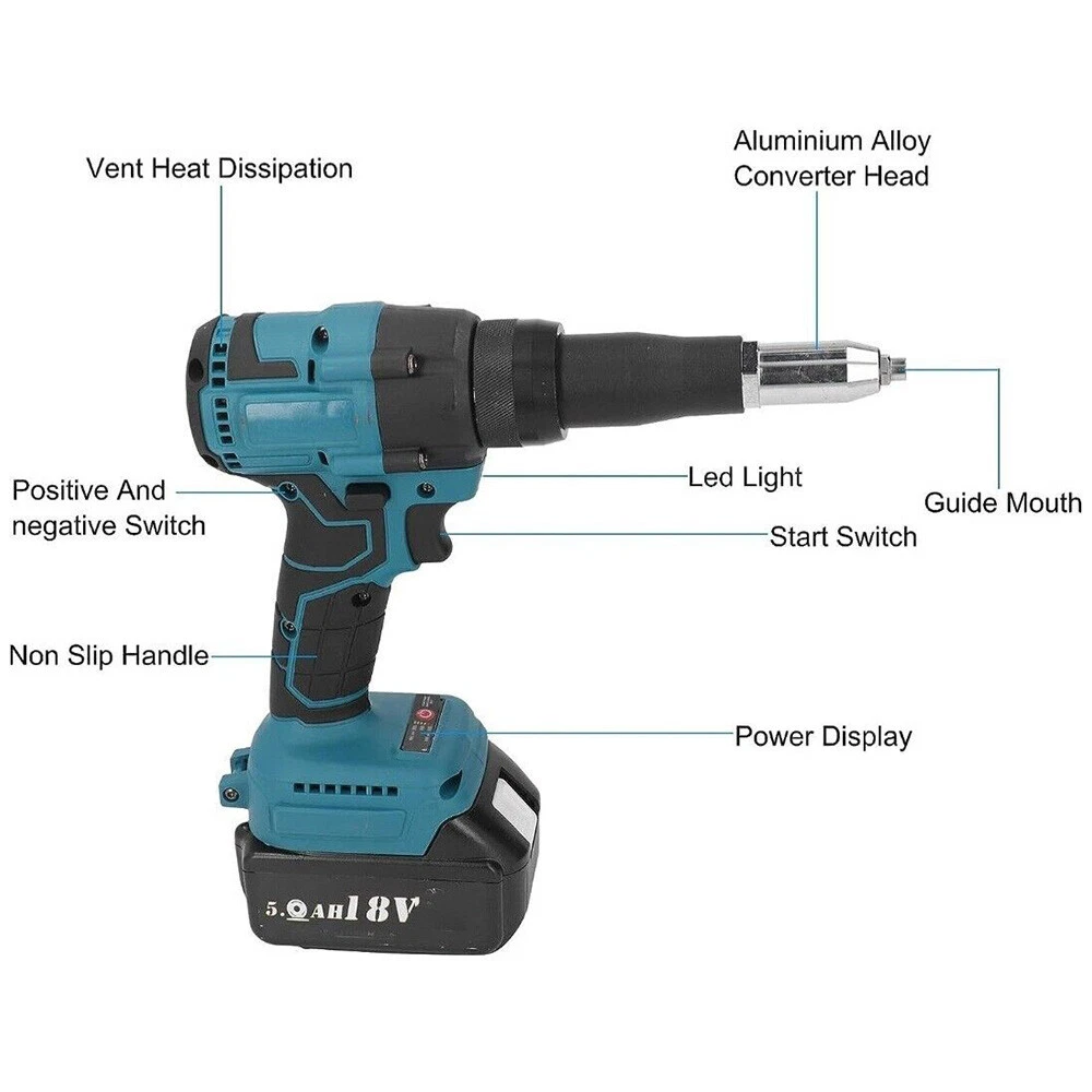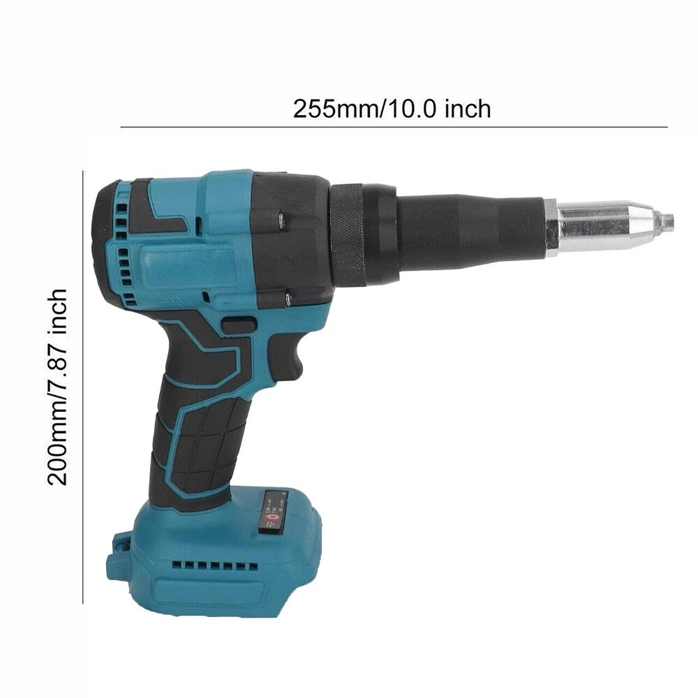 Note: Battery And Charger Not Included Suitable for Makita 18V lithium battery 18V: BL1815 BL1830 BL1840 BL1845 BL1860 and so on Tips: BL1415G BL1430G BL1815G BL1830G and all G series battery is not supported Specification: Brushless Electric Rivet Gun Maximum Output Power: 360W Maximum Pulling Tension: 10000N Stroke: Approx. 20mm / 0.79in Applicable Rivet Specifications: Approx. 2.4-4.8mm / 0.1-0.2in Package List: 1 x Rivet Gun 1 x Wrench 1 x Instruction Manual