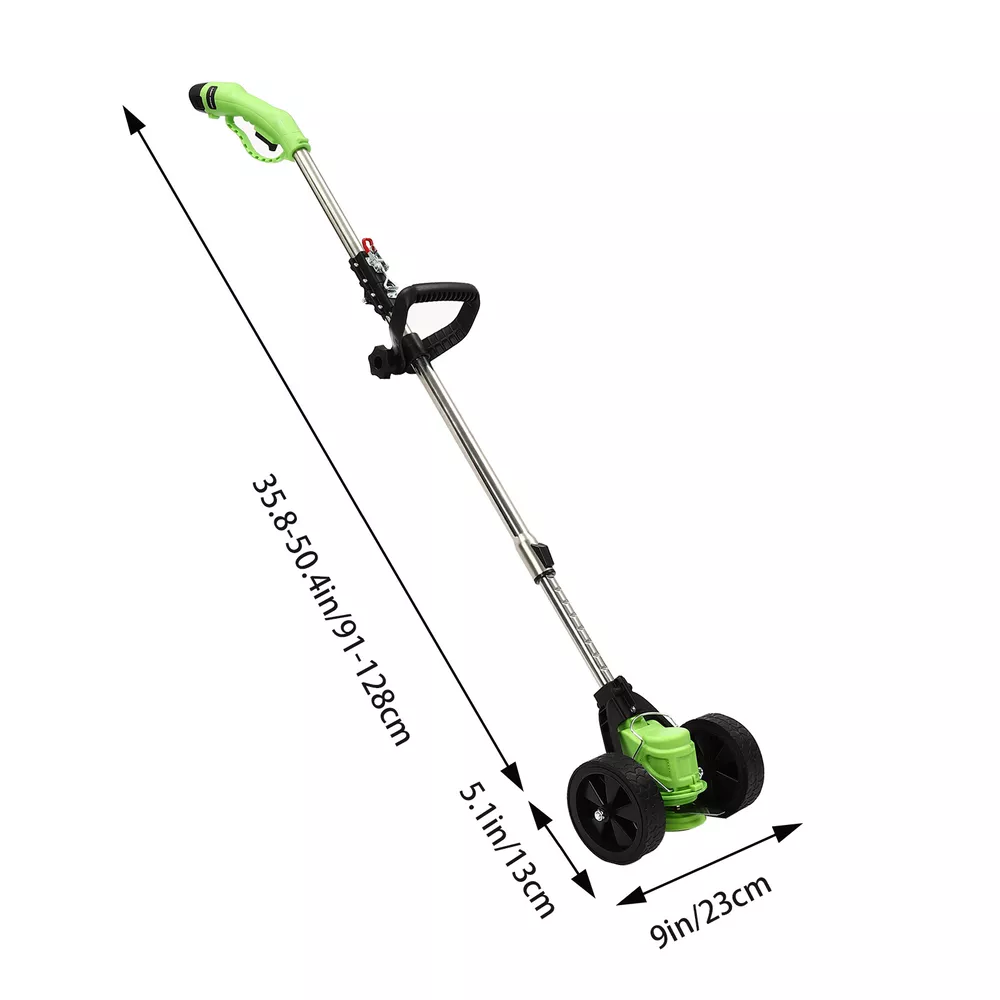 Specifications Material: ABS, Alloy, Plastic, Stainless Steel Color: Black, Green Style: Modern Plug Type: US Standard Motor Type: Pure Copper Motor Power Source:Battery Powered Assembly Required: Yes AC: 100-250V 47-63Hz Current: 0.8A Output: 12.6V-1A Max. Motor Power: 200W Battery Type: 1*3 Cells 1300mAh Li-ion Battery (Included ) Rotational Speed: 12000R/min Operating Lever Adjustable Height: 0.9-1.25m/2.95-4.1ft Circular Saw Blade Diameter: 10.2cm/4in Charging Time: 30min Working Time: 25min Head Adjustable Angle: 90° Product Height: 0.91-1.28m/3-4.2ft Each Wheel Diameter: 13cm/5.1in Distance Between Two Wheels: 23cm/9in Gross Weight: 1.8kg/4lbs Package Size: 89*15*15cm/35*5.9*5.9in Package Included 1* Cordless Grass Trimmer 8* Blades 1* Battery 1* Battery Charger Cordless Foldable Lithium Mower W/ Wheels Green Mini-mower Grass Trimmer Yard Description Traditional trimmers that are gasoline -powered or need to be plugged in for use are uneconomical and more restrictive in use. Our cordless grass trimmer with rechargeable lithium battery and high-strength blades is an excellent assistant for you to prune lawns and care for your lawn and garden . Key Features High-quality Material: The product is mainly made of ABS, alloy, plastic, and stainless steel, which has high hardness, corrosion resistance, high-temperature resistance, impact resistance , and long service life. High Efficiency: The high-quality 200W pure copper motor provides the product with super high unloaded speed (12000rpm), and the 4in-diameter saw blade can provide you with a wider cutting range, thus improving your work efficiency. Convenient to Use: It is equipped with three different types of blades to meet different work needs. Plastic blades are suitable for trimming garden lawns. The leaf-shaped alloy blade is suitable for trimming weeds in complex terrain. The circular alloy saw blade can be used to cut crops, shrubs, etc. Safety Protection: The grass guard can effectively prevent the broken grass from splashing around when mowing the lawn and prevent accidental trimming of plants, lawn decorations, and other sensitive areas of your yard, together with gloves and goggles, ensuring your safety. The safety switch can prevent accidental start-up and ensure user safety. You need to simultaneously press the safety button and the switch to start the machine. Comprehensive Mowing: You can press the button on the head to adjust the angle at 90° for flexible weed removal in edges and corners, and it will automatically be locked when you release the knob. Automatic Line Feed: The grass trimmer can automatically feed the line as needed and works smoothly without interruption. Cordless Convenience: With one 3 cells 1300mAh li-ion battery allowing for almost 25 minutes of continuous working after about 30 minutes of charging , you can cover larger areas without the hassle of tangled cords or cords reaching their limit. The equipped charger ensures timely charging for the battery. User-friendly Design: The operating lever can be adjusted to different lengths (2.95-4.1ft) by the telescoping button to meet the needs of people of different heights, avoiding bending down and reducing the burden on your waist. It weighs only 4 lbs, allowing for operation with one hand, even for the elderly and women. Easy to Move and Store: It is foldable and comes with two wheels, making it easy for you to move and store it, taking up less space. Guaranteed Customer Service: Our friendly customer service team would be happy to solve your issues with our product. If you have any issues, please feel free to reach out to us. Details Grass Retaining Ring: It prevents the rolled grass, reduces the failure rate of the product, and protects it for a long time. Auxiliary Handle: It's comfortable with a non-abrasive grip and you can adjust its position as you like, bringing you more convenience during operation. Heat Dissipation Hole: The heat-sink holes on the housing can effectively speed up the heat dissipation of the motor to ensure smooth and efficient operation. Application It's suitable for yard trimming, park greening, home lawn mowing, landscaping, orchard pruning, tea garden pruning, forestry cutting, cutting rice/wheat/corn stalks/bush/reed/barley, etc. How to Install Install the grass guard and rotate to the right. Tighten with a wrench. Install the blade. Mount nuts& washers. Tighten with a wrench head. Fasten the two wheels to the left and right sides of the operating lever. Fix with screws. Specifications Material: ABS, Alloy, Plastic, Stainless Steel Color: Black, Green Style: Modern Plug Type: US Standard Motor Type: Pure Copper Motor Power Source:Battery Powered Assembly Required: Yes AC: 100-250V 47-63Hz Current: 0.8A Output: 12.6V-1A Max. Motor Power: 200W Battery Type: 1*3 Cells 1300mAh Li-ion Battery (Included ) Rotational Speed: 12000R/min Operating Lever Adjustable Height: 0.9-1.25m/2.95-4.1ft Circular Saw Blade Diameter: 10.2cm/4in Charging Time: 30min Working Time: 25min Head Adjustable Angle: 90° Product Height: 0.91-1.28m/3-4.2ft Each Wheel Diameter: 13cm/5.1in Distance Between Two Wheels: 23cm/9in Gross Weight: 1.8kg/4lbs Package Size: 89*15*15cm/35*5.9*5.9in Package Included 1* Cordless Grass Trimmer 8* Blades 1* Battery 1* Battery Charger 1* Goggles 2* Wheels 1Pair* Gloves Other Accessories for Assembly Notes Please charge the batteries fully before the first time you use this product. Please pay attention to safety in use, wear protective measures, stay away from the crowd and your body, and avoid being injured by the blade. Please unload the battery immediately after use to keep the power off. It is forbidden to replace the blade when the power is on! Please allow the slight color difference caused by the shooting light and 1-3cm error due to manual measurement, and make sure you do not mind before you order. Payment Delivery details Terms of sales About us Contact us Payment We accept ebay payment 。 Fees such as import