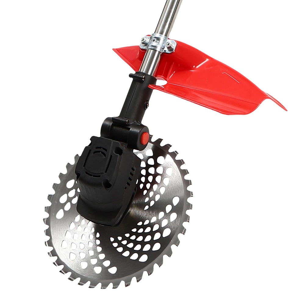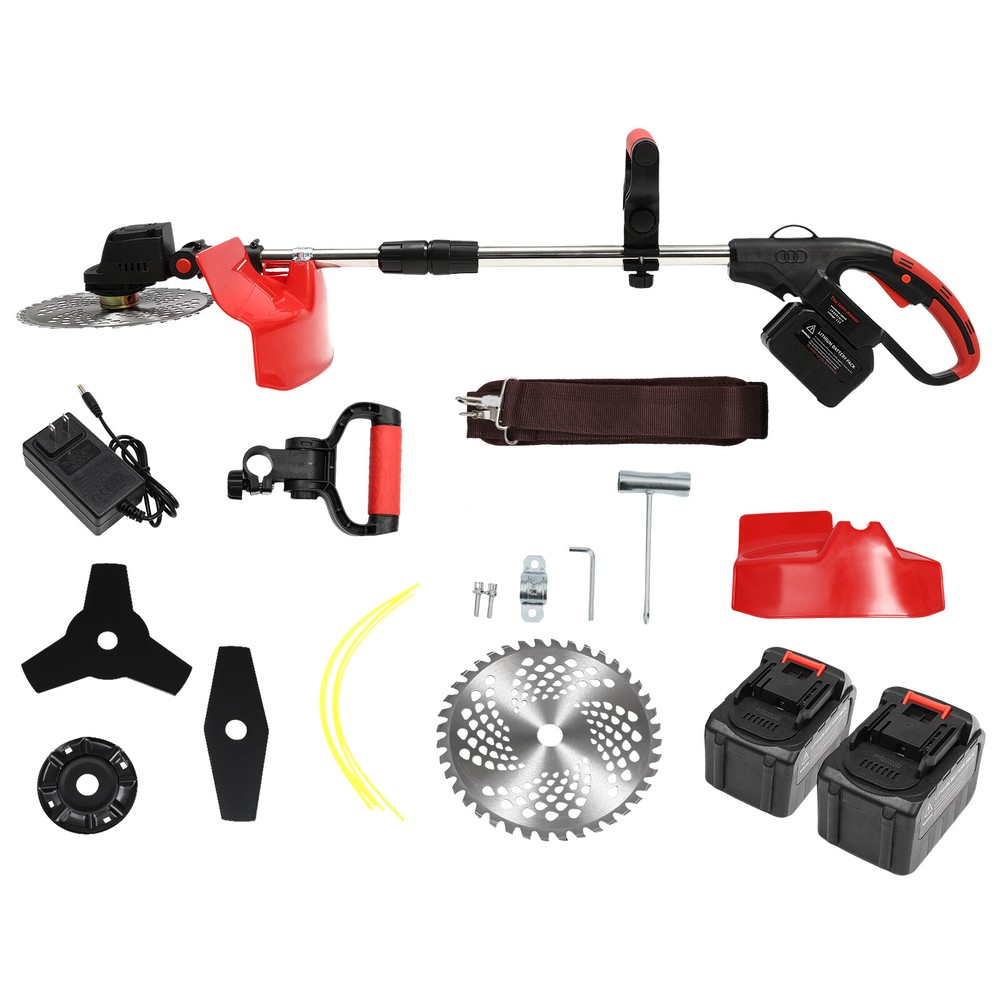 Cordless Grass Trimmer Lawn Grass Brush Cutter Blade Whipper Snipper + 2 Battery Description Traditional trimmers that are gasoline-powered or need to be plugged in for use are uneconomical and more restrictive in use. However, there is a new type of trimmer, the rechargeable lithium trimmer, which is gradually becoming more and more popular. You only need to fully charge the battery to start working. This is not only convenient but also reduces the pollution of the environment. Using our cordless weed trimmer helps keep your lawn and garden healthy. It will be your powerful trimming assistant! Specification Color: Red, Black Style: Brushless Rechargeable Material: Copper, Alloy, Steel, Plastic Assembly Required: Yes Load Time: 50 h Number of Batteries: 15 Operating Voltage: 21V Battery Type: 15 Cell 30000mAh Li-ion Battery ( Included ) Number of Batteries: 2 Operating Rod Telescopic Range: 90-130cm/35.43-51.18in Plug Type: US Standard Plug Voltage: 100-250V 47-63Hz 0.8A Output: 21VF-198VF 1A Power: 1800W Endurance: 1 h Charging Time: Approx. 6 h Maximum Speed: 18000rpm Adjustable Angle of Blade Head: 90° Power Type: Rechargeable Lithium Battery Gross Weight: 4.12kg/ 9.08 lbs Net Weight: 3.6kg/ 7.94 lbs Package Size: 25*13*102 cm/9.84*5.12*40.16 in Product Length: 1.3m/ 4.27ft Saw Blade Diameter: 20cm/7.87 in Package Included 1 * Cordless Weed Trimmer 1 * Alloy Blade 1 * Long Blade 1 * Three-tooth Blade 4 * Weeding Ropes 1 * Charger 2 * Lithium Batteries 1 * Carrying Strap 1 * Goggle 1 * English Manual All Accessories for Installation Key Features High-quality Material made of copper core brushless motor, alloy saw blade, steel pipe, and plastic, with high hardness, high wear resistance, anti-corrosion, and anti-rust performance Powerful Battery two 30000mAh lithium-ion batteries with over-charge and overload protections can provide longer battery life without frequent charging Adjustable Head After pressing the adjustment button, it can freely adjust the blade angle within 90°, making it easy to clean various weeds in corners. Complete Accessories Alloy saw blade, long blade, three-tooth blade, and weeding ropes can be used to cut branches, hard shrubs, young grass, lawns, etc. to meet your various pruning needs Free Telescoping The operating lever can be adjusted to different lengths (35.43-51.18in) by the telescoping clip to meet the needs of people of different heights. High Comfort The cordless design allows you to effectively reduce the restrictions. The auxiliary handle with an adjustable position allows you to freely and conveniently control it Powerful Battery: The two 30000mAh lithium-ion batteries with over-charge and overload protections can provide longer battery life without frequent charging and worrying about insufficient electricity that affect your work. The equipped charger can help recharge the two batteries to save money and energy. High-quality Material: This product is mainly made of copper core brushless motor, alloy saw blade, steel pipe, and plastic, with high hardness, high wear resistance, anti-corrosion, and anti-rust performance. And the brushless design gives it a long load capacity and saves time and money on carbon brush replacement. High Comfort: The cordless design allows you to effectively reduce the restrictions. The auxiliary handle with an adjustable position allows you to freely and conveniently control it, making it easier to mow the lawn. Its noise-canceling design also provides you with a more comfortable and quiet operating environment. High Efficiency: The high-quality copper core brushless motor with power up to 1800W provides the product with super high unloaded speed (18000rpm), and the blade diameter of 7.87 inches can provide you with a wider cutting range, thus improving your work efficiency. Easy to Carry: The lightweight (7.94 lbs), carrying strap, and detachable design make it easy to carry, making it suitable for a variety of mowing jobs both outdoors and indoors. Safe and Reliable: Compared to conventional trimmers, rechargeable lithium-ion trimmers do not require the use of fuel, thereby reducing the risk of causing fires and explosions. Also, both the battery and motor have overheat protection settings to keep users safe during operation. The goggles also protect your eyes from foreign objects during use. Adjustable Head: After pressing the adjustment button, it can freely adjust the blade angle within 90°, making it easy to clean various weeds in corners. Complete Accessories: Alloy saw blade, long blade, three-tooth blade, and weeding ropes can be used to cut branches, hard shrubs, young grass, lawns, etc. to meet your various pruning needs. Free Telescoping: The operating lever can be adjusted to different lengths (35.43-51.18in) by the telescoping clip to meet the needs of people of different heights. Details Heat Dissipation Hole: The heat dissipation hole on the housing can effectively speed up the heat dissipation of the motor, so as to ensure smooth and efficient operation. Double Control Safety Switch: The dual control switch can prevent accidental start-up, making your safety more secure. Grass Baffle: It can effectively prevent the broken grass from splashing around when mowing the lawn, thus making it easier to clean up the lawn after mowing and ensuring your safety. Application This product is suitable for home lawn mowing, landscaping, orchard pruning, tea garden pruning, cutting rice and wheat, cutting corn stalks, etc. Notes Please charge it fully before the first time you use it. Please pay attention to safety in use, wear protective measures, stay away from the crowd and your body, and avoid being injured by the blade. Please unload the battery immediately after use to keep the power off. It is forbidden to replace the blade when the power is on! Please distinguish the front and back side of the circular saw blade when installing, the reverse will cause the product can not operate properly. Please read the ope