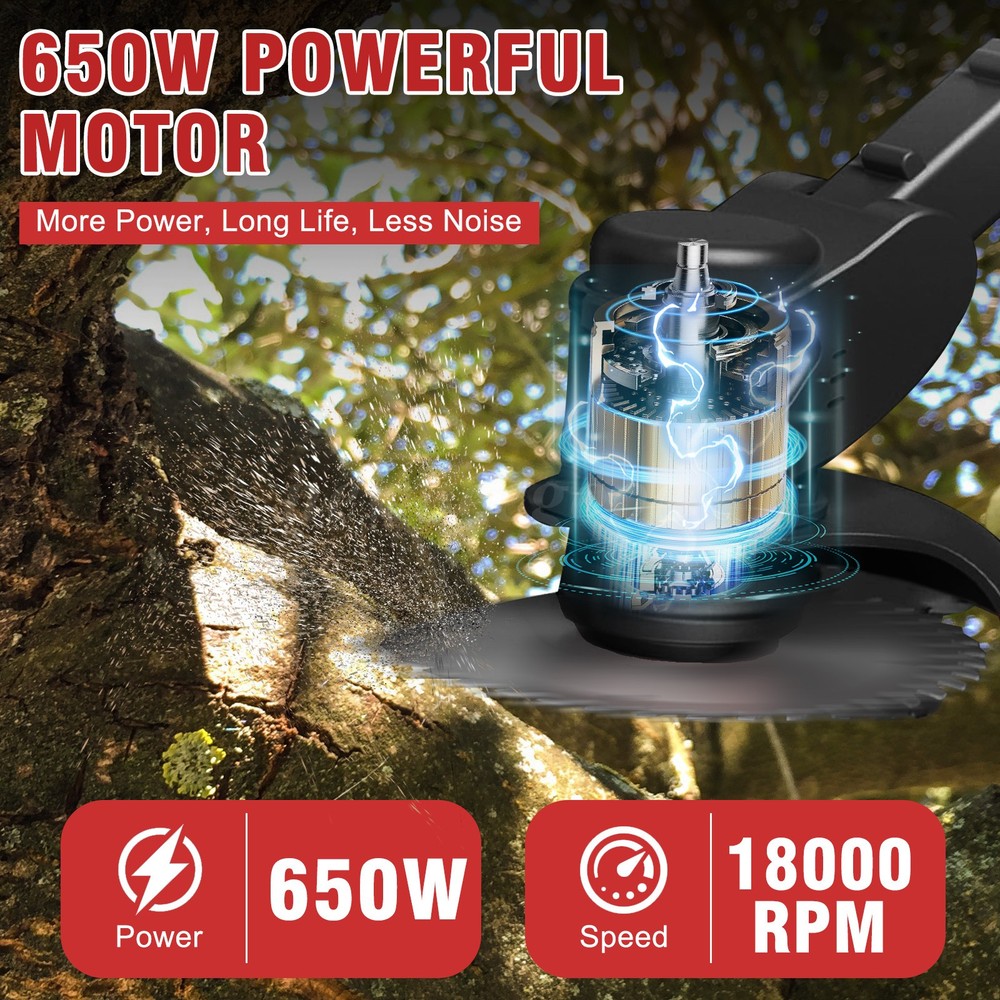 s Description: Our new cordless weeder incorporates cutting-edge technology for an unparalleled pruning experience. The large capacity battery gives it lasting power, coupled with high-speed motor, no-load speed up to 18,000 RPM, easy to meet various pruning challenges. The telescopic rod design is flexible and can be up to 50 inches in length to meet the needs of users of different heights and make trimming more comfortable. The rotating baffle effectively prevents the spray of weeds and ensures a clean and orderly pruning process. This mower is equipped with three blade types, grass rope, flat blade, manganese steel circular saw blade, easily respond to different lawn and plant pruning needs. Whether it is a small garden or a villa lawn, this cordless weeder can easily perform. Choose a new cordless lawn mower to refresh your lawn and open a new chapter in green life! Specification: Type: Lawn Mower Material :ABS + metal Color: Red + black Battery: Lithium battery, 24V, 2000mAh(inclusive) Power: 650W Speed :18000 RPM Blade diameter :150mm Straight side diameter :146 mm Each run time is 45 minutes, and two batteries are 90 minutes Charging time: about 120 minutes Features: -💪 【Strong power, long-lasting battery life】 This new cordless weeder is equipped with a large-capacity battery, which makes your cutting work more powerful and longer-lasting. Professional-grade power motors and drives, with no-load speeds up to 18,000RPM, can easily cope with a variety of lawn mowing needs, so that your lawn will always be clean and beautiful. The telescopic stem of this weeder is longer than that of the Weed Wacker in the general market, and the entire length can reach 50 inches after stretching, so even tall people can easily use it, no need to bend over, and enjoy a more comfortable mowing experience. -💪 【Rotate the baffle to prevent splashing】 During the pruning process, weed splashing is a problem that many people will encounter. This weed mower is equipped with a swivel baffle design that effectively prevents weeds from splashing and makes your mowing work more tidy. At the same time, the machine head can also be adjusted freely from 0 to 90°to ensure that it can adapt to the most complex working environment, making your pruning work more convenient. -💪 【Three kinds of blades, to meet different needs】 In order to meet the pruning needs of different users, we provide three types of metal blades: weeding rope is suitable for mowing soft grass; Flat blades are suitable for pruning fine branches, weeds, and small shrubs; Manganese circular saw blades are suitable for pruning thicker shrub branches. With a simple blade change, you can handle a variety of pruning needs and keep your garden neat and organized. -💪 【Applicable to multiple occasions】 This cordless weeder is not only powerful, but also easy to operate. It is suitable for small gardens, villas, and other scenes, making your pruning work more convenient and quick. With the time saved, you can enjoy the beautiful garden time with your family and feel the beauty of life. Package Contents: 1* Lawn mower 2* Saw blades 5* White plastic blades 4* Metal blades 1* Handle 2* Batteries 2* Wheels 1* US charger 1* Goggles 1* User manual Note: 1. Please allow slight differences due to manual measurement. 2. Due to different monitors and lighting, the picture may slightly differ from the actual product. 3. Product details may vary due to different production batches. If you mind the difference, please purchase with caution. Thank you for your understanding. 4. If you have any questions about the product, please contact us. On Jul 18, 2025 at 06:06:27 PDT, seller added the following information: