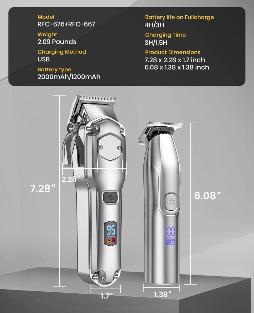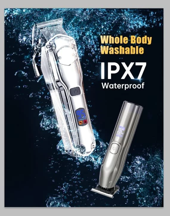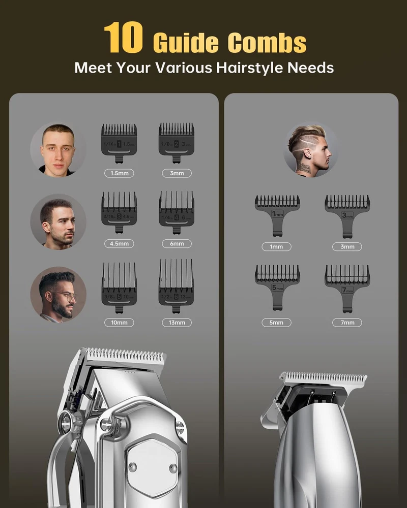 All In Clippers and Trimmers Set : Our professional hair clippers kit are designed specifically for home users with precise cuts, and we cooperation with families around the world , easy to use. It can easily trim fading,blending,art carving,sideburns,edges and hair cutting.Give you a perfect grooming experience like in a hair salon.Also suitable for barbershop Detail Trimmer For Fading & Blending : The hair clippers adjustable taper lever offers precise control (0.8-2mm),the T-blade trimmer accurately to 0.1mm, and we offer hair clippers 6 guide combs (1/16”, 1/8”, 3/16”, 1/4”, 3/8”, 1/2” ),and 4pcs hair trimmer guide combs (1,3,5,7mm) makes it more suitable for blending and fading precision short cuts Sharp Stainless Steel Blade : mens hair clipper adopt precision carbon steel blades, more sharper. It is strong enough to cut through your hair like butter without pulling your hair.the precision ground blades cut through all hair types and stay sharp longer LED Display& Long Battery Life : Our cordless hair clippers allows for flexibility during haircuts. Built-in 2000mAh high-capacity battery can run for at least 4 hours after 3 hours of charging.LED display, allowing you to know the power at any time Heavy Duty Motor : Our clippers for hair cutting is equipped with a heavy-duty motor 6800 RPM,cut through even the thickest hair easily and efficiently.The motor is also quiet, which ensures a peaceful and comfortable hair cutting experience IPX7 Waterproof & Easy to Clean : The hair clippers for men with 𝐈𝐏𝐗𝟕 𝐰𝐚𝐭𝐞𝐫𝐩𝐫𝐨𝐨𝐟 𝐝𝐞𝐬𝐢𝐠𝐧. You can rinse directly under the tap for easier cleaning.The clipper is also lightweight ,making it perfect for both barber and home use Idea Gift Choice : clippers and trimmer set is perfect for family use. Also a good choice as Father's Day gifts, birthday gifts, Christmas gifts New Year's gift for your friend, husband, father, brother What You Get : With a clipper,t-blade trimmer,10 guide combs for hair clipper and 4 guide combs for detail trimmer,lubricate oil, cleaning brush and barber apron ,𝟐 𝐮𝐬𝐛 𝐜𝐚𝐛𝐥𝐞.Includes everything you need to trim your hair