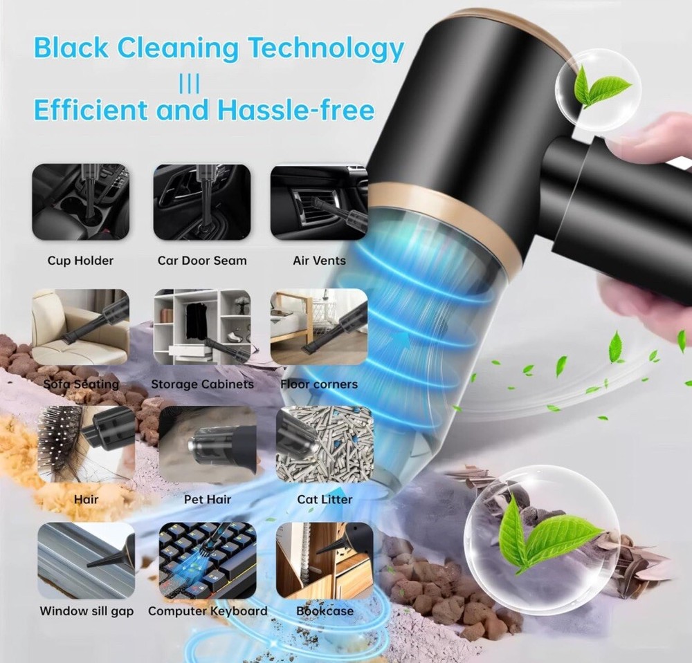 This handheld vacuum is a game-changer for quick cleanups! The 9000Pa suction power easily picks up crumbs, dust, and pet hair from cars, sofas, and tight spaces. Love that it's cordless and lightweight—no more struggling with bulky vacuums. The battery lasts long enough for a full car clean, and the HEPA filter keeps dust trapped. Super convenient with multiple nozzles for different surfaces. Works great in the office too—super quiet and efficient! Highly recommend for hassle-free cleaning on the go.