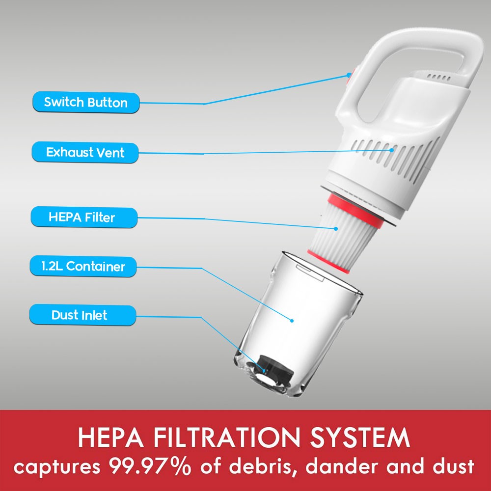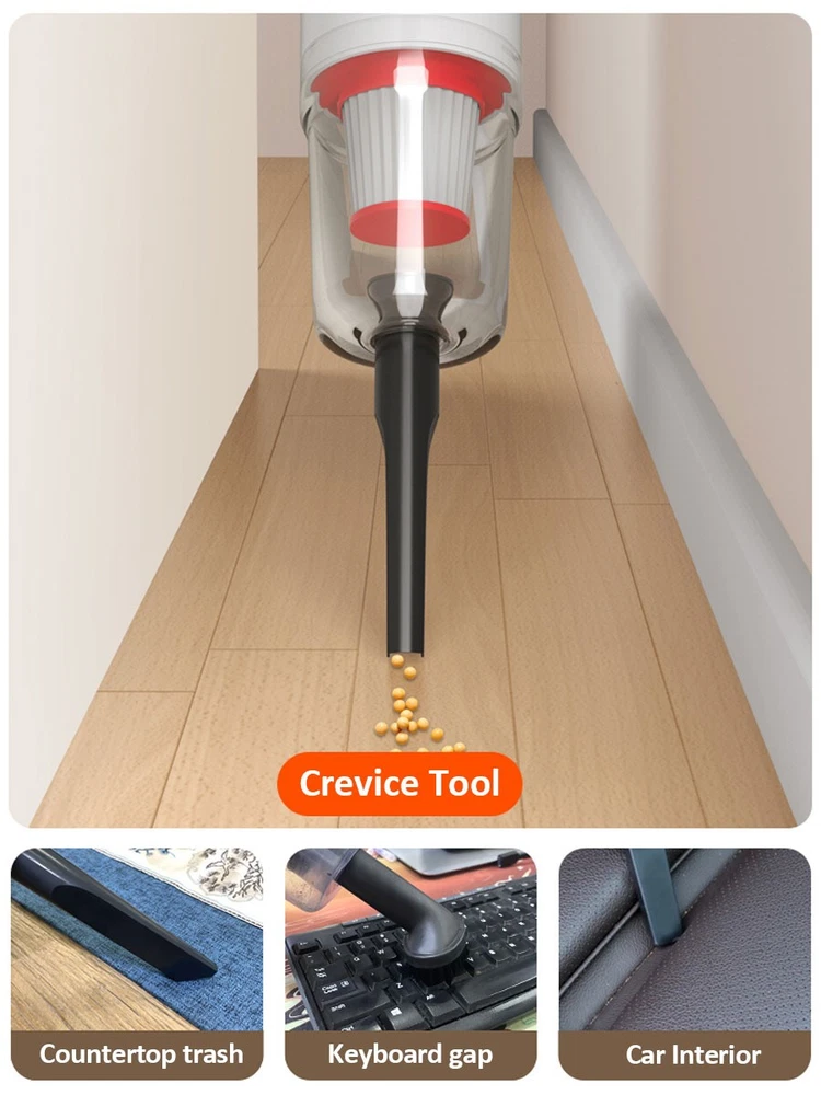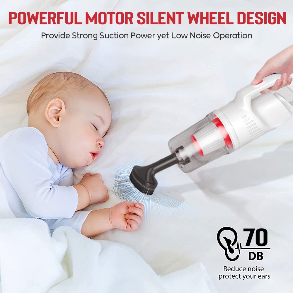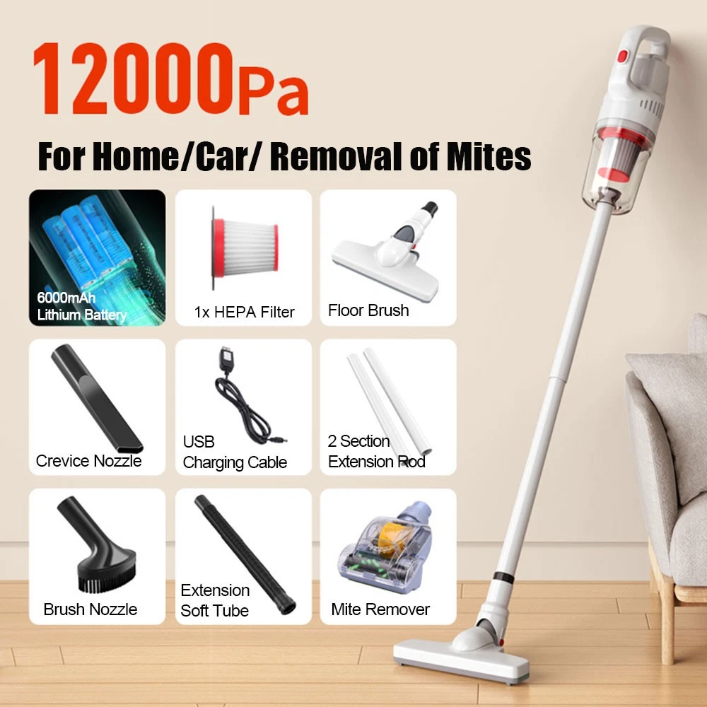 Wireless Vacuum Cleaner 12000Pa Suction Handheld Powerful Vacuum Cleaner Low Noise Multiple Accessories to Meet Your Needs Function : 1. A variety of accessories, suitable for a variety of vacuuming scenes 2. Simple and convenient installation 3. About 12000pa suction power, easy to suck away the dirt and dust. 4. Wireless vacuum cleaner 5. Low noise Specificati ons : Net weight: 1000g or 2.2lb Gross weight:1475g or 3.25lb Rated voltage:12V Vacuum degree: about 12000pa Rated speed: 35500rpm Battery capacity: 6000mAh Charging method: USB Rated power: 120W Noise: ≤70dB Operating temperature: -20℃~+50℃ Battery life: about 30 minutes Pack a ge list: 1 x Vacuum cleaner 2 x Connecting pipe 1 x Floor brush 1 x Brush 1 x Extension hose 1 x Lo-ng mouth 1 x Charging cable 1 x Manual Please Kindly N otice : 1.Please allow 1-3 cm difference due to manual measurement and 3-5 g for the difference between different colors. 2.Due the screen difference, the color may be a little difference from what you expect, please allow it. 3.Please leave 5-star feedback if you're satisfied with our products and service, we will appreciate it(Item as Described 5 stars, Communication 5 stars, Shipping time 5-stars). 4. If the products you received was damaged or wrong styles, please don't leave any negative feedback first, please contact messages, we will deal with it and work out the best solutions, your satisfaction is our motivation to do better. Wireless Vac uum Cl eaner Can handheld/Push rod seal Wireless aspiration-Release of interior space Wireless to flow is not blocked, strong aspiration skills easy clean household =========================================================================================== F eatures : [Vacuum + Cleaning 2-in-1 Design] Simultaneous Vacuuming and Cleaning: The floor brush features a micro-water seepage system, saving up to 70% of housework time. [Strong suction] 12kpa, bag less cleaner with cordless; The advanced Double Swirl filtration system can effectively remove the dust of the engine, maintain the suction of 12kPa, prolong the service life of the engine and thoroughly clean it at the same time.