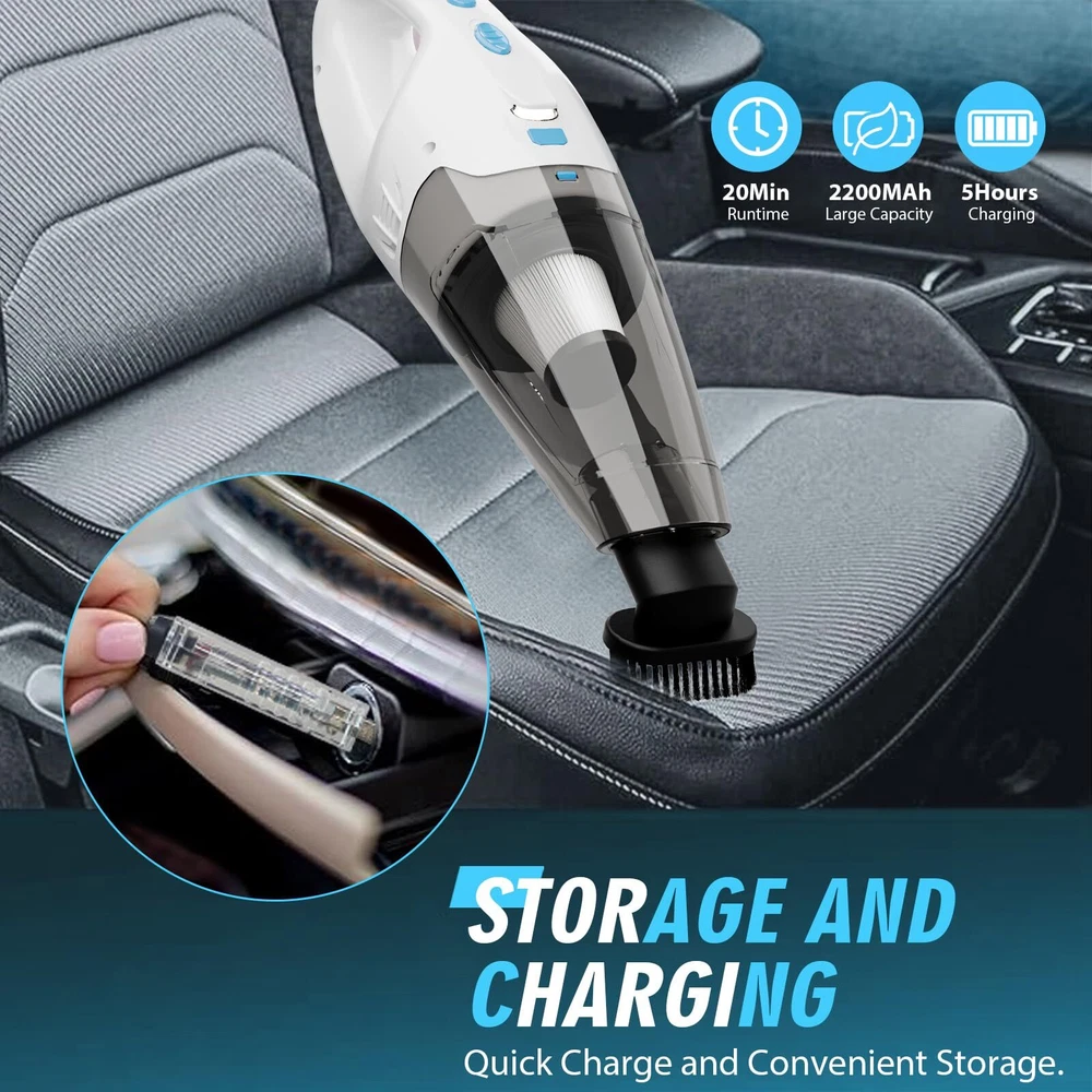 【Powerful Suction and LED Light】The car hand vacuum has 6kpa suction power to help you deal with a variety of dirt such as small debris, hair and food residue. The powerful motor can help you to do all-around cleaning. The bright LED light makes the hand vacuum cordless rechargeable easy to clean in dark areas, perfect for cleaning your car at night. Exquisite workmanship provide an unparalleled experience to you. 【Multi-functional Attachment】The portable car vacuum cleaner gives you three cleaning accessories.The hose and transparent clear crevice tool for stairs, corners, car seats and hard-to-reach spaces.The brush can can loosen the hair and dust stuck on the objects for better cleaning and dusting of carpets and sofas.Tip: Comes with usb charging cable (charging head is not included), the USB charging cable will always light up green when fully charged. 【Washable Filter and Long Battery Life】The dust buster hand vacuum can work for up to 20 minutes after a full charge to help you with all aspects of cleaning. The enhanced Hepa filter is designed to prevent clogging of the filter while ensuring perfect suction power. Tip: If the hand vacuum cordless jus accidentally absorb wet objects and water, you need to dry it immediately to avoid damaging the motor. 【Lightweight and Cordless Design】The hand held vacuum cordless cleaner weighs only 1.6 pounds, you can use the handheld vacuum cordless with one hand to finish the cleaning job. The lightweight and cordless design of this handheld vacuum allows you to clean stairs, rooms, cars or hard-to-reach corners anywhere.Its small size makes it easy to find its place in a cabinet, garage, laundry room or any other suitable corner. 【Good Choose and After Service】This cordless handheld vacuum cleaner can be used at home as well as a helper for traveling out. It is also a good present for friends and relatives. If you have any questions about the car vacuums cleaner, please contact us as you please, we will try our best to help you within 24 hours. We always welcome your inquiries and will do our best to help every customer.