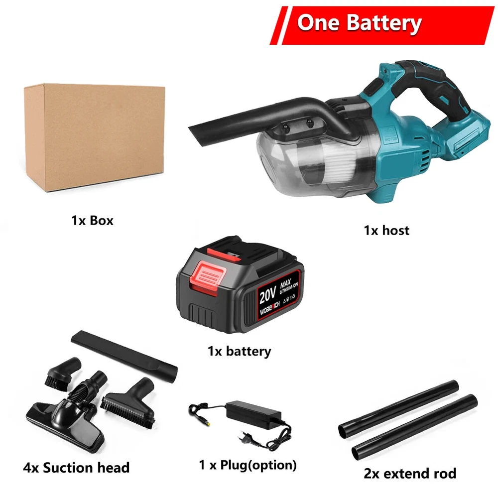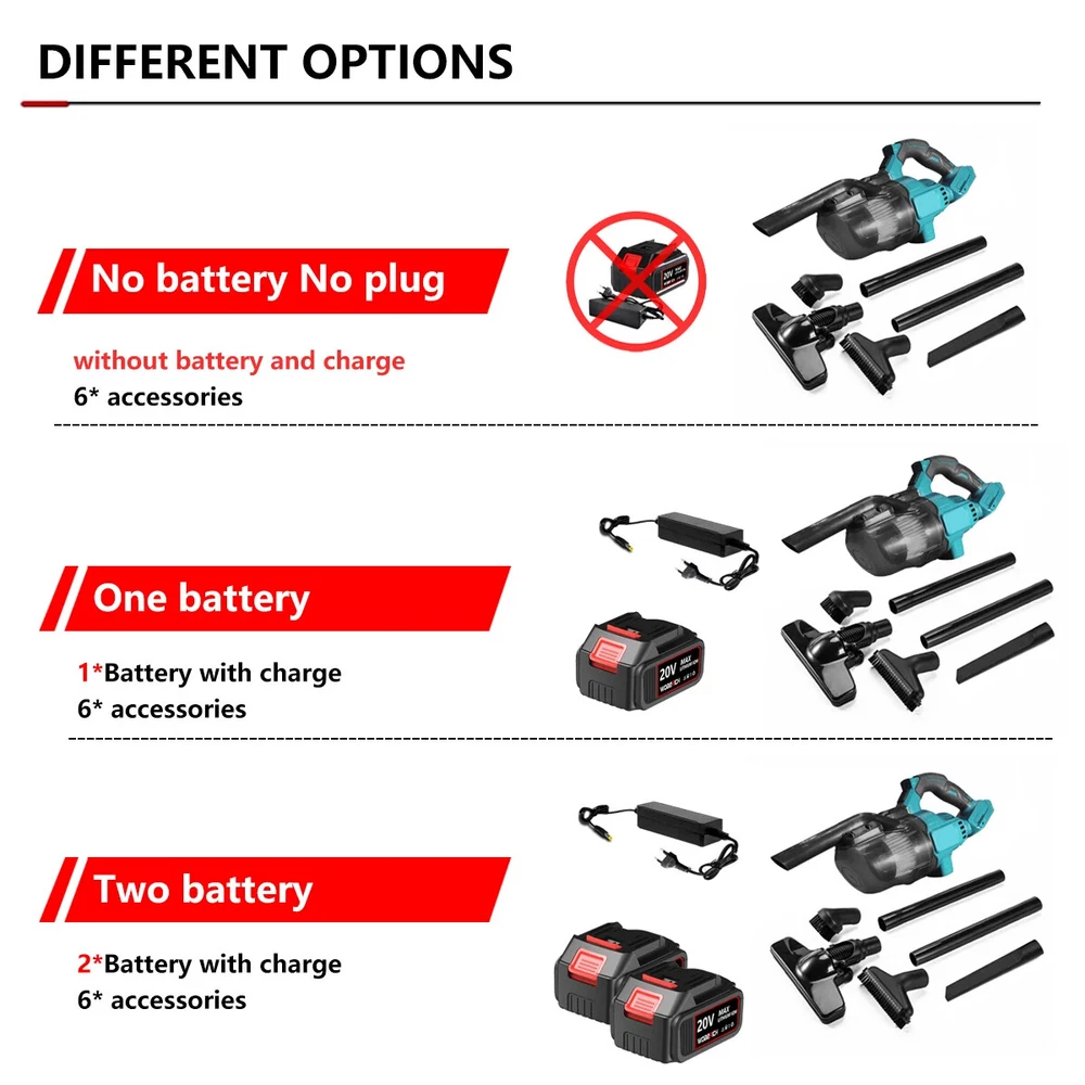 Please note: 1. Some options do not include batteries. please prepare the batteries by yourself. 2.In transit, the carton may be slightly broken or the product will have slight scratches, which is normal. Please do not place an order if you mind. 3.If there are any issues with the received product, please contact us as soon as possible, and we can help you solve the problem.Thank you Package Included:Please pay attention to the images of different options Specifications: Color: Blue Tank Capactity:23.6oz/0.7L Max.airflow rate:0.8m³/min Led Light:yes Bare weight:2.45kg Sound pressure:72-89dB Features: 1.High-horsepower copper core motor provides powerful suction 2.0.7L Tank Capacity allows for maximum debris pick up without the need for regular tank empties Replaceable/Washable Filters guarantees filter can be kept clean and working at full efficiency over longer periods of time 3.Cordless design, ergonomic design and pleasant handle, our vacuum cleaner gives you complete and comfortable mobility. 4.Cyclonic Action ensures debris is directed away from the filter ensuring maximum suction performance is maintained over longer periods of use 5.Easy Clean indoor indoor and outdoor. clean dust/hair waste from bedding, corners, car,bed bottoms, carpets, furniture, etc. Notice: 1.Please allow 1-2cm error due to manual measurement. 2.The colors may have different as the difference display,please understand.