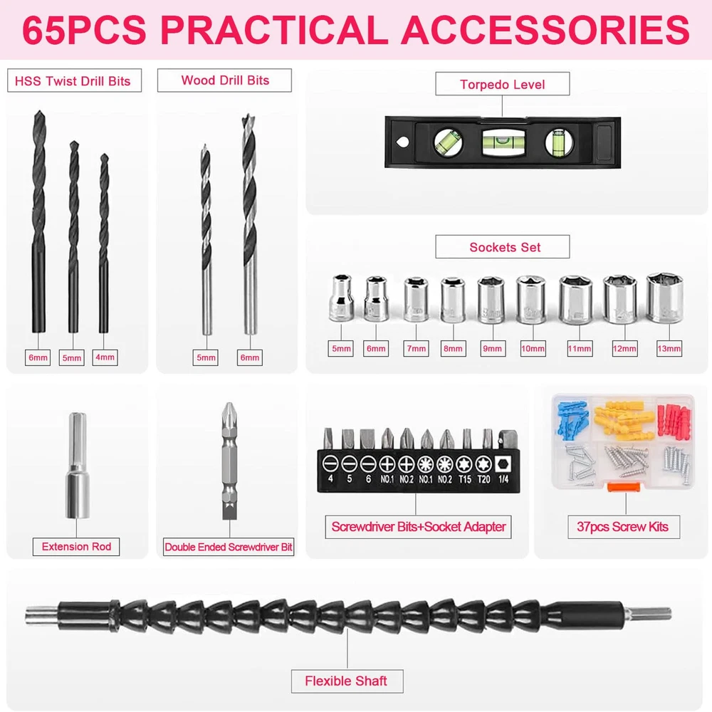 โ ใ๐๐ฑ๐๐๐ฅ๐ฅ๐๐ง๐ญ ๐๐๐ฅ๐ฉ๐๐ซ ๐๐จ๐ซ ๐๐จ๐ฆ๐ ๐๐๐ฉ๐๐ข๐ซ๐ฌใpower drill with superior motor, max torque 180 in-lbs(20N.m), It's perfect for drilling wood, metal, plastics, and all screw driving tasks at home, and many other DIY and craft projects. This drill set is good ideal gift for ourselves, family and friend. โ ใ๐๐๐๐ฎ๐ซ๐๐ญ๐ ๐๐จ๐ง๐ญ๐ซ๐จ๐ฅ ๐๐จ๐ซ ๐๐ฏ๐๐ซ๐ฒ ๐๐ซ๐จ๐ฃ๐๐๐ญใdrill has 24 position clutch and drilling modes, it can provide more precise torque adjustment as required. Cordless power drill also has 2 variable speed setting (0-450 RPM or 0-1500 RPM), so you will always choose right speed you need, meet all jobs your needs. โ ใ๐๐๐๐ข๐๐ข๐๐ง๐๐ฒ ๐๐๐ญ๐ญ๐๐ซ๐ฒ ๐๐จ๐ฐ๐๐ซ๐๐ ๐๐ซ๐ข๐ฅ๐ฅใThis 12-volt drill is equipped with a 1500mAh battery that can provide super battery life. It's durable, you have no worries about running out of power in the middle of a project. The fast charger can fully charge it within 1-2 hours. โ ใ๐๐ข๐ ๐ก๐ญ๐ฐ๐๐ข๐ ๐ก๐ญ, ๐๐จ๐ฆ๐ฉ๐๐๐ญ & ๐๐๐ฌ๐ฒ ๐ญ๐จ ๐๐ฌ๐ใThis portable drill weighs only 2lbs, making it very easy to carry. Women and the elderly can also easily use this power drill for drilling or screwing work. It's equipped soft rubber handle that is both non-slip and gentle to touch, so you can enjoy the whole DIY work time with your family! โ ใ๐๐๐ฐ ๐๐ฉ๐ ๐ซ๐๐๐๐ ๐ ๐๐๐ญ๐ฎ๐ซ๐ ๐๐๐ฌ๐ข๐ ๐งใ1. Built-in LED light for safety and reliability when working in dark or confined areas. 2. Magnetic function, drill can be adsorbed screws, speed up your work efficiency. 3. Flexible shaft helps you to drill the places that are difficult to reach. 4. Torpedo level helps you adjustments and calibration. โ ใ๐๐ฎ๐ซ ๐๐ซ๐ข๐ฅ๐ฅ/๐๐ซ๐ข๐ฏ๐๐ซ ๐๐ข๐ญ ๐๐ง๐๐ฅ๐ฎ๐๐ใ12V Cordless Drill*1, 1.5Ah Battery*1, Fast Charger*1, Drill Bit*5, Screwdriver Bits*9, Socket Adapter*1, Extension Rod*1, Sockets*9, Flexible Shaft*1, Screw Kits*37, Torpedo Level *1, Double Ended Screwdriver Bit*1, User Manual*1 โ ใ๐ ๐ข๐ง๐๐ฌ๐ญ ๐๐ซ๐๐ง๐ ๐๐๐ซ๐ซ๐๐ง๐ญ๐ฒ ๐๐๐ซ๐ฏ๐ข๐๐ใWe support 1-year machine to ensure you have the best experience, just buy with confidence. If you have any issues when using the cordless drill, please us, we will give you a satisfactory solution.