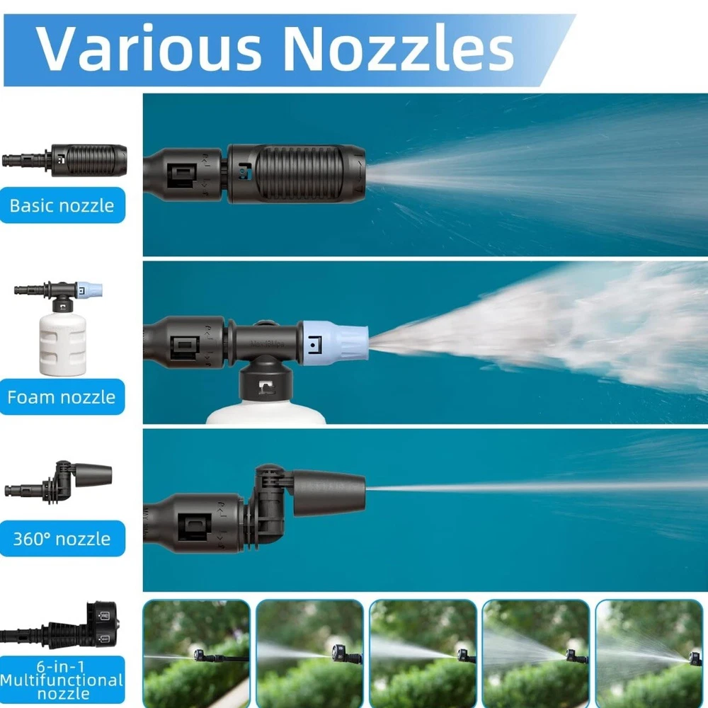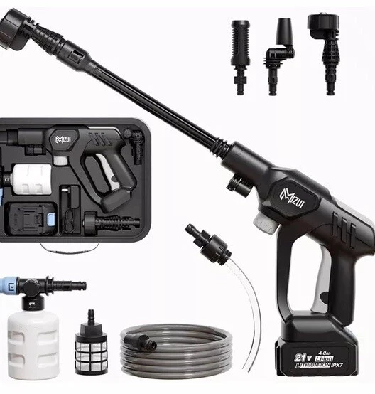 Get your outdoor cleaning tasks done with ease using this cordless portable high pressure spray water gun. This powerful motor gun offers a shooting range of 4-6m and can generate a maximum pressure of 725 psi, making it perfect for cleaning your car, garden, and outdoor areas. The gun comes with a 5-meter water inlet hose, on-board accessory storage, and a quick connect feature for added convenience. Other features of this high pressure water spray gun include a powerful motor, different water spray modes, a telescopic handle, and a 6 IN 1 adjustable nozzle. It has a compact design, is lightweight, and comes with a rechargeable battery that lasts up to 45 minutes. The gun also has a soap tank, water inlet filter, and is made of durable ABS, plastic, and PVC materials.