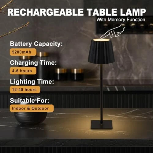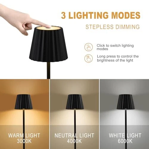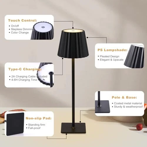 Menu 1. We require immediate payment. 2. We currently accept payment via eBay managed payments only. 3. Once payment is cleared, we will dispatch your shipment within 1-3 business days. Please refer to the "Shipping" tab for more information regarding shipping speed to your destination. Cordless Rechargeable Table Lamp,2.5W/250lm/3.7V/5200mAh,3CCT Dimmable Desk Lamp,Touch Control Cordless Lamp,5V/2A Type-C Rechargeable Lamp,IP54 Waterproof Battery Operated Lamp (Black -1P) Product description 【High Capacity Battery】With a built-in 5200mAh battery, this small lamp can illuminate for 12-40 hours and can be fully charged in 4-6 hours using the included 2A type-C cable.Make sure your charger has a current output not less than 2A, otherwise the charging time can be longer.The light inside lamp turns red when in charge and green when fully charged. 【FCC & CE Certified】FCC & CE certified,this battery lamp can be used as an emergency light in power outage.Cordless design and moderate size make it an ideal portable lamp for restaurant,indoor & outdoor applications. 【Overcharge & overdischarge Protection】Designed electronically against overcharge and over-discharge,this battery operated light can work stably throughout its life.When not in use for a long time, this cordless lamp will go into dormancy and may need several charging cycles to recover the battery.Extreme low temperature may reduce the battery capacity. 【3 Color Stepless Dimming】This cordless rechargeable table lamp is 3 light color (3000K/4000K/6000K)adjustable and 10-100% dimmable.All adjustments are realized by the touch switch on top of this battery lamp for home cordless.With IP54 waterproof protection,it can be used extensively for outdoor scenarios. 【Memory Function】This table light can memorize the brightness for each lighting mode and automatically return to this brightness when you switch back to this mode.A convenient feature that saves you time for readjustment every time you turn on this outdoor lamp. 【After-sale Service】We provide 180 days free replacement service for this portable lamp to meet your expectation.If your rechargeable desk lamp has any defects during this period,please contact us via (Log into your amazon account and find the order,then contact the seller by writing message)and we will help you troubleshoot or send you a new product. PLEASE MESSAGE US IF YOU HAVE ANY OTHER QUESTIONS, AND MANY THANKS FOR READING ALL OF THIS. Copyright ©#. All Rights Reserved.