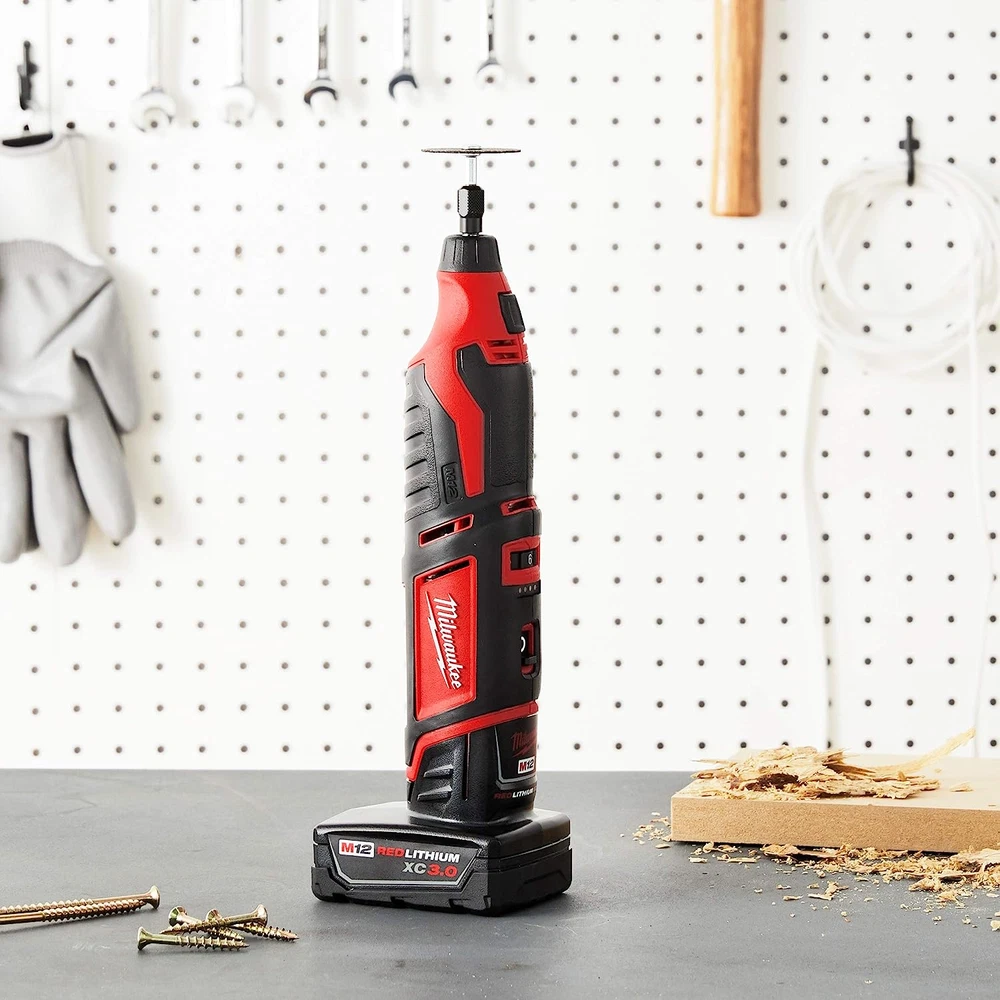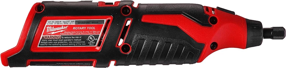 Power Tools and Accessories Country of manufacture: China Manufacturer: Milwaukee Powerful Motor - Unmatched performance under load 1/8-inch Collet - Compatible with all current rotary tool accessories Variable Speed (5,000-32,000) - Up to 10-percent faster than the competition Compact and Lightweight - Only 9.5-inch long and 1.3-pounds Milwaukee Durability – Grinder style exhaust ports and protected front bearing deliver up to 10X the tool life Product Description Cordless Rotary Tool, Bare Tool, Voltage 12.0, Collet Capacity 1/8 In., 5000 to 32, 000 No Load RPM, Cordless Tool Battery Type Li-Ion, Battery Capacity 1.5Ah, Battery Included No, Battery Pack Replacement G3394151, Light LED, Switch Type Slide On Off w/ Speed Dial, Tool Weight 1.3 lb., Tool Length 9-1/2 In., Handle Design Ergonomic, Features Powerful Motor, Variable Speed, Compact/Lightweight, LED Light, Includes Wrench, (5) Cutting Wheel, Mandrel From the Manufacturer Milwaukee Electric Tool has developed a new breed of rotary tool by leveraging its heritage in straight and die grinders. The M12 Cordless LITHIUM-ION Rotary Tool utilizes a powerful 12V motor and Milwaukee's REDLITHIUM Battery technology to produce unmatched performance and increased run-time. The size and versatility of the M12 Cordless LITHIUM-ION Rotary Tool make it an indispensable tool for Maintenance Contractors, Electricians, Plumbers, Remodelers and more. The tool runs from 5,000-32,000 RPM and is managed by a variable speed dial for fluid control. The collet is completely compatible with all 1/32-inch -1/8-inch shank accessories providing the user access to thousands of cutting, grinding, sanding and polishing solutions