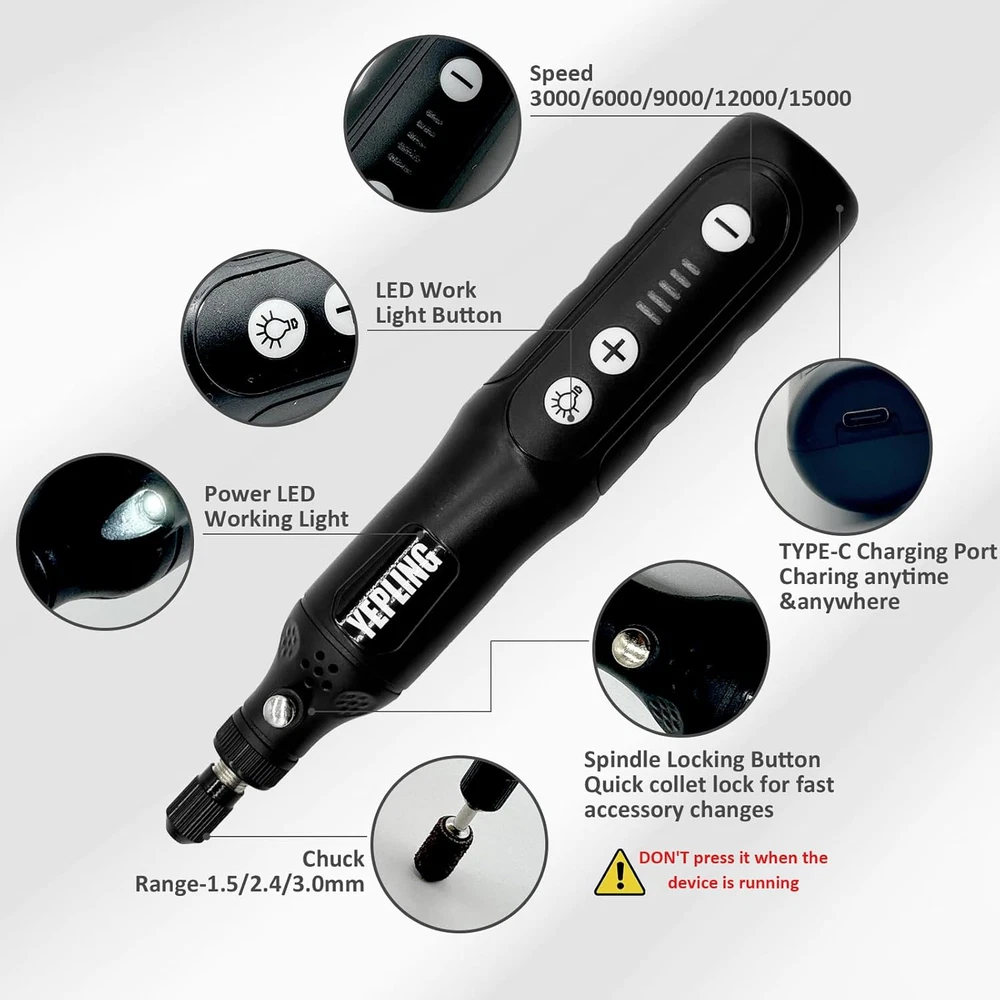 【FRONT LED WORK LIGHTS】Brand new design LED work lights illuminates dark working spaces, allows to easily see whatever you are working on. Help you work better and comfortable. 【5 SPEEDS FOR VERSATILE PROJECTS】There are 5 speeds adjustable (3,000rpm, 6,000rpm, 9,000rmp, 12,000rmp and 15,000rpm) to meet different operational needs, allowing you to easily complete light work such as buffing, cleaning, carving, and nail grooming. 【USB CONNECTOR FOR CONVENIENT CHARGE】2000mAh large-capacity power battery. Charging 2 hours for continuous work 120 minutes, 3.7 V rechargeable lithium battery for safe operation and long using life.(Fully charge the tool before first use) 【DIVERSITY ROTARY TOOL ACCESSORIES】This rotary tool kit includes a high-performance, low-noise rotary tool, as well as 72 of the most popular electric rotary tool accessories, such as sanding belts, grinding wheels, diamond bits, and more. 【ATTENTION】Different tool accessories fit different collets. If the tool accessories come off easily from the head of rotary tool, please replace a new collet to fit it. Product Description