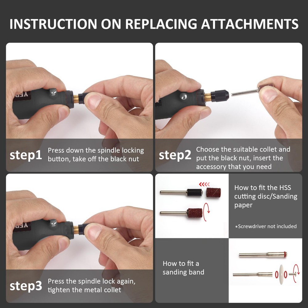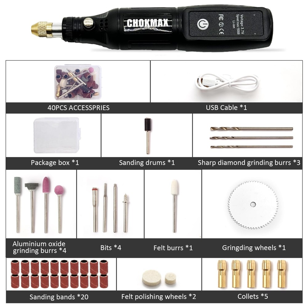 Technical specifications: Collet size: Φ3mm voltage: 3.7V Speed: 16000RPM Charging time: 2 hours Battery : lithium-ion, built-in Charger Voltage: 5V DC(USB) What's in the : 3.7V lithium-ion cordless drill / driver 1x user manual 1x USB connector 1x 42pcs kit Note: - It is recommended to check the power before this , and keep working at full power to avoid low battery during the work. - It is not recommended to operate heavy duty work. The cordless rotary tool perfect for DIY and small jobs, such as simple sanding, polishing, etc. 16000RPM SPEED ROTARY - Equipped with a speed model 16000rpm allows for safe and careful sanding in stages, even for beginners who can easily control the speed, convenient for creations, suit different DIY work situations. DIVERSITY ROTARY TOOL - With 42pcs kit including 20pcs sanding bands that can be used to do various types of home projects and crafting jobs such as sanding, grinding, carving, polishing and more. USB CONNECTOR FOR CONVENIENT CHARGE - Charging 2 hours for continuous work 90 mins, 3.7 V rechargeable lithium battery for safe operation and long life. COMPACT AND LIGHTWEIGHT - Powerful but small and light, just like holding a pen while in use, for ultimate control and precision as well as for comfort. QUIET - Compact motor is perfect for home use, more comfortable in your hand while the tool. ATTENTION - Different tool fit different collets. If the tool come off easily from the head of rotary tool, please replace a new collet to fit it.