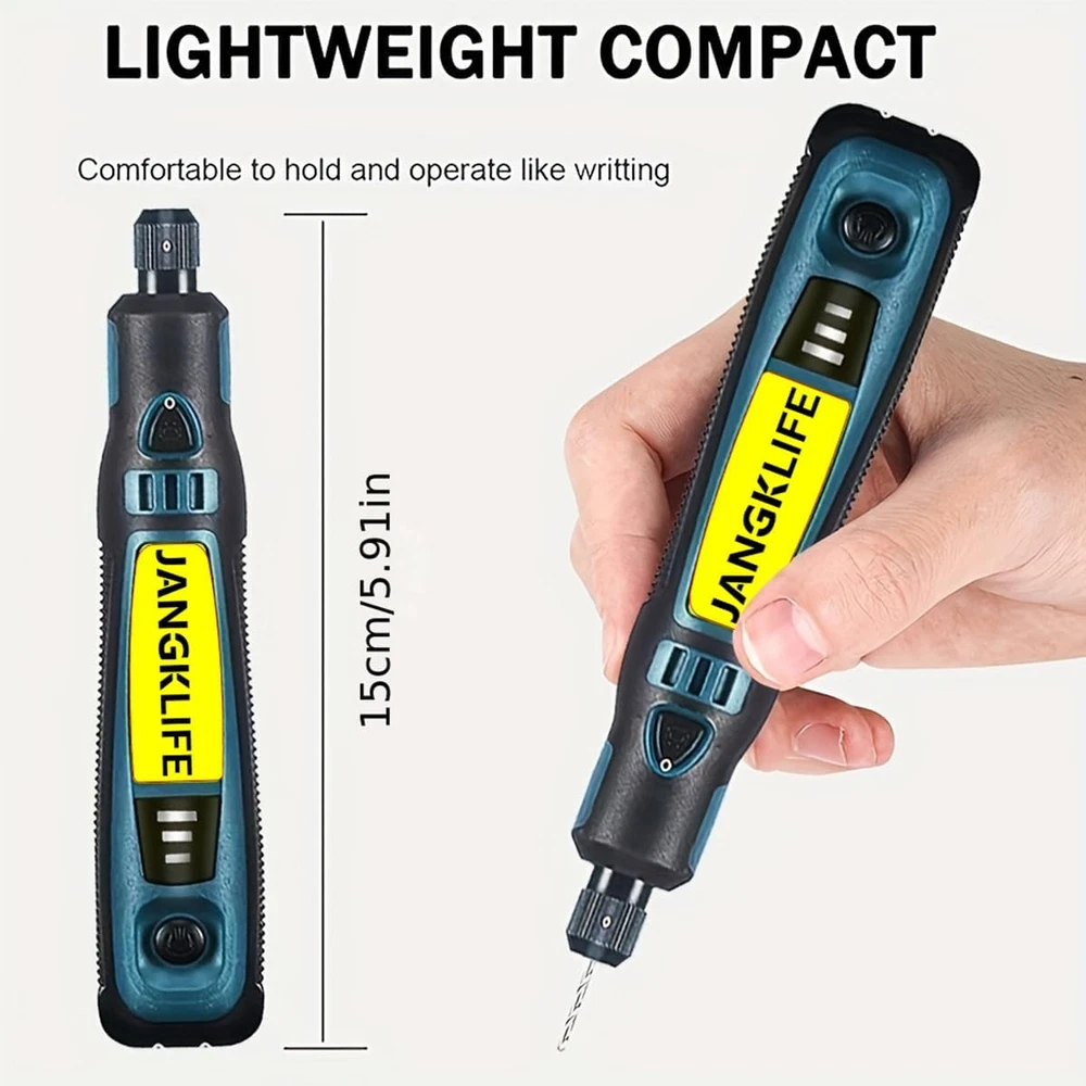 【Multi-Function Rotary Tool Set】Our product features a high-performance rotary tool with 41 multi-function accessories. Suitable for fine work such as nail polishing and polishing, engraving, cutting, punching or DIY making tasks 【3-speed adjustable】Our products have 3-speed adjustable speed (5000/10000/15000RPM) to meet the power needs of different materials and tasks, and overload protection can make the work safer and more reliable, providing you with high-quality work environment. The small electric rotary tool is easy for beginners to use without any burden. 【Lightweight and Convenient】It is powerful but small and light, just like holding a pen when using it, making the operation more convenient, reducing fatigue during work, and bringing comfortable and precise operation. 【Longer Run Time & Fast USB Charging】Can be used multiple times on a single charge, our product is equipped with a 3.6V rechargeable battery to meet your daily work tasks. (Avoid charging for too long or overloading the work) 【Spindle lock】: The onboard spindle lock can quickly and easily replace the drill bit, and is strong and not easy to fall off, meeting the needs of different work tasks and making the operation more burden-free. Product Description 3-Speed Adjustable/USB Charging