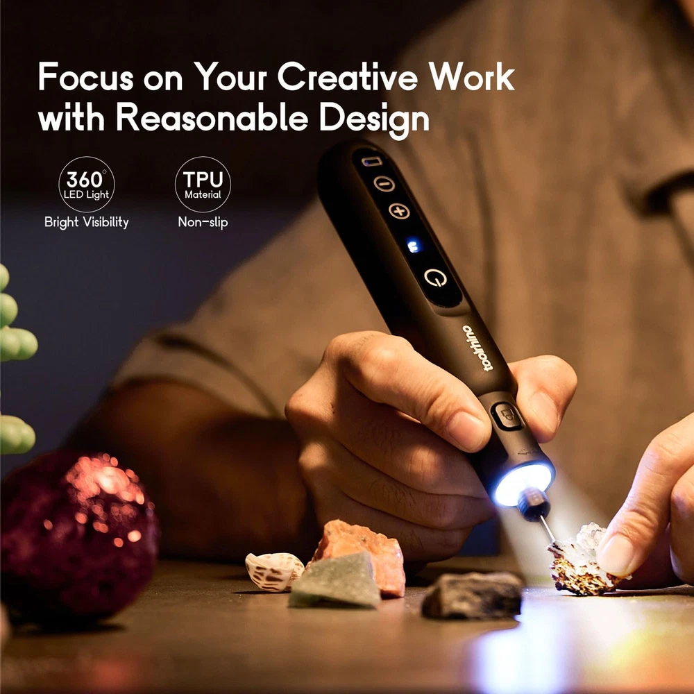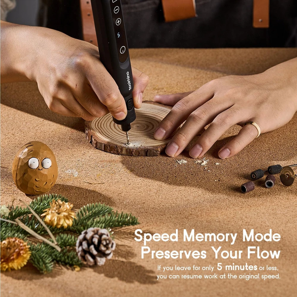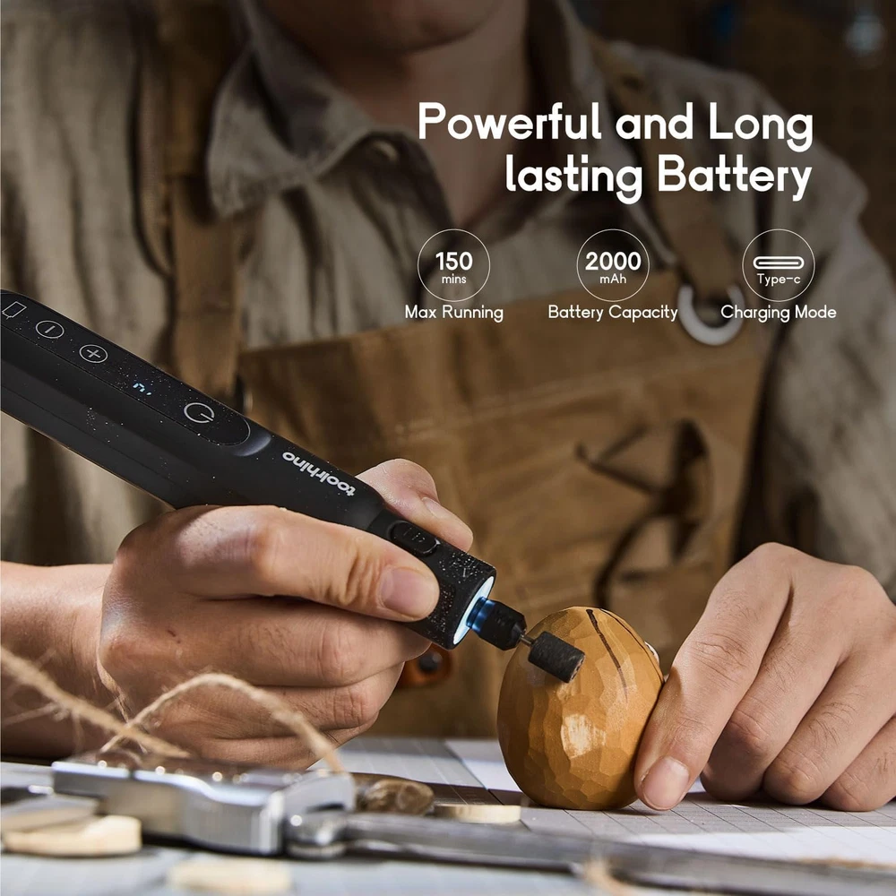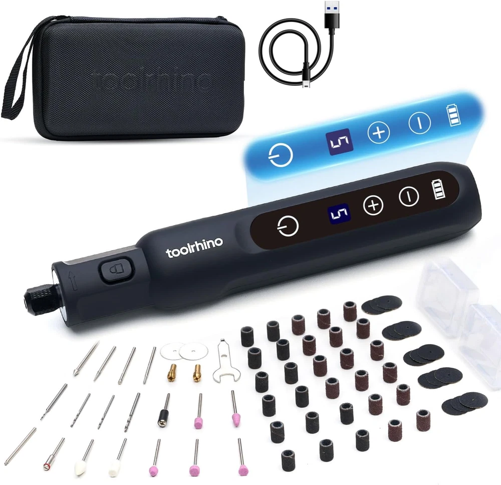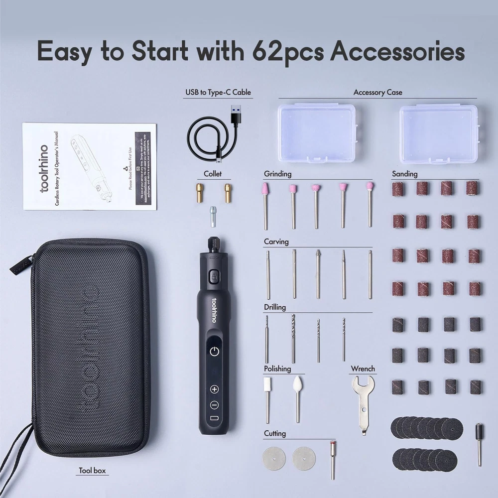 Long Battery Life & Overheat Protection: Equipped with a 2000mAh battery, toolrhino cordless rotary tool kit can run for up to 150 minutes on a single charge. The overheat protection feature ensures a longer motor lifespan. Your copilot for wood carving, dog nail grinding, woodworking, engarving. Speed Memory - Continuous Creation: The speed memory function retains the last used setting if restarted within 5 minutes, preventing interruptions in your work. After 5 minutes, cordless rotary tool kit defaults to the 3rd speed setting. The wood carving tool allows you to immerse yourself in your craft. Easy Precision Control, Pet-Friendly: Low vibration, high concentricity, and minimal noise ensure your dog stays calm during nail grinding. The TPU material and ergonomic design provide a lightweight, non-slip grip for detailed woodworking, maximizing comfort and precious control during long work sessions. Large Display Screen - Easy Operation: Mini rotary tool kit features a large touch display that clearly shows speed settings and battery life, making adjustments straightforward and convenient. Improved with illumination LED design, this upgraded version of the cordless rotary tool helps you see all details clearly. Toolrhino wood carving tool can be charged with Type-c, allowing you to complete charging conveniently and resume work promptly. Versatile Use - Ideal for DIYers: Comes with 62 accessories and variable speeds from 5000 to 20000 RPM, allowing the rotary tool to handle various tasks like cutting, sanding, engraving, drilling and polishing effortlessly. All rotary tool kits are packed in a light carrying bag, toolrhino mini cordless rotary tool will be your good choice! Product Description toolrhino Cordless Rotary Tool Kit The video showcases the product in use. The video guides you through product setup. The video compares multiple products. The video shows the product being unpacked. Create Intently, Your Perfect Copilot 1 Engraving 2 Polishing 3 Cutting 4 Sanding 5 Dog Nail Grinding How to Change Rotary Tool Accessories? The video showcases the product in use. The video guides you through product setup. The video compares multiple products. The video shows the product being unpacked. Easy to Control, Right at Your Fingertips 1 3.7V ROTARY TOOL 2 360° LED LIGHT 3 TYPE-C CHARGING 4 62pcs Accessories Does it come with accessories for different tasks? Yes, toolrhino rotary tool set comes with 62pcs accessories for wood carving, sanding, drilling, polishing, cutting, engraving, and includes a storage bag. Can the battery be replaced or is it built-in? The battery is built-in, but you can charge the cordless rotary tool using the provided Type-C cable. Is the rotary tool kit suitable for beginners? Yes, it's perfect for beginners. The cordless rotary tool includes 62 accessories and a detailed manual. Plus, it has overheat protection to prevent motor damage from improper use. Is the rotary tool kit compatible with other brand's accessories? They are compatible if you use the proper size of collet. Can the rotary tool be used for cutting through metal? We include 2pcs HSS cutting discs in the tool kit, they are suggested to cut wood/plastic/fiberglass/copper/aluminum/thin sheet metal.