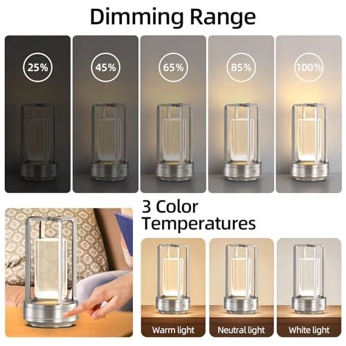 Return Policy Fast Delivery Trusted seller Cordless Table Lamp, 4000mA Battery Operated Lamps for Home Decor,3 Colors Crystal Lantern Lamp, 3-Levels Brightness LED Lights for Living Room/Bedroom/Tabletop/Bar/Café/Camping(Silver) Product Description Outdoor Portable Table Lamp: This wireless lamp is equipped with a 4000mAh rechargeable battery, giving you the flexibility to position it wver you desire. Delight in captivating LED lighting for 8-12 hours, whether you're embarking on outdoor adventures, enhancing your patio atmosp, hosting family gatherings, or enjoying romantic dinners. It effortlessly brightens up your surroundings. Durable Battery-Powered Table Lamp: Easily charge the crystal lamp using the included USB Type-C data cable. Quick charging in 1-2 hours gives you several hours of captivating illumination, ensuring your lamp is always ready for use. Moreover, the battery lasts 8 to 12 hours at full charge, depending on your selected brightness. Wireless Touch Lantern Light: This lamp offers three color temperature options - warm white light, warm light, and white light. You can adjust the brightness from a subtle 5% to a dazzling 100%. The color temperature ranges from 3000K to 6000K, and the touch switch control allows you to switch modes with a single tap and adjust brightness with a long press. Create the perfect ambiance for any occasion. Sophisticated metal table lamp design: Crafted from high-quality aluminum alloy and transparent acrylic, this crystal lantern table lamp features a matte coating for scratch and corrosion resistance. The bottom has an anti-slip design with soft silicone. The detachable cross-frame decoration adds a unique style, suitable for various occasions, whether it's outdoor gatherings or cozy indoor dinners. Its minimalist circular design makes it an ideal gift for loved ones. Customer Satisfaction Guarantee: If you have any questions or concerns after receiving your package, please don't hesitate to contact us. We are committed to providing you with a satisfactory solution and stand behind the quality of our Crystal Lantern Table Lamp. Shipping Returns Payment Shipping Shipping is FREE to all addresses other than APO/PO boxes in the lower 48 states. All our stock ships from US-based warehouses. Shipped via USPS or UPS (depending on location and package weight) Unless stated otherwise, all orders will ship within 24-72 hours of your payment being processed. Check our feedback to see the great reviews of FAST shipping we offer. Returns Seller does not accept returns Payment We currently accept payment via eBay managed payments only. Once payment is cleared, we will dispatch your shipment within 1-3 business days. Please refer to the "Shipping" tab for more information regarding shipping speed to your destination.