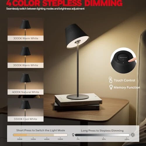 EAN: Does Not Apply MPN: Does Not Apply Item Width: 1 Item Height: 1 Material: Metal Item model number: HWT-M1 Is Cordless: Yes Room Type: Bedroom, Living Room, Dining Room, Kitchen, Kids, Home Office Product Dimensions: 10.6"D x 6"W x 5.3"H Lighting Method: Adjustable Country of Origin: China Control Method: Touch Finish types: Coated Power Source: Battery Powered Light Source Type: LED Item Length: 1 Brand: Does Not Apply Special Feature: Adjustable 4 Color Temperature, Full Spectrum, Cordless Table Lam UPC: Does Not Apply Color: Black Special Features: Adjustable 4 Color Temperature, Full Spectrum, Cordless Table Lam Style: Minimalist Included Components: Lamp Base*1, Desk Lamp Arm*1, User Manual*1, Cordless Table Lamp* Type: Does Not Apply Lamp Type: Table lamp, Desk lamp Manufacturer: Does Not Apply Part Number: HWT-M1 Indoor Outdoor Usage: Outdoor, Indoor Shade Color: black Batteries Included: Yes Batteries Required: Yes Item Weight: 1.7 pounds Date First Available: September 24, 2024 Color Temperature: 5500 Kelvin Switch Type: Touch Finish Type: Coated Batteries: 1 Lithium Ion batteries required. (included) gtin13: Does Not Apply