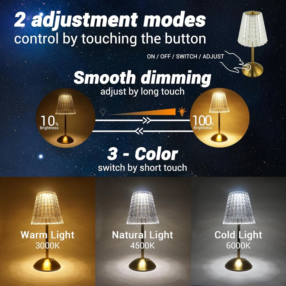 Store New Arrivals Add to Favorite View Feedback Contact Cordless Table Lamp, Rechargeable Battery Operated Lamp, 3 Color Modes & Stepless Dimmable LED Touch Lamp, Portable Crystal Gold Metal beside Lamps for Bedroom Living Room Restaurant Outdoor Description Item model number Golden Fountain Light Source Type LED Style Modern Number of Items 1 Power Source Battery Powered Number of Light Sources 1 Country of Origin China Batteries Included? Yes Lighting Method LED Mounting Type Tabletop Maximum Compatible Wattage 3 Watts Number of Pieces 1 Room Type Entryway, Kitchen, Living Room, Bedroom, Dining Room Lamp Type Table Lamp Bulb Shape Size G30 Switch Type Touch Product Dimensions 5.6"D x 5.6"W x 13"H Material Metal Installation Type Freestanding Controller Type Touch Control Finish Type Polished Specific Uses For Product Reading, Decoration Bulb Features Dimmable, 3 way switching Indoor/Outdoor Usage Indoor Brightness 200 Lumen Control Method Touch Water Resistance Level Not Water Resistant Batteries Required? No Item Weight 1.4 Pounds Connectivity Technology USB Special Features Smoothly Dimmable, Touch control, 3 color modes, Cordless, Rechargeable battery powered Special Feature Smoothly Dimmable, Touch control, 3 color modes, Cordless, Rechargeable battery powered Part Number lampe de table moderne Shade Color Clear Color Temperature 3000 Kelvin Color Gold Fountain Wattage 3 watts Is Cordless? Yes Base Material Metal Bulb Base E26 Medium Batteries 1 Lithium Polymer batteries required. (included) Voltage 5 Volts Recommended Uses For Product Reading, Decoration Shade Material Metal Finish types Polished Included Components Battery, Power Cable Base Diameter 4.3 Inches Size small Portable to Anywhere: This cordless desk lamp is powered by a rechargeable 2000 mAh battery that you can light up anywhere without the cord restricted; When fully charged, the lamp can work for 6 hours, and up to 120 hours(always minimum brightness) Gorgeous Modern Design: The Amingulry 29 cm high charming lamp is a noble and attractive indoor & outdoor decor; Crystal Lampshade is made of great plastic that delivers soft light; The polished gold metal surface makes the whole lamp gorgeous Decorate Different Scenes: This fabulous lamp is a combination of beauty and practicality which is portable to place in your bedroom, dining room, kitchen, or restaurant; The rubber pad on the bottom makes it stable and avoids sliding or scratching Multi-function: 3-color modes (3000 K warm light for bedtime, 4500 K natural light for reading, 6000 K cold light for writing) can be switched by briefly touching the button; You can also adjust the light brightness smoothly by long touching Easy to Use: No need to install bulbs that saves time and money; This lamp can be charged by Type-C USB cable from outlets, laptops, or powerbanks; It can also keep working while charging; This is a great present for its design and functionality Product Description Why should choose this Amingulry Golden Fountain Lamp? Decorate Different Scenes This fabulous lamp makes its surroundings more fashionable, warmer and romantic. This combination of beauty and practicality can be placed in your bedroom, dining room, or kid's room. Restaurants, bars, cafe, or parties are also highly recommended for its eye-catching. 1 Bedroom 2 Reading 3 Restaurant 4 Cafe 5 Picnic Portable to take the lamp anywhere Up to 120 hours of usage! This cordless desk lamp is powered by rechargeable batteries and you can place it anywhere. When fully charged (charging indicator turns green), the 2000 mAh battery can work for 6 hours at full power, and up to 120 hours(on minimum brightness at all times). It can also be used while charging. Gorgeous modern design It's a noble and attractive indoor & outdoor decor day & night. Crystal Lampshade is made of high-quality plastic that delivers soft, steady, high-brightness light to relieve eye strain. The metal surface is polished gold to make the whole lamp gorgeous. Great package We try hard to keep the lamp safe from damage during shipping. Fully surrounded by EPE(expanded polyethylene) is our choice. Easy to use USB port(USB-C cable included) This lamp can be charged by USB-C cable from many types of equipment such as wall outlets, laptops, or powerbanks. Please fully charge before use. 3 color modes switch Easy to use for everyone! Briefly touch the button to switch ON/OFF/3-color modes(3000K Warm Light/4500K Natural Light/6000K Cold Light). Steplessly brightness adjust Sensitive design--Adjust the light's brightness steplessly by long touching. Rubber pad protected We put a rubber pad on the bottom of the lamp to make it stand more stable, prevent sliding, and avoid scratching furniture, tables or floors. cordless, rechargeable, 3 color modes Highly appreciated lamp Size : 11.8 inches height, 5.1 inches diameter Temperature : 3000K warm light for bedtime, 4500K natural light for reading, 6000K cold light for writing Battery : 2000 mAh lithium battery, please charge above 6 hours from empty to full. The USB port cannot charge electronic devices such as phones Package Includes : 1 x LED cordless lamp, 1 x USB charging cable, 1 x User guide Amingulry table lamps Add to Cart Add to Cart Add to Cart Add to Cart Add to Cart Customer Reviews 4.2 out of 5 stars 1,138 4.2 out of 5 stars 176 4.2 out of 5 stars 345 4.2 out of 5 stars 345 4.2 out of 5 stars 345 4.2 out of 5 stars 345 4.2 out of 5 stars 345 Price $19.98 $ 19 . 98 $23.98 $ 23 . 98 $19.99 $ 19 . 99 $36.99 $ 36 . 99 $29.99 $ 29 . 99 $36.99 $ 36 . 99 — Size 5.12" Φ x 11.81" H 4.33" Φ x 4.53" H 5.12" Φ x 12" H 5.12" Φ x 12" H 5.12" Φ x 12" H 5.12" Φ x 12" H 5.12" Φ x 12" H Battery 2000 mAh 2000 mAh 2000 mAh 4000 mAh 4000 mAh 4000 mAh 4000 mAh Cordless ✔ ✔ ✔ ✔ ✔ ✔ ✔ 3 color modes ✔ ✔ ✔ ✔ ✔ ✔ ✔ Touch control ✔ ✔ ✔ ✔ ✔ ✔ ✔ ABOUT US We offer the best prices around on high quality products. Our E-store includes media such as books, mov