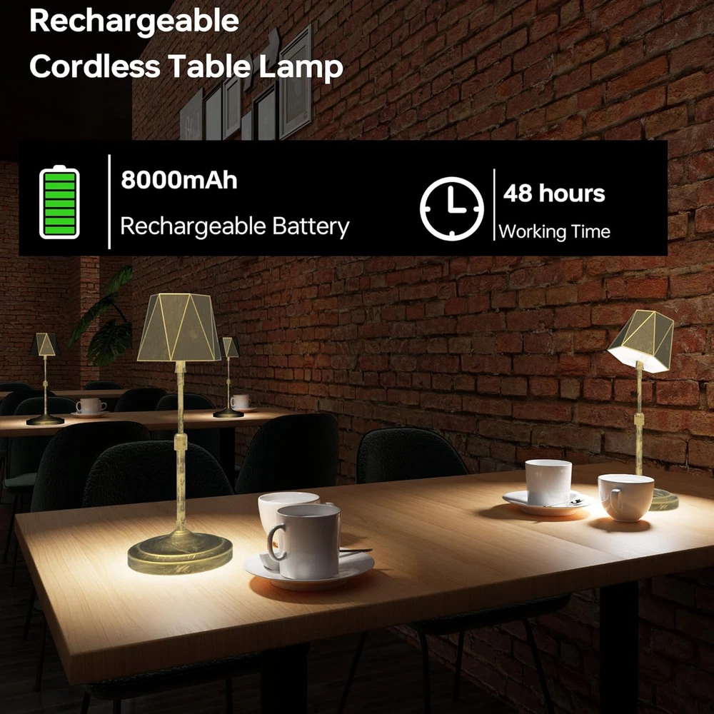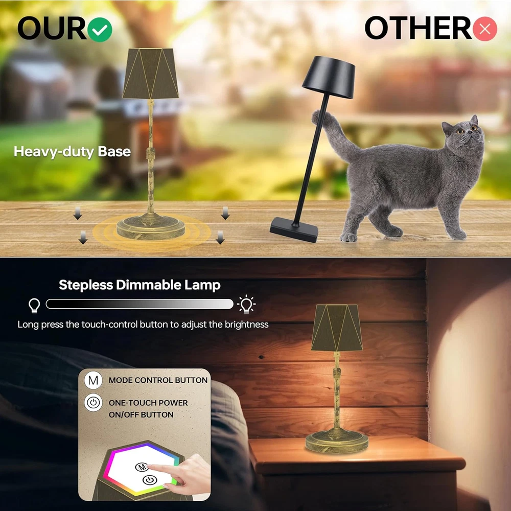 Store New Arrivals Add to Favorite View Feedback Contact Cordless Table Lamp with 8000Mah Rechargeable Battery up to 48 Hours Usage Description Item model number HJF-CTL Light Source Type LED Power Source Battery Powered Material Type Aluminum, Metal, Acrylic Lighting Method Adjustable Finish Types Antique Lamp Type Table Lamp Room Type Dinning Room, Living Room, Bedroom, Outdoor Brand Name Keilefo Product Dimensions 5.9"D x 5.9"W x 17.5"H Model Number HJF-CTL Installation Type Tabletop Additional Features IP54 Waterproof, Dimmable, Weighted Base, Height Adjustable, Cordless Finish Type Antique Specific Uses For Product Bedside Lamp, Reading, Living Room Lamp, Dinning Lamp, Decoration Manufacturer Dongguan Regina Technology Co., Ltd. Is Product Cordless Yes Country of Origin China Water Resistance Level Waterproof Item Weight 3.25 Pounds Connectivity Technology USB Bulb Base Wedge Shade Color Antique Brass Mounting Type Tabletop Color Bronze Item Dimensions D x W x H 5.9"D x 5.9"W x 17.5"H Indoor Outdoor Usage Outdoor, Indoor Base Material Aluminum Is Waterproof IP54 Waterproof, True Batteries 1 Lithium Ion batteries required. (included) Control Method Touch Recommended Uses For Product Reading, Patio Lamp, Dinner Lamp, Cordless Lamp, Decoration Shade Material Aluminum Included Components Power Cable, Shade Style Name Antique Switch Type Touch 【Battery Powered Desk Lamp】Built-in 8000mAh Rechargeable Battery,working for 48 hours after fully charged (depending on the working brightness,59inch Type-C charging cable included). With its Wireless and Batteries Features,It is friendly in INDOOR and OUTDOOR uses,can be used in reading,office,bar,café. Creates a cozy and relaxing atmosphere,ideal for decorating your garden,patio,dining room,living room or bedroom 【5 Modes with Independent Mode and Power Touch Control Sensor】This Table Lamp has 5 Modes:Warm Light,White Light,Warm White Light,RGB,RGB breathing Light Modes. Built in totally 55pcs LED and support mode memory,when turn off the lights, the lamp will memory the previous mode. The brightness of 3 Color Lighting is stepless dimmable. With touch control,change the color modes,brightness or turn on/off by clicking the independent Mode Button or Power Button on the top of the lamp head 【Height & Light Angle Adjustable】The Height is adjustable from 14.1" to 17.6",and the Lamp Head is rotatable that you can change the direction of the light beam to light up different area you need. Therefore,it cannot only be applied to different table,desk,bedside,patio scenarios,but also suitable for men,women,children and kids 【IP54 Waterproof & Outdoor Friendly】: With a high waterproof rating of IP54,this patio lamp outdoor decor can withstand rain,sun,wind,humidity,and extreme outdoor temperatures. Suitable for outdoor camping,family gatherings,dinner party lighting and other places to create a romantic atmosphere 【Aluminum Material and Weighted Base】This Bedside Lamp is made of high-quality Aluminum and Acrylic. Since its weighted base,it is very stable without worrying about it tipping over. A perfect gift choice for Mom,Grandma,Wife,Daughter,Sister,Aunt,Grandma,girlfriend,boyfriend,wife's wedding anniversary,child's birthday,mother's birthday,or Mother's Day,Father's Day,Thanksgiving Day,Valentine's Day and Christmas 【Tips】When not used for a long time, such as within 10 months, it takes several charging cycles to stimulate the battery. Product Description ABOUT US We offer the best prices around on high quality products. Our E-store includes media such as books, movies, music and games while offering electronics, toys, sporting apparel, clothing, tools, general home, garden items and more. SHIPPING We are always working hard to ensure your package arrives as soon as possible. Please understand that some factors like weather, high postal traffic, and the performance of shipping companies are outside of our control. We offer free shipping to the lower 48 states and ship within 2 business days of payment, usually sooner. We do not accept P.O. Boxes. Please provide a physical address. RETURNS We offer a 30-Day Return Policy on items which you are not completely satisfied with. You have the option for a full-refund or an exchange of the item. No returns are available on items shipped outside of the USA. PAYMENT We accept PayPal. CONTACT US This page content is yet to come Please ad us to your favorite seller and visit again later Thank You CUSTOMER SATISFACTION We try our very best to make sure every customer is completely satisfied. If there's a problem, message us! We're happy to help.
