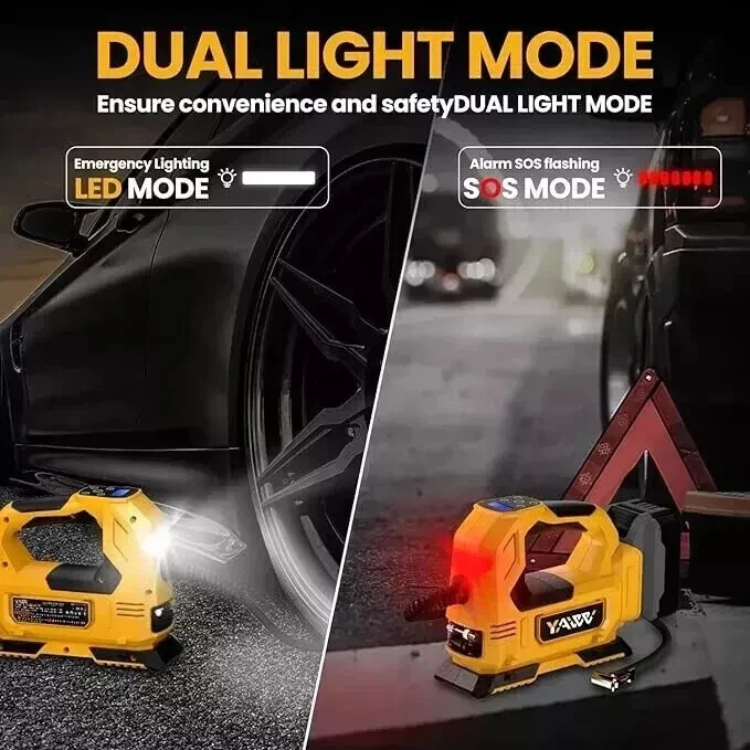About this item Compatible with Dual Power: The YAWV portable air compressor is compatible with De-Walt 20V max Lithium Battery, powerstack battery, suitable for DCB203、DCB204、DCB206 and more. At the same time, our tire inflator comes with an 11FT long 12V car cigarette lighter plug and supports car power supply, which is perfect for use indoors and during travel. 25 Cylinder Powerful and Fast Inflation: The tire inflator is equipped with a high-performance 550 pure copper motor, which outputs strong power and has a stable air flow of 35L/MIN. It can inflate 215/55 R17 car tires from 0 to 36psi in 4 minutes, and it only takes 1 minute to quickly inflate 29-36psi. , return your tires to their best condition in a short time. Please note that after 20 minutes of continuous use, please allow the air compressor to fully rest and cool down before continuing to use it. Automatic inflation with preset tire pressure: No more manually checking tire pressure or worrying about over-inflation. Our air pump is equipped with an advanced sensing chip so that it has an intelligent preset function and can accurately monitor tire pressure with an error of less than 0.5psi. You only need to set the required tire pressure and the air pump will automatically inflate and stop to ensure that the tire pressure reaches the maximum Best level. Digital Display and LED Lighting: The portable tire inflator is equipped with a high-precision, high-brightness display to help you detect tire pressure in real time. And the air compressor pressure gauge has four display modes, which can display pressure in PSI, BAR, KPA and KG/CM². 4 bright LED lights allow you to use it easily even in the dark. Convenient Storage: The tire inflator has an integrated accessory storage compartment and is equipped with different specifications of valves, compatible with SUVs, cars, motorcycles, bicycles and other sports equipment. The pump tube storage slots designed on both sides of the base allow you to store and carry it easily and concisely. This package includes: YAWV air pump, 12V power cord, three nozzles and a user manual.